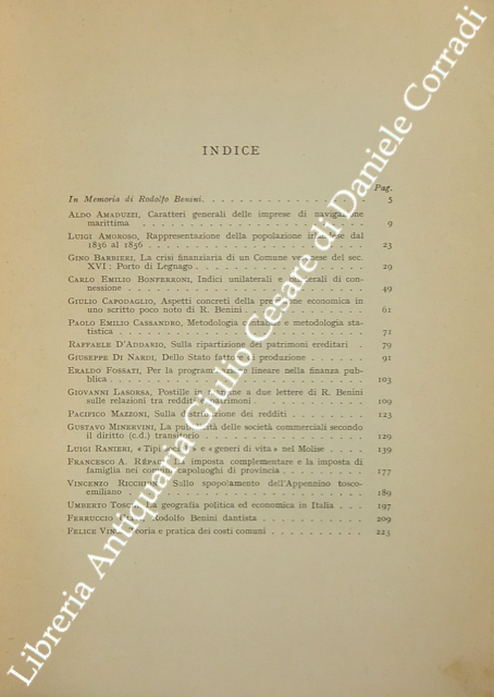 Ritratto di R. Benini all’antiporta. Scritti di: Amaduzzi, Amoroso, Barbieri, Bonferroni, Capodaglio, Cassandro, D’Addario, Di Nardi, Fossati, Lasorsa, Mazzoni, Minervini, Ranieri, Repaci, Ricchioni, Toschi, Ulivi, Vinci.