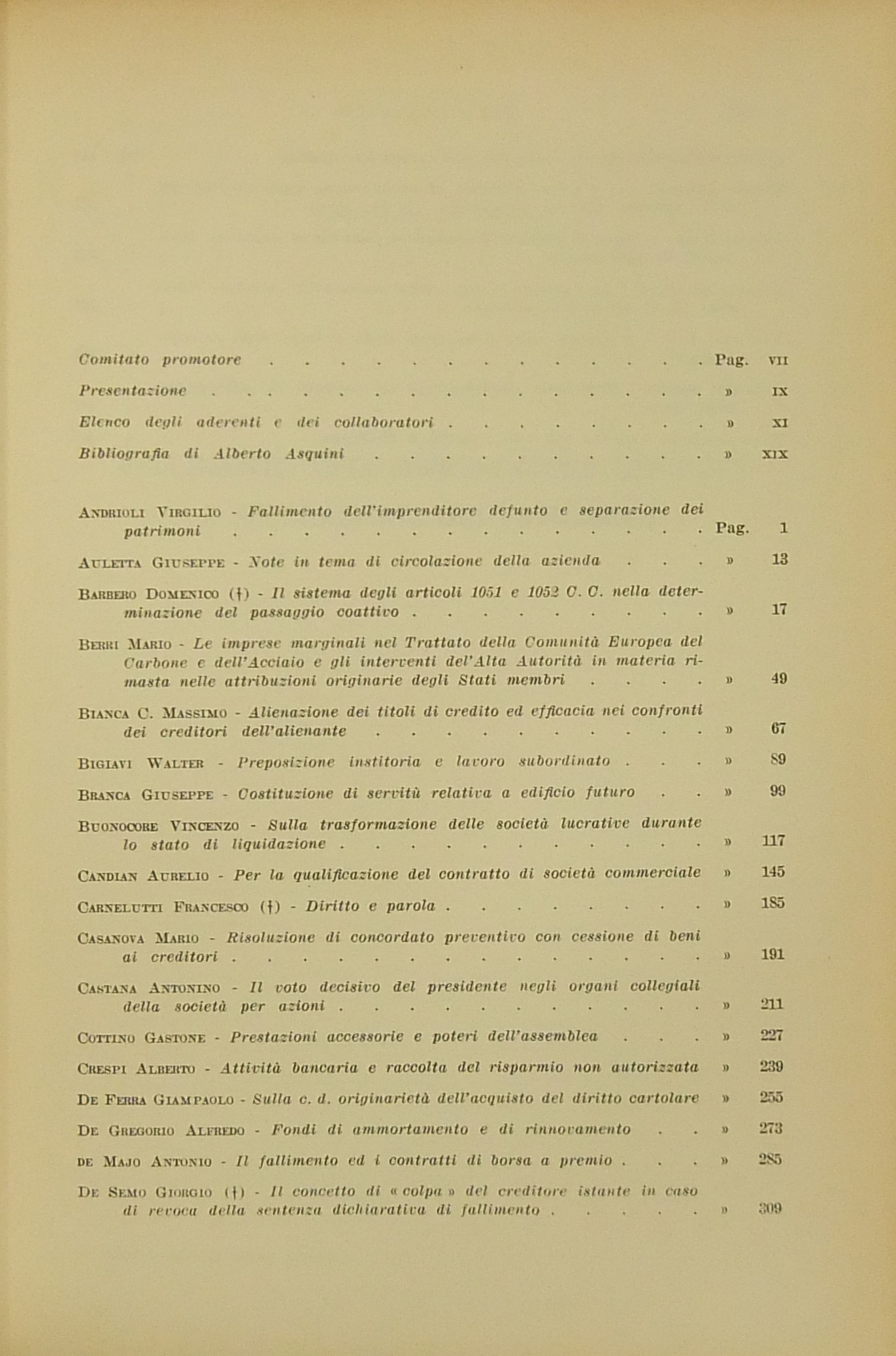 Ritratto fotografico di Asquini in antiporta al volume. Scritti di Andrioli, Auletta, Barbero, Berri, Bianca, Bigiavi, Branca, Buonocore, Candian, Carnelutti, Casanova, Castana, Cottino, Crespi, De Ferra, De Gregorio, De Majo, De Semo, Dominedò, Donati, Fabiani, Fanelli, Fazzalari, Ferrarini, Ferri G.