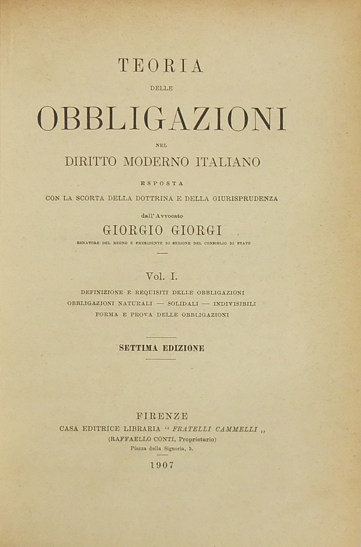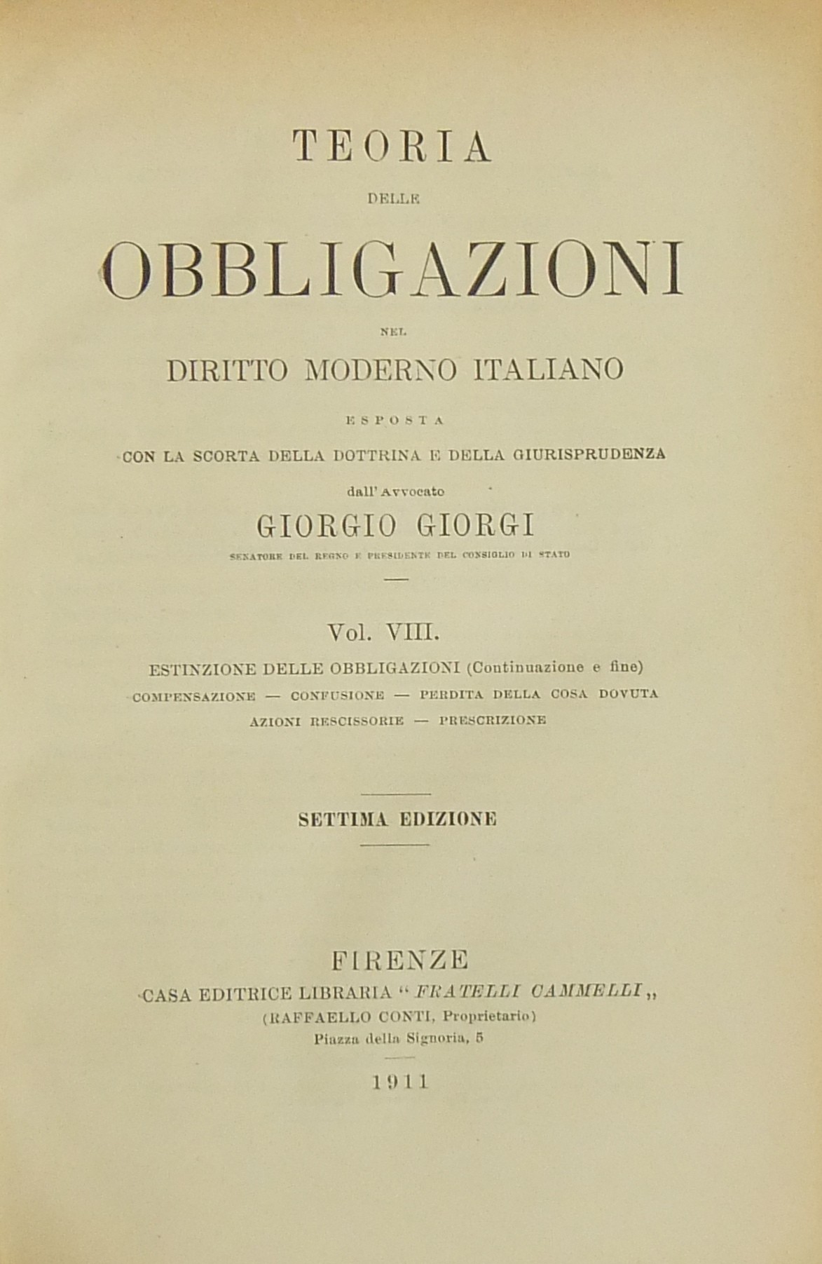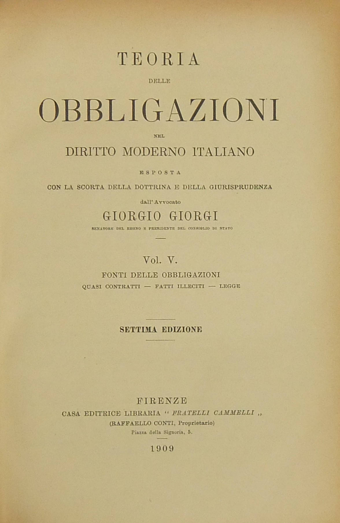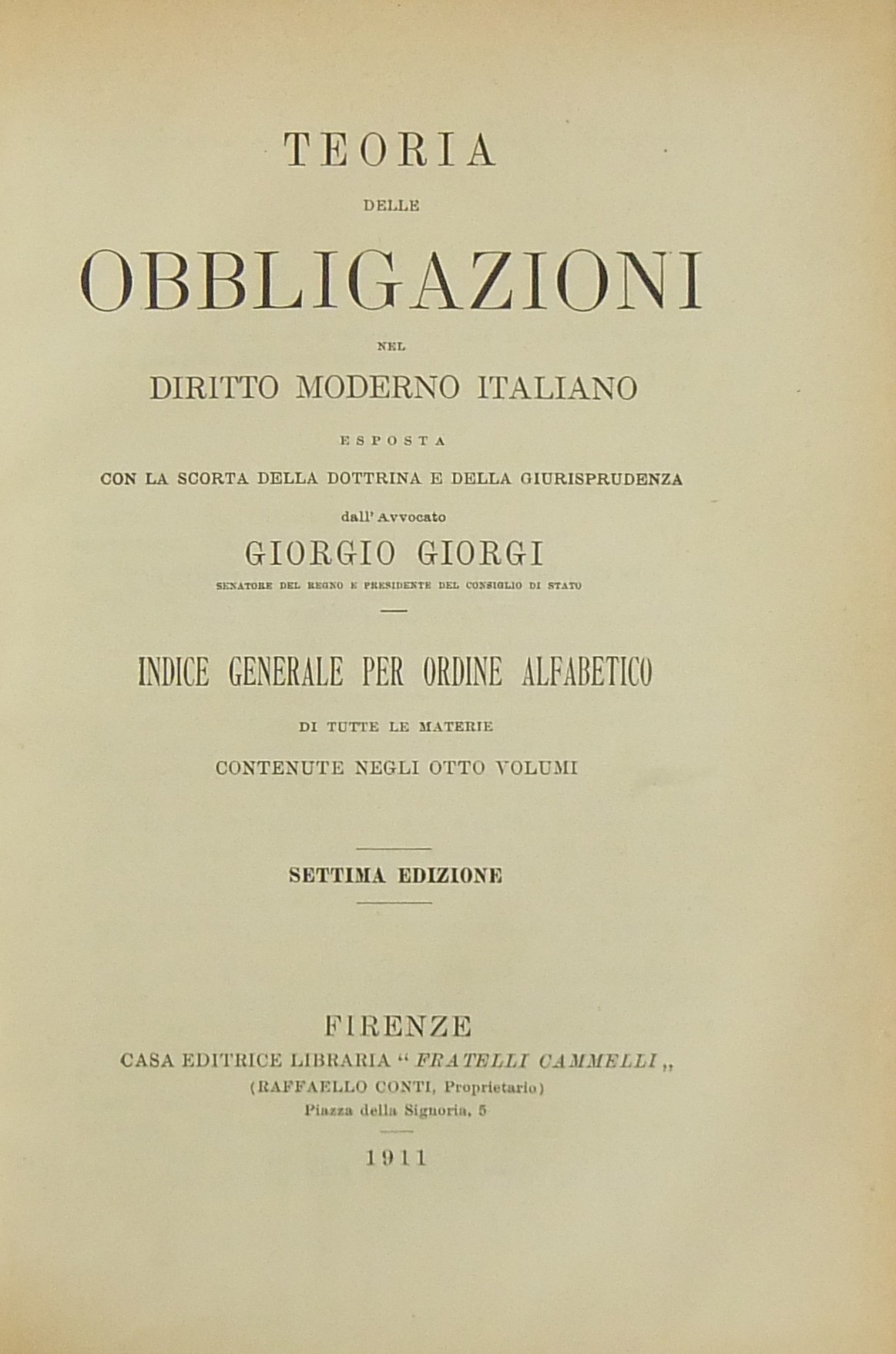Teoria delle obbligazioni nel diritto moderno italiano esposta con la scorta della dottrina e della giurisprudenza. Vol. I - Definizioni e requisiti delle obbligazioni. Obbligazioni naturali solidali indivisibili. Forma e prova delle obbligazioni. Vol. II - Effetti delle obbligazioni. Risarcimento del danno per inadempimento. Rischio e pericolo. Provvedimenti coercitivi. Provvedimenti conservativi. Azione surrogatoria. Azione rivocatoria. Gius di ritenzione. Effetti delle obbligazioni connesse. Vol. III - Fonti delle obbligazioni. Contratti. Vol. IV - Fonti delle obbligazioni. Continuazione e fine dei contratti. Vol. V - Fonti delle obbligazioni. quasi contratti. Fatti illeciti. Legge. Vol. VI - Fonti delle obbligazioni. Obbligazioni nascenti dalla legge (continuazione e fine). Trasmissione delle obbligazioni. Vol. VII - Estinzione delle obbligazioni. Pagamento. Offerta reale. Datio in solutum. Rimessione. Novazione. Vol. VIII - Estinzione delle obbligazioni (continuazione e fine). Compensazione. Confusione. Perdita della cosa dovuta. Azioni rescissorie. Prescrizione. Vol. IX - Indice generale per ordine alfabetico di tutte le materie contenute negli otto volumi