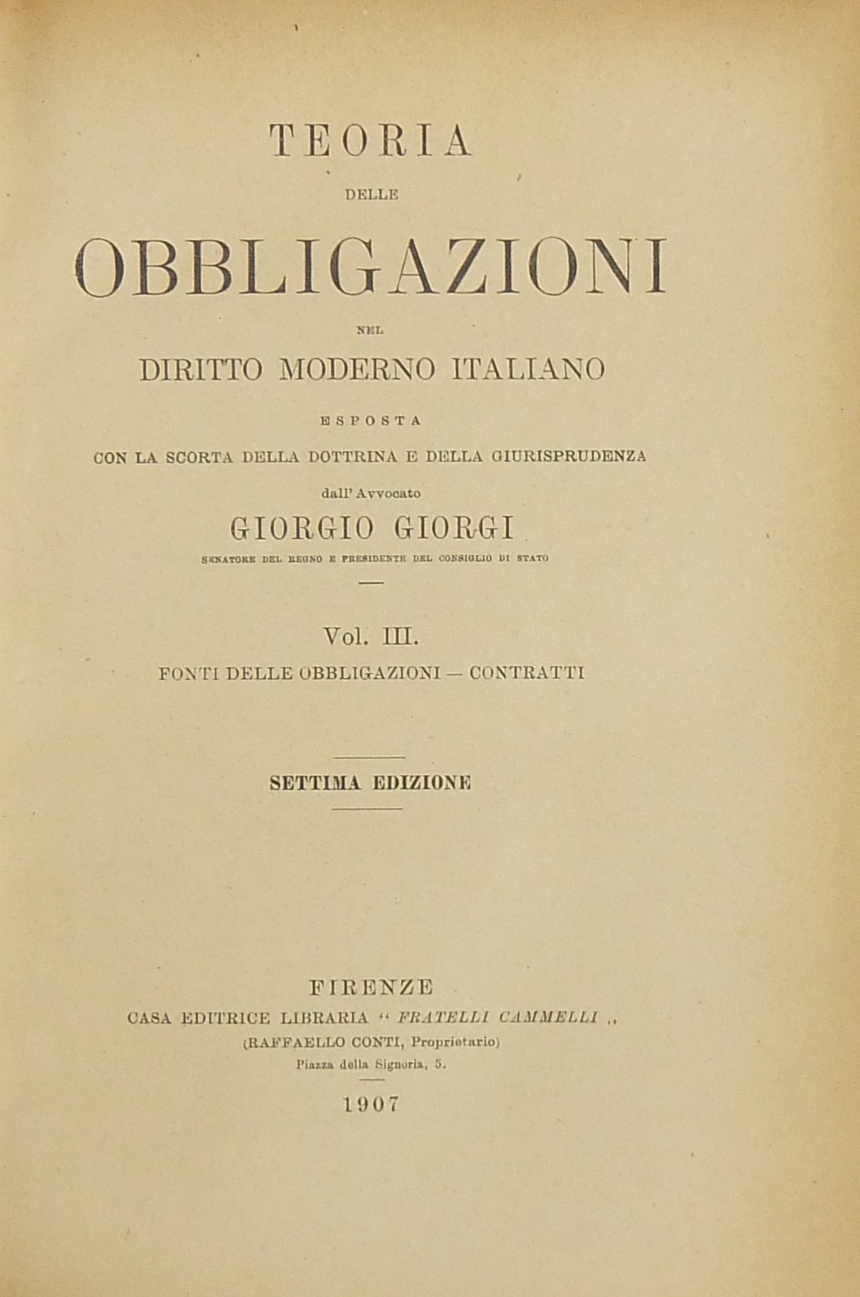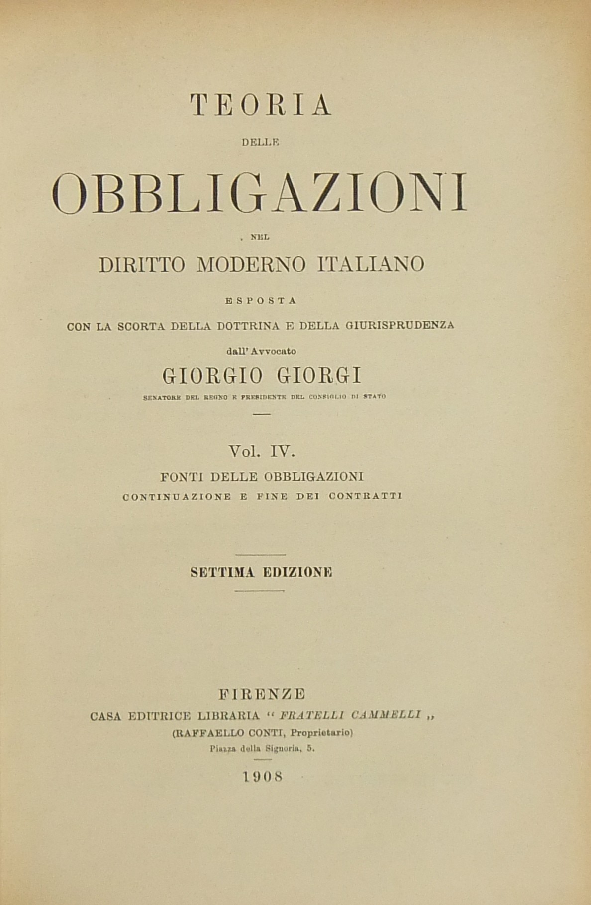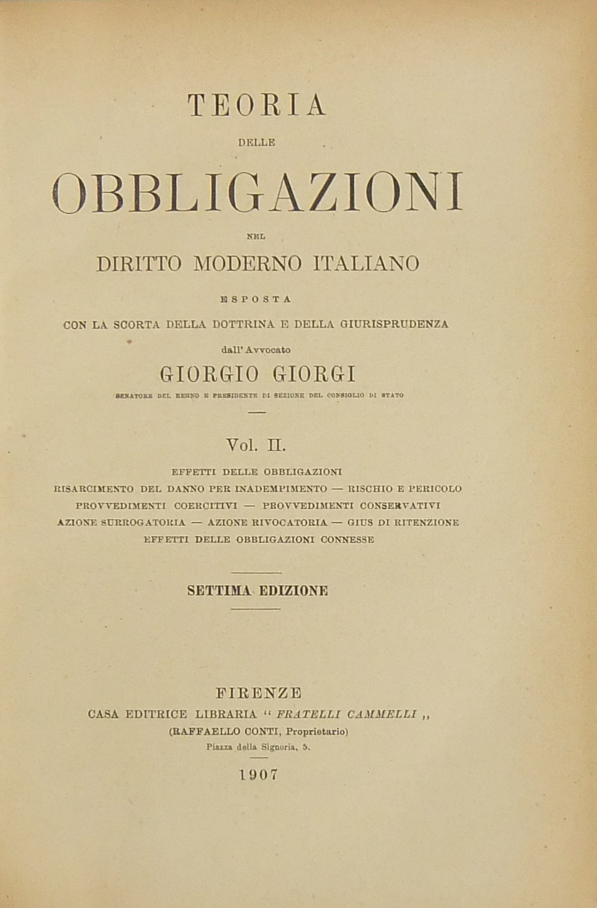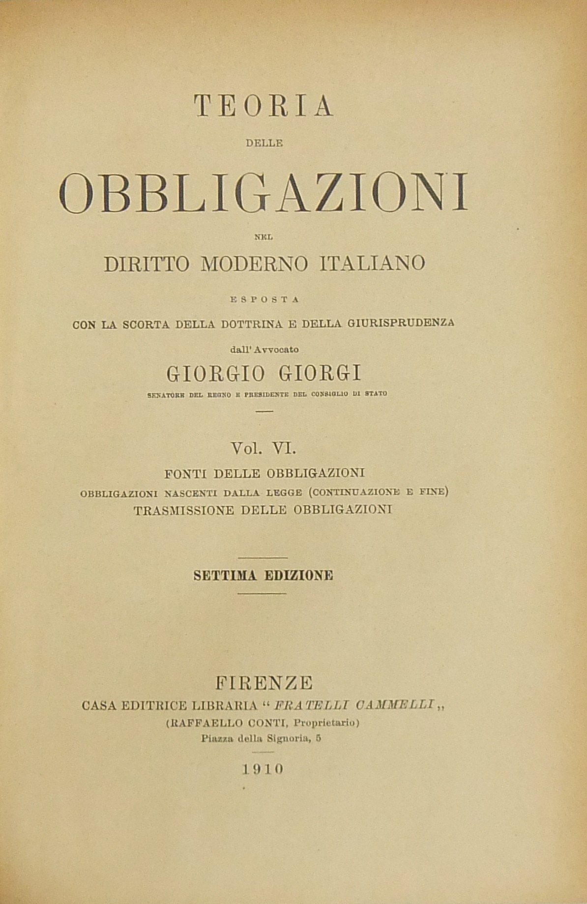 Teoria delle obbligazioni nel diritto moderno italiano esposta con la scorta della dottrina e della giurisprudenza. Vol. I - Definizioni e requisiti delle obbligazioni. Obbligazioni naturali solidali indivisibili. Forma e prova delle obbligazioni. Vol. II - Effetti delle obbligazioni. Risarcimento del danno per inadempimento. Rischio e pericolo. Provvedimenti coercitivi. Provvedimenti conservativi. Azione surrogatoria. Azione rivocatoria. Gius di ritenzione. Effetti delle obbligazioni connesse. Vol. III - Fonti delle obbligazioni. Contratti. Vol. IV - Fonti delle obbligazioni. Continuazione e fine dei contratti. Vol. V - Fonti delle obbligazioni. quasi contratti. Fatti illeciti. Legge. Vol. VI - Fonti delle obbligazioni. Obbligazioni nascenti dalla legge (continuazione e fine). Trasmissione delle obbligazioni. Vol. VII - Estinzione delle obbligazioni. Pagamento. Offerta reale. Datio in solutum. Rimessione. Novazione. Vol. VIII - Estinzione delle obbligazioni (continuazione e fine). Compensazione. Confusione. Perdita della cosa dovuta. Azioni rescissorie. Prescrizione. Vol. IX - Indice generale per ordine alfabetico di tutte le materie contenute negli otto volumi