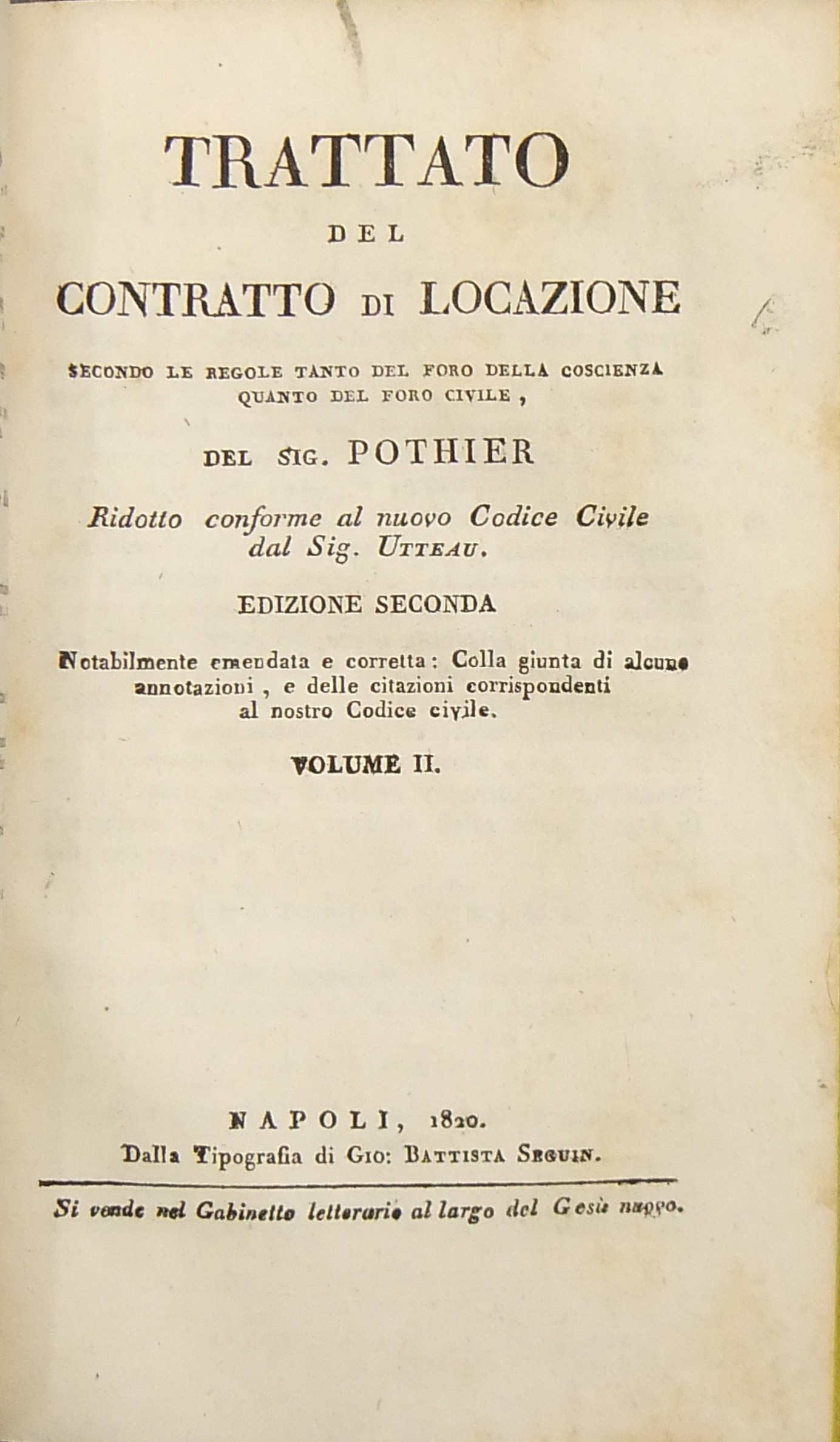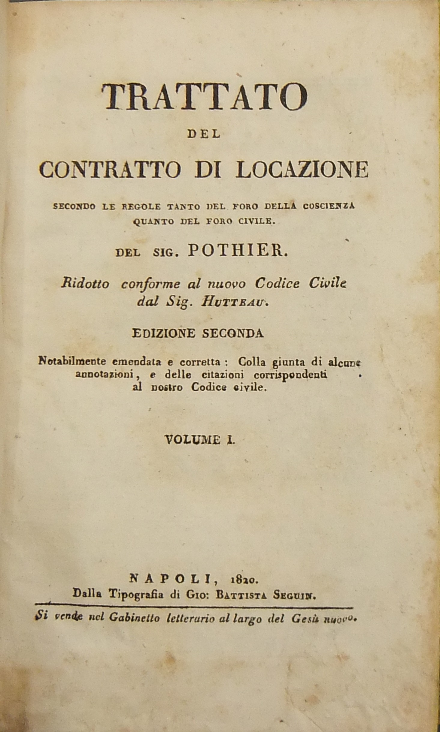 Trattato del contratto di locazione secondo le regole tanto del foro della coscienza quanto del foro civile. Ridotto conforme al nuovo Codice Civile dal Sig. Hutteau