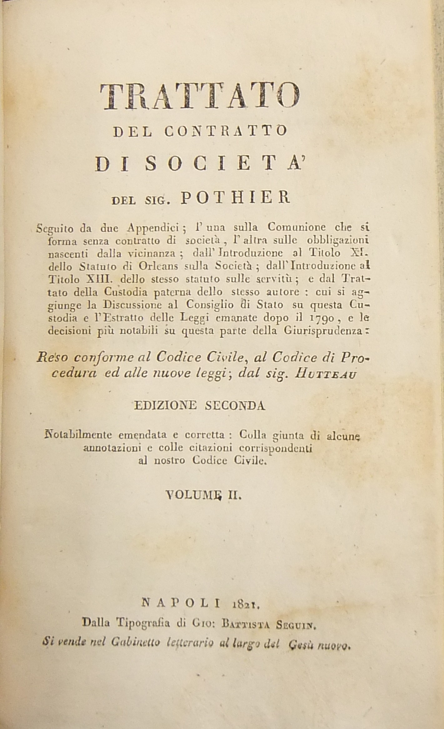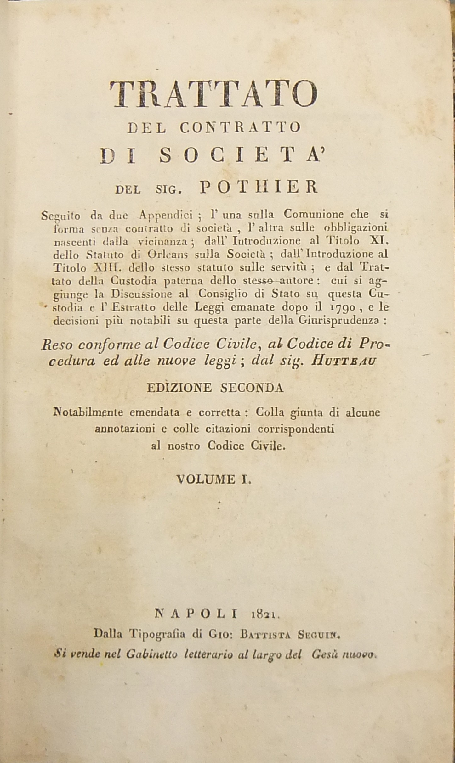 Trattato del contratto di società . Seguito da due Appendici, l'una sulla Comunione che si forma senza contratto di società , l'altra sulle obbligazioni nascenti dalla vicinanza, dall'Introduzione al Titolo XI dello Statuto di Orleans sulla Società , dall'Introduzione al Titolo XIII dello stesso statuto sulle servitù, e dal Trattato della Custodia paterna dello stesso autore cui si aggiunge la Discussione al Consiglio di Stato su questa Custodia e l'estratto delle Leggi emanate dopo il 1790 e le decisioni più notabili su questa parte della Giurisprudenza. Reso conforme al Codice Civile al Codice di Procedura ed alle nuove leggi dal Sig. Hutteau