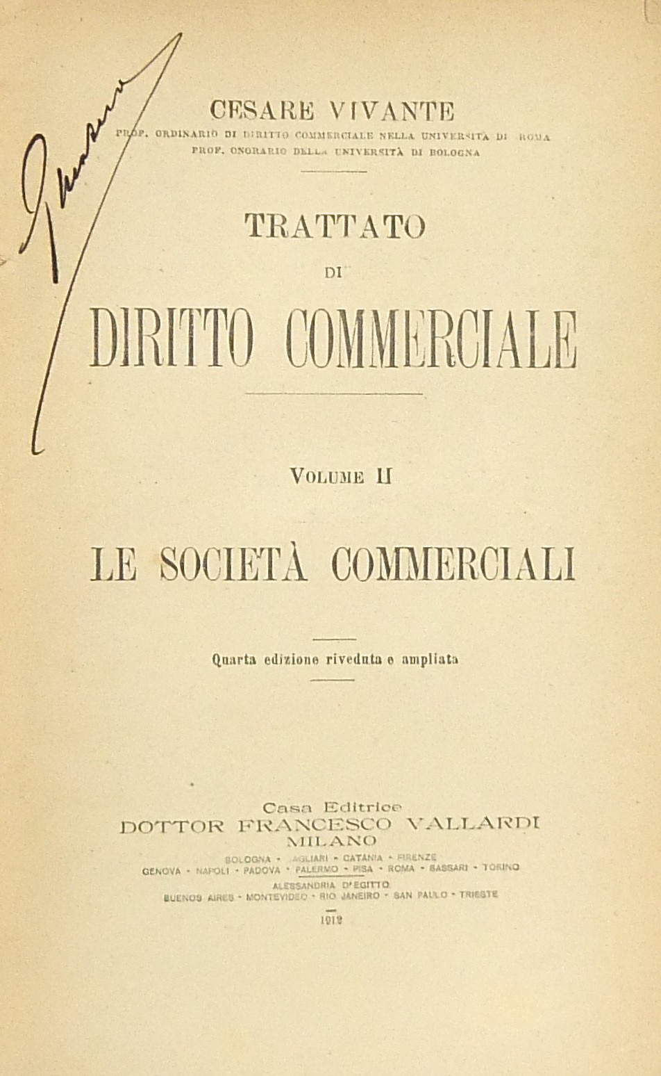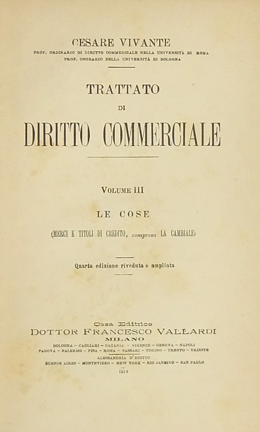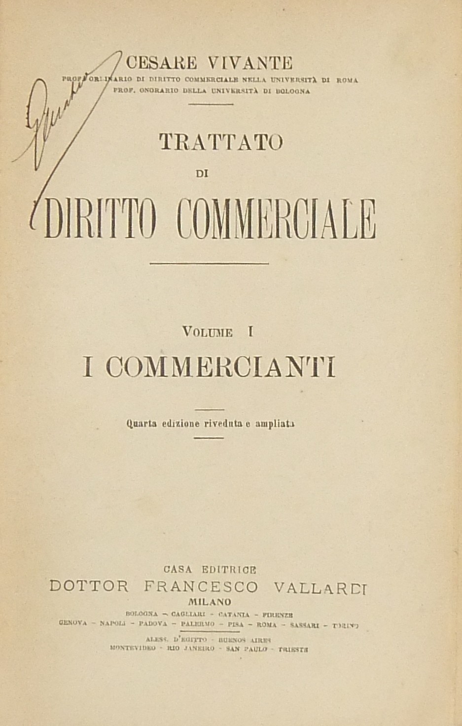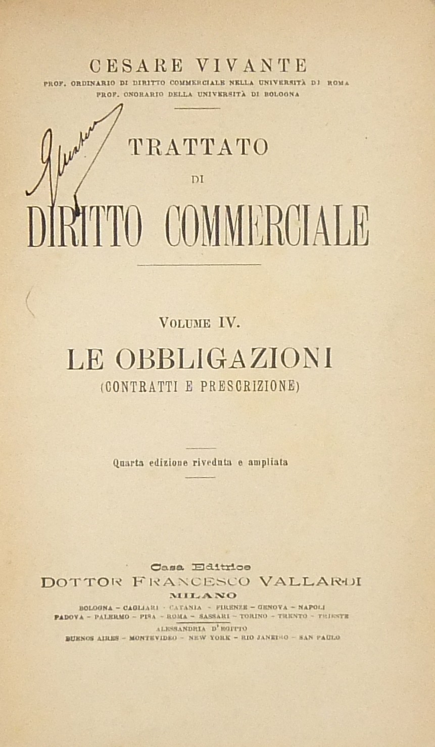 Trattato di diritto commerciale. Vol. I - I commercianti. Vol. II - Le società commerciali. Vol. III - Le cose (Merci e titoli di credito la cambiale). Vol. IV - Le obbligazioni. (Contratti e prescrizione)