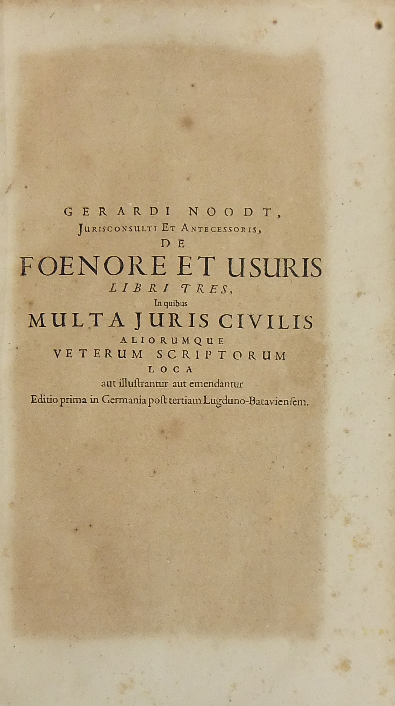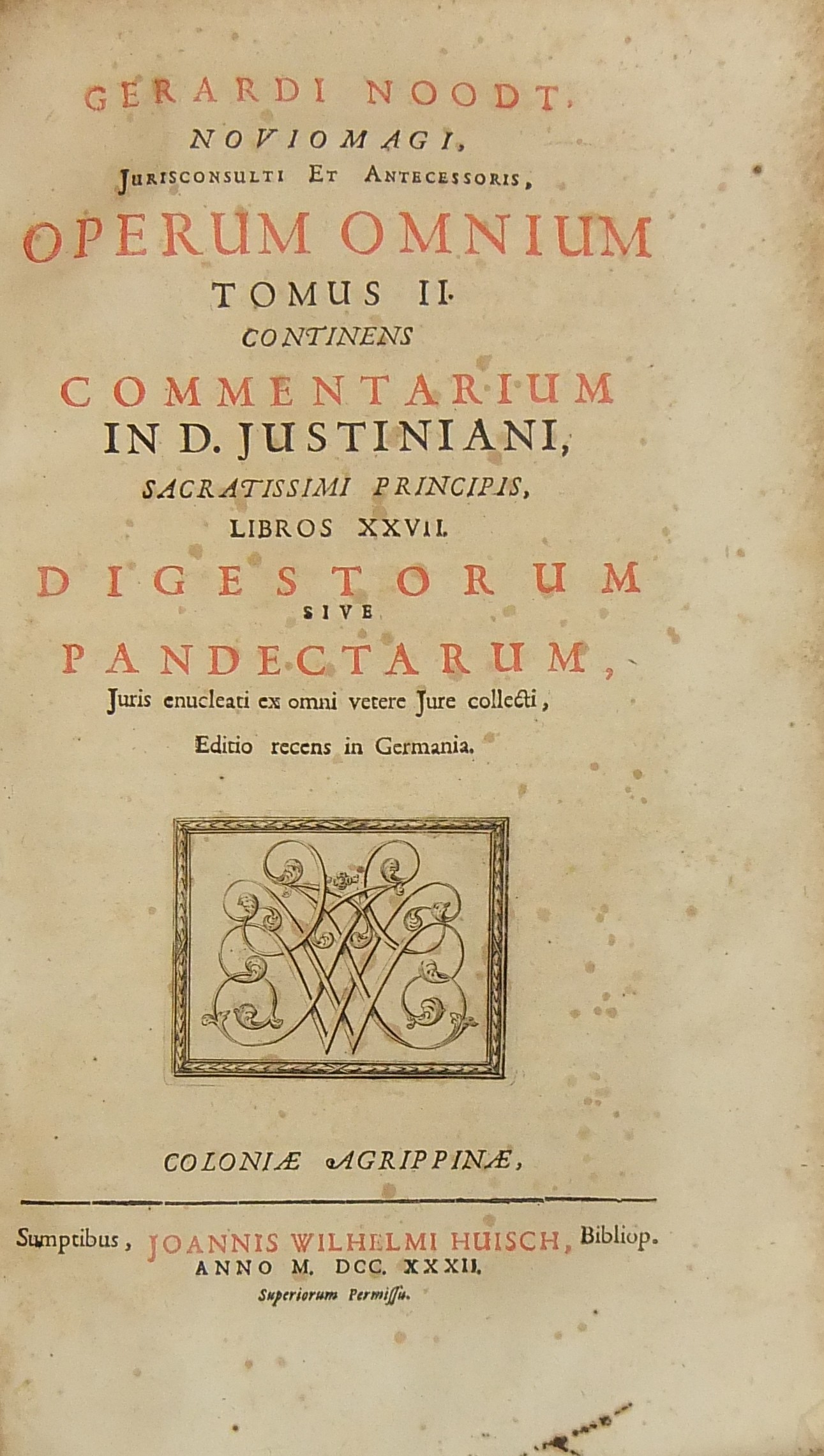 Opera omnia ab ipso recognita aucta emendata multis in locis atque in duos tomos distributa. Tomus I - Quorum prior quae contineat pagina post praefationem sequens indicabit. Editio recens in Germania post varias Lugduno-Batavienses. Tomus II - Operum omnium.. continens commentarium in D. Justiniani sacratissimi principis libros XXVII. Digestorum sive Pandectarum juris enucleati ex omni vetere jure collecti editio recens in Germania