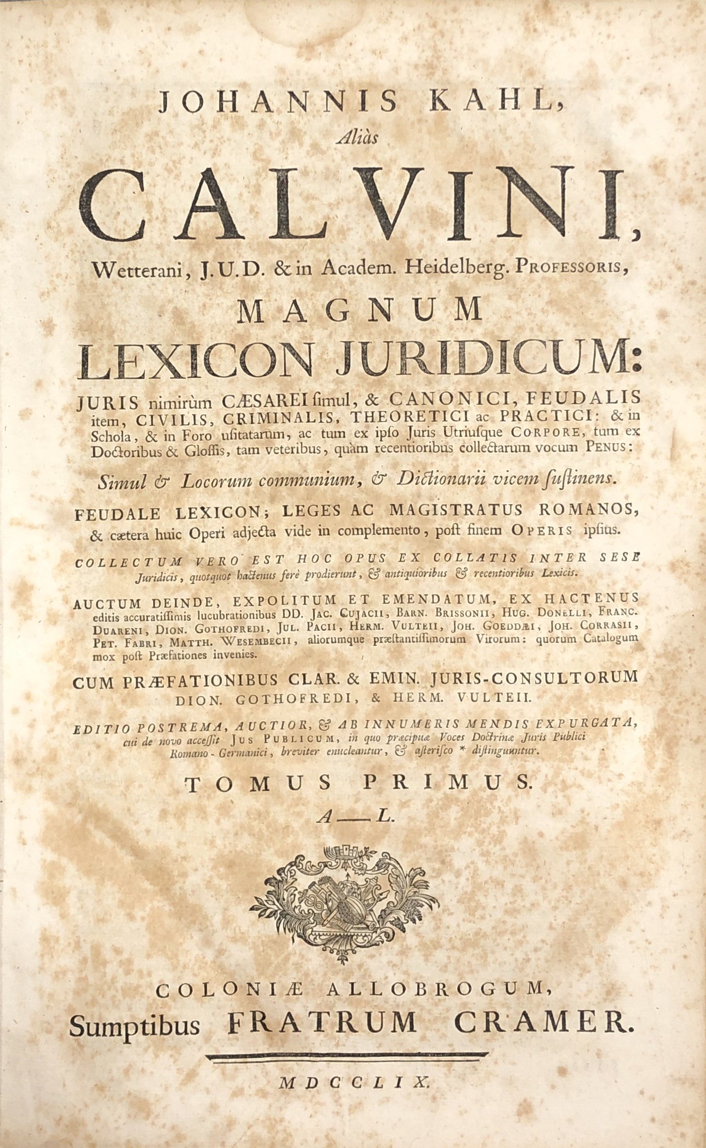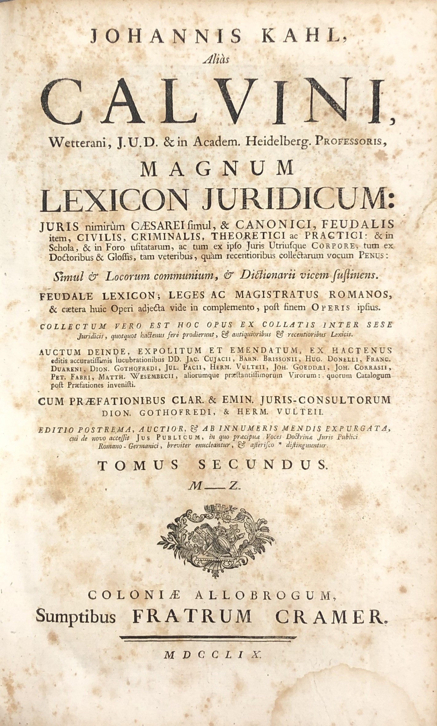 Magnum lexicon juridicum: Juris nimirum Caesarei simul & Canonici, Feudalis item, Civilis, Criminalis, Theoretici ac Practici: & in Schola, & in Foro usitatarum, ac tum ex ipso Juris Utriusque Corpore, tum ex Doctoribus & Glossis, tam veteribus, quam recentioribus collectarum vocum Penus...