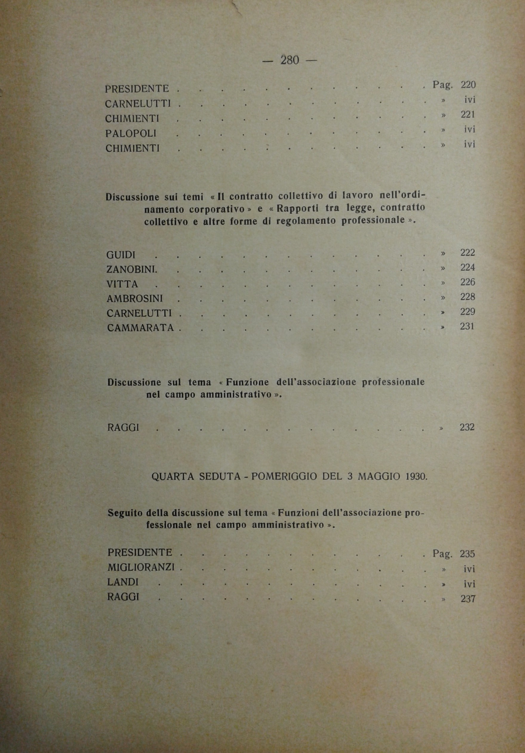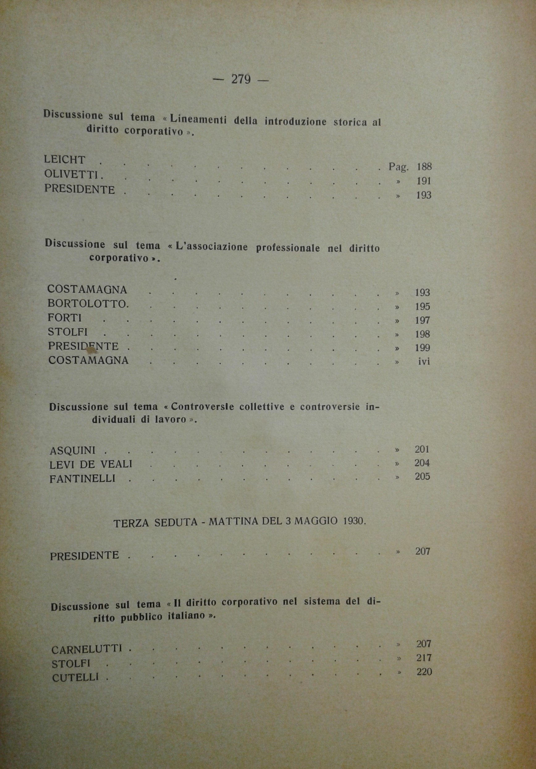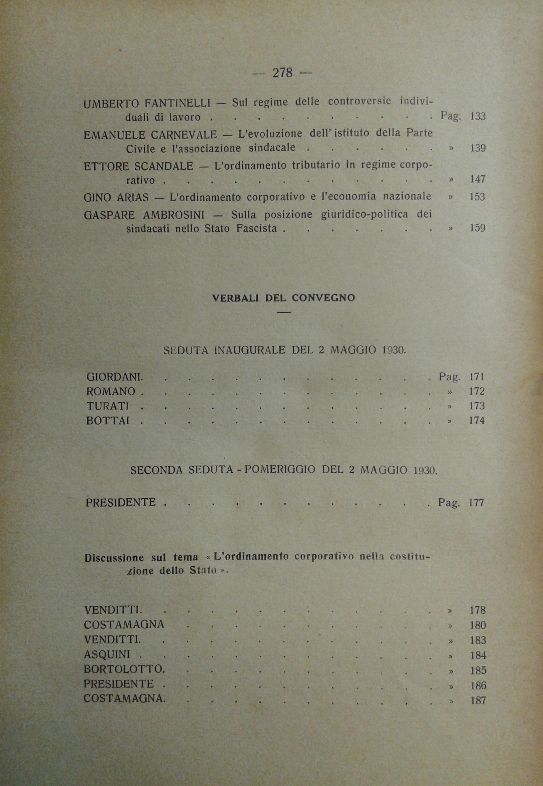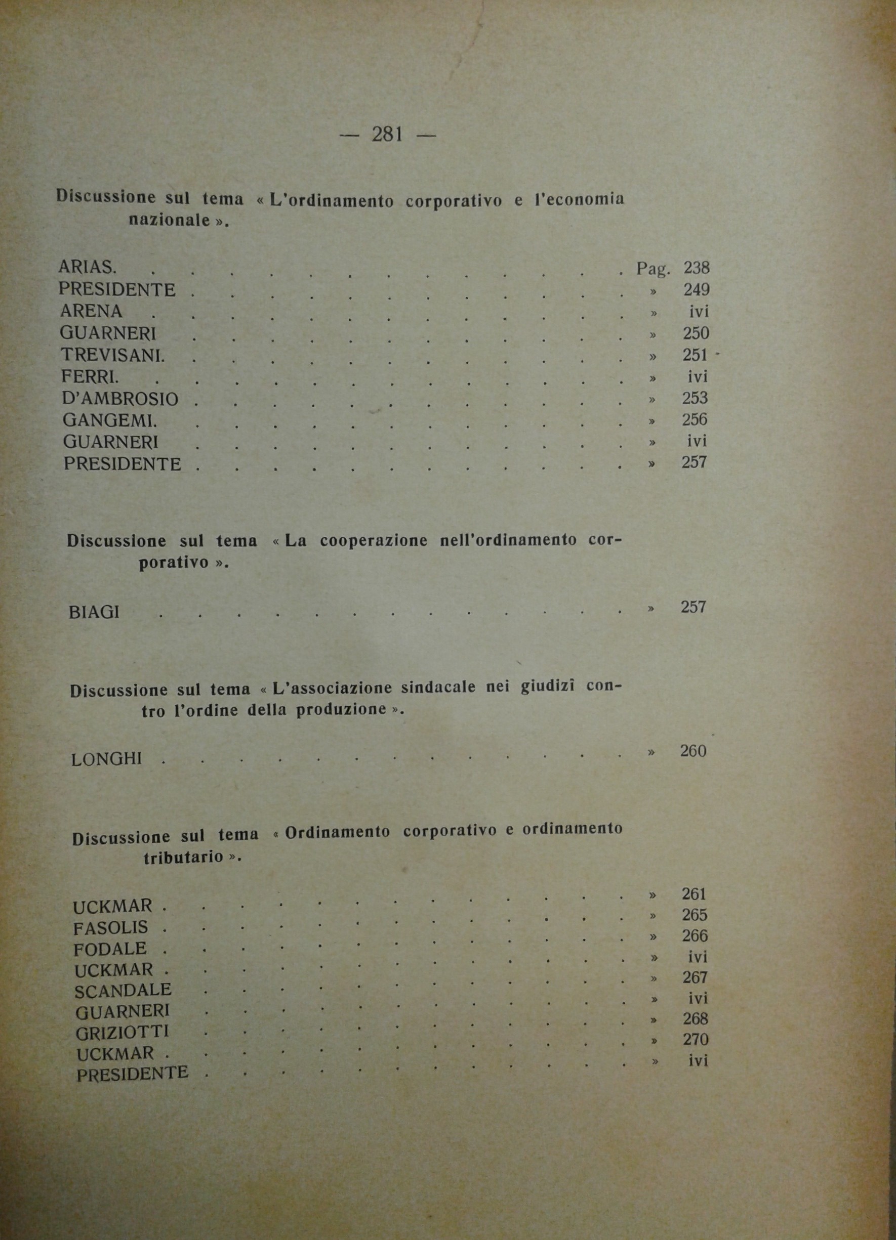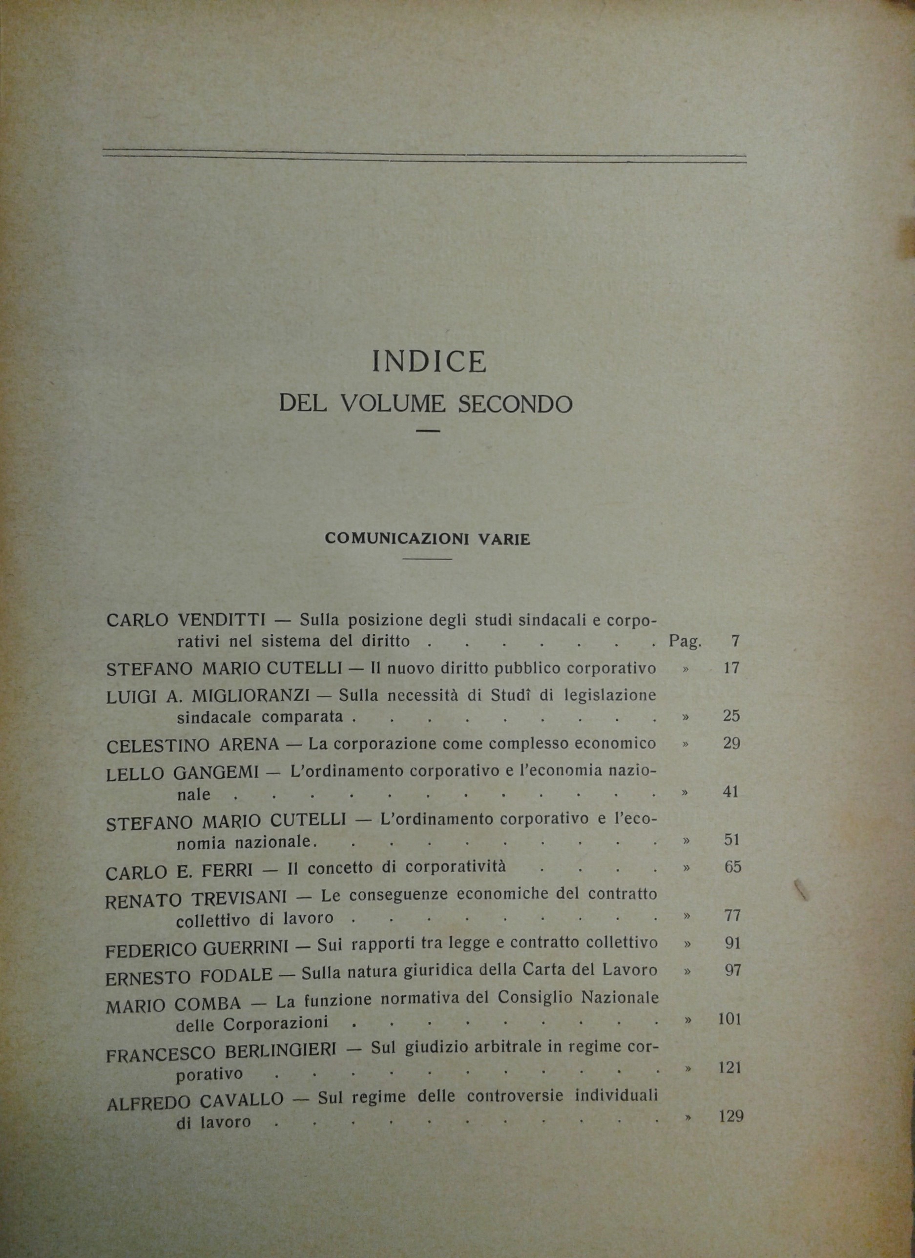 Scritti di: Ambrosini, Arena C., Arias, Berlingieri, Carnevale, Cavallo, Comba, Cutelli, Fantinelli, Ferri C.E., Fodale, Gangemi, Guerrini, Miglioranzi, Scandale, Trevisani, Venditti. Interventi di: Asquini, Biagi, Bortolotto, Bottai, Cammarata, Carnelutti, Chimienti, D’Ambrosio, Costamagna, Fasolis, Forti, Giordano, Griziotti, Guarneri Guidi, Landi, Leicht, Levi de Veali, Longhi, Olivetti, Palopoli, Raggi, Santi Romano, Stolfi, Turati, Uckmar, Vitta, Zanobini.