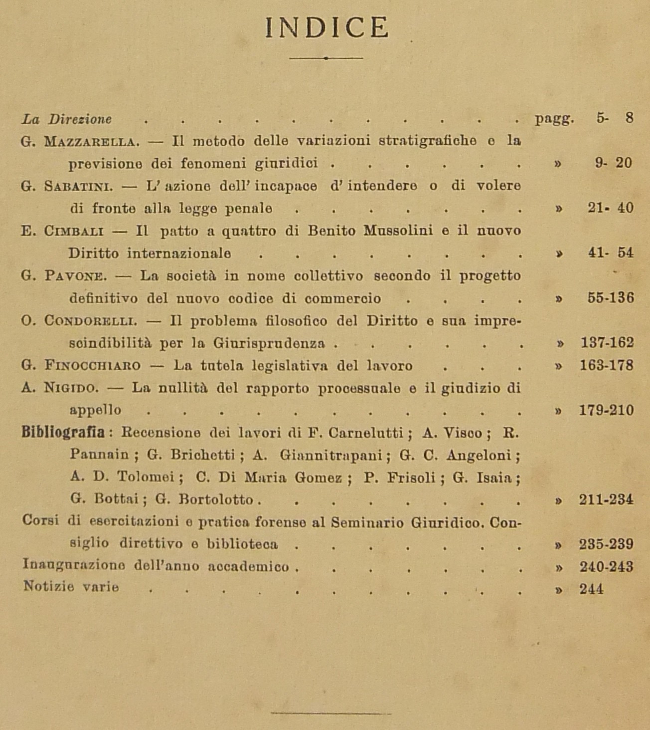 Annali del Seminario Giuridico della R. Università di Catania, Anno I, N. 1. Il merito delle variazioni stratigrafiche e la previsione dei fenomeni giuridici (Mazzarella). L'azione dell'incapace d'intendere o di volere di fronte alla legge penale (Sabatini). Il patto a quattro di Benito Mussolini e il nuovo diritto internazionale (Cimbali). La società in nome collettivo secondo il progetto definitivo del nuovo Codice di Commercio (Pavone). Il problema filosofico del diritto e sua imprescindibilità per la giurisprudenza (Condorelli). La tutela legislativa del lavoro (Finocchiaro). La nullità del rapporto processuale e il giudizio di appello (Nigido)