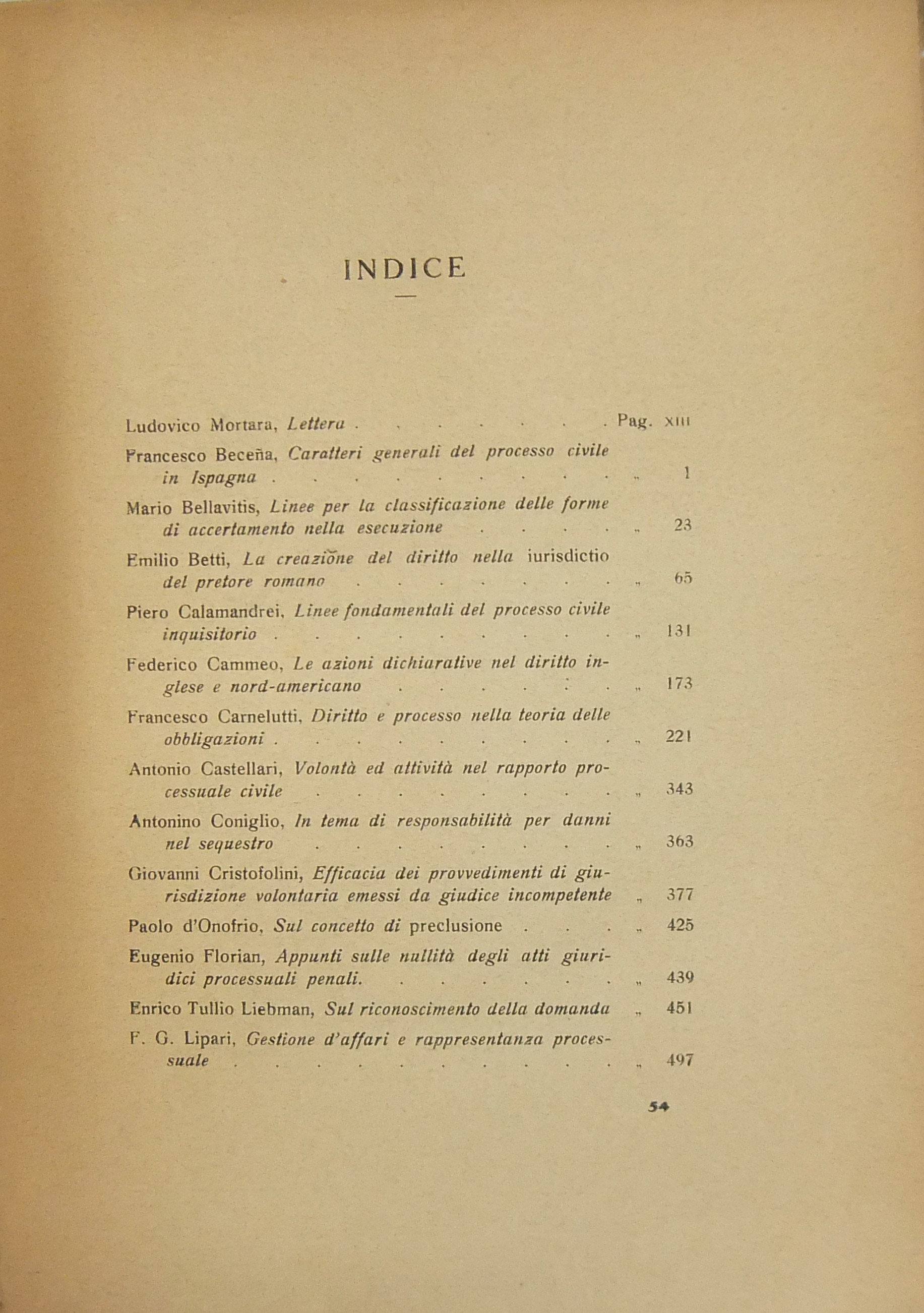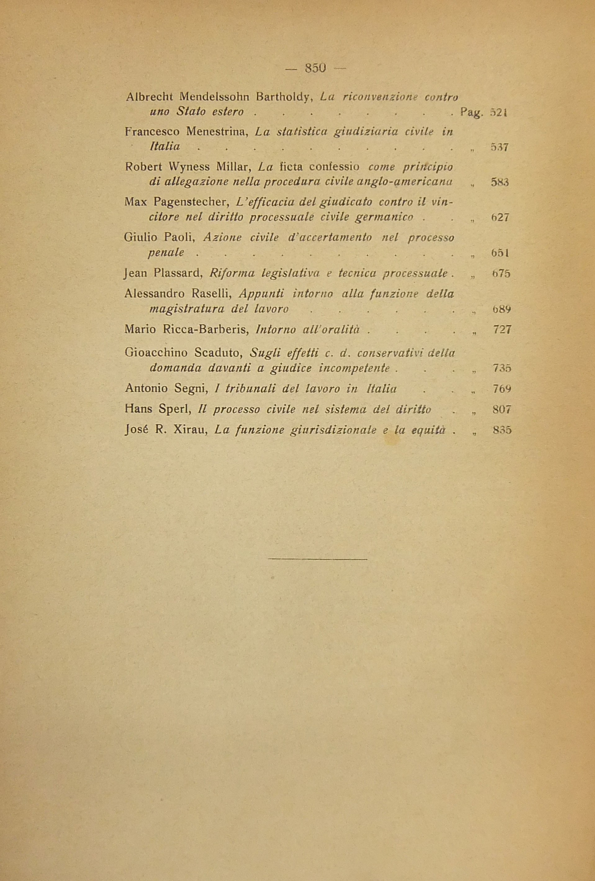 Pubblicazione a cura di: Antonio Castellari, Piero Calamandrei, Francesco Carnelutti, Enrico Redenti, Antonio Segni. Contributi di: Becena, Bellavitis, Betti, Calamandrei, Cammeo, Carnelutti, Castellari, Coniglio, Cristofolini, d’Onofrio, Florian, E. T. Liebman, Lipari, Mandelssohn Bartholdy, Menestrina, Millar, Mortara, Pagenstecher, Paoli, Plassard, Raselli, M.Ricca Barberis, Scaduto, Segni, Sperl, Xirau.