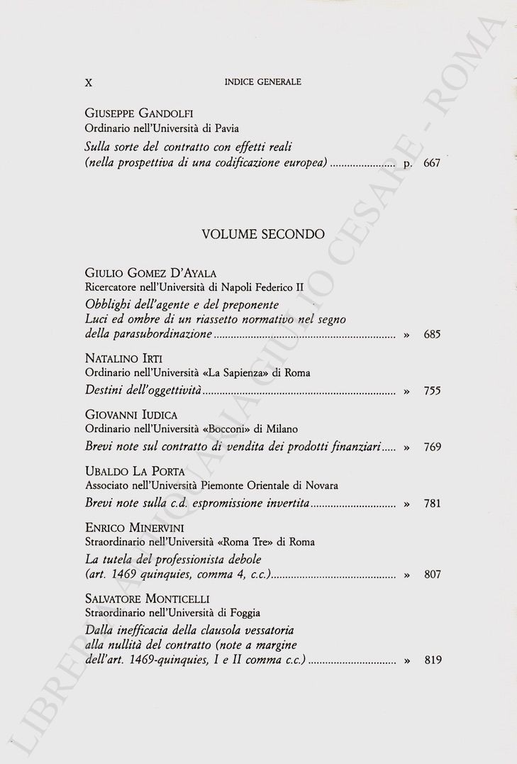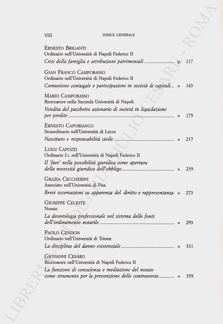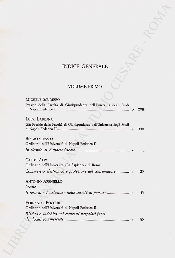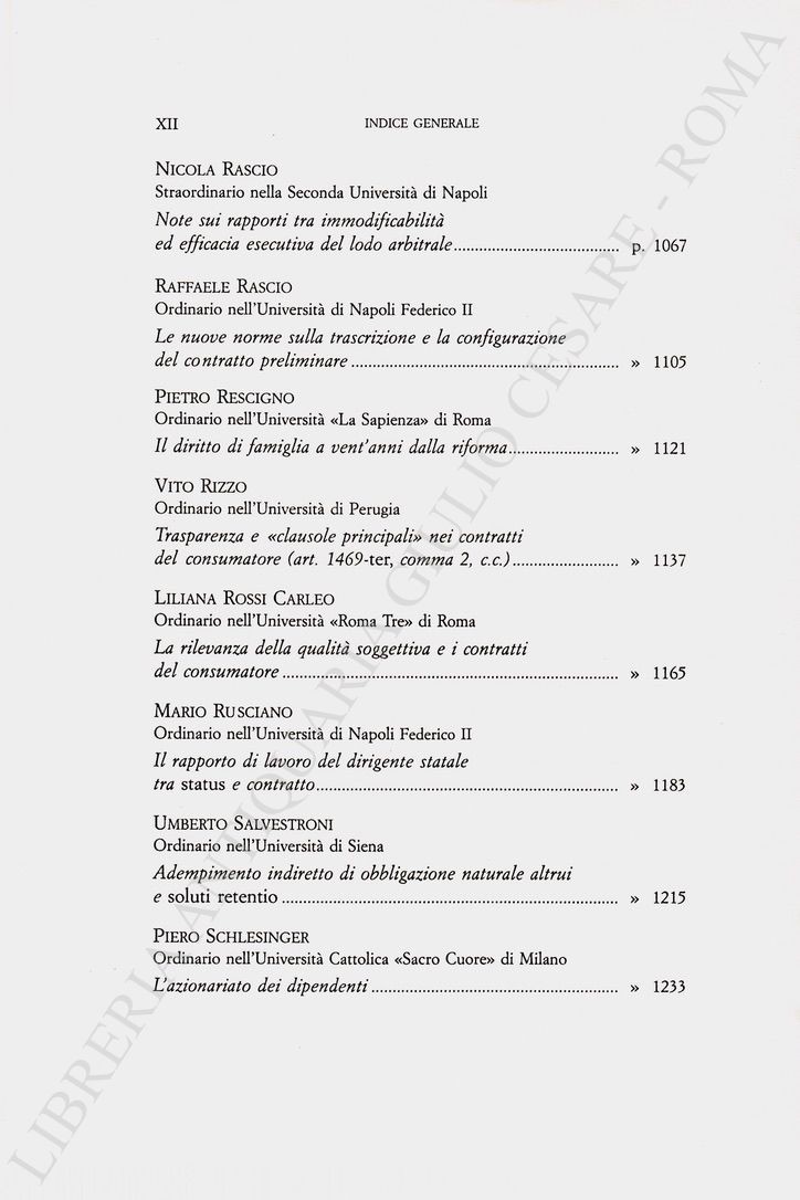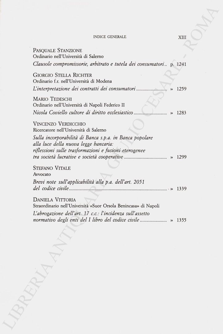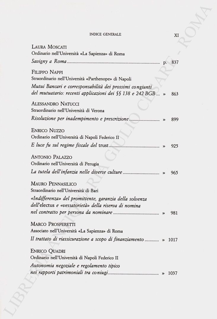 Scritti di: Alpa, Areniello, Bocchini, Briganti, Campobasso G.F., Campobasso M., Capobianco, Capozzi, Ceccherini, Celeste, Cendon, Cesaro, De Simone, Di Fusco, Di Sabato, Donati, Donisi, Esposito M., Falzea, Ferri G.B., Gabrielli, Gandolfi, Gomez D’Ayala, Grasso, Irti, Iudica, Labruna, La Porta, Minervini, Monticelli, Moscati, Nappi, Natucci, Nuzzo, Palazzo, Pennasilico, Prosperetti, Quadri E., Rascio N., Rascio R., Rescigno, Rizzo, Rossi Carleo, Rusciano, Salvestroni, Schlesinger, Scudiero, Stanzione, Stella Richter G., Tedeschi, Verdicchio, Vitale, Vittoria D.