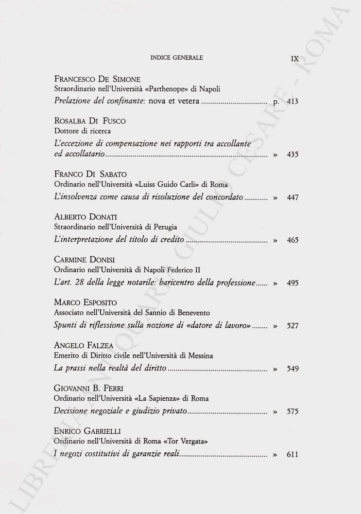 Scritti di: Alpa, Areniello, Bocchini, Briganti, Campobasso G.F., Campobasso M., Capobianco, Capozzi, Ceccherini, Celeste, Cendon, Cesaro, De Simone, Di Fusco, Di Sabato, Donati, Donisi, Esposito M., Falzea, Ferri G.B., Gabrielli, Gandolfi, Gomez D'Ayala, Grasso, Irti, Iudica, Labruna, La Porta, Minervini, Monticelli, Moscati, Nappi, Natucci, Nuzzo, Palazzo, Pennasilico, Prosperetti, Quadri E., Rascio N., Rascio R., Rescigno, Rizzo, Rossi Carleo, Rusciano, Salvestroni, Schlesinger, Scudiero, Stanzione, Stella Richter G., Tedeschi, Verdicchio, Vitale, Vittoria D.