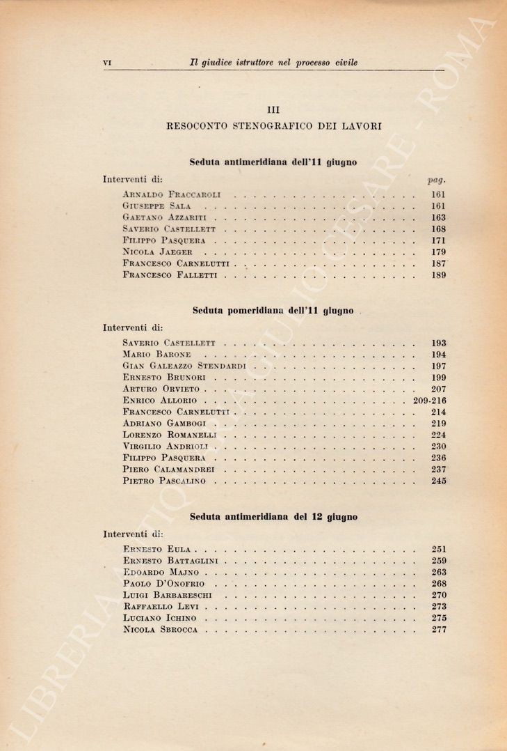 In testa al frontespizio Centro Italiano di Studi Giuridici – Milano. Elenco partecipanti: Acampora, Allorio, Andrioli, Angeloni, Azzariti, Barberio Corsetti, Barbero, Barile, Battaglini, Berri, Bianchi d’Espinosa, Biondi, Biscottini, Bovio, Calamandrei, Calvosa, Capaccioli, Cappelletti, Carnacini, Carnelutti, D’Amia, De Marini, Denti, D’Onofrio, Eula, Fazzalari, Franceschelli, Garbagnati, Giannattasio, Giannozzi, Gionfrida, Giudiceandrea, Giuliano, Grassetti, Ichino, Jaeger, Jannuzzi, Jarach, Jovane, Liebman, Lugo, Mandrioli, Minoli, Montel, Montesano, Ondei, Pellizzi, Predieri, Provinciali, Pugliese, Redenti, Romanelli, Rotondi, Sargenti, Satta, Stella Richter, Stolfi, Torrente, Vellani, Vocino.
