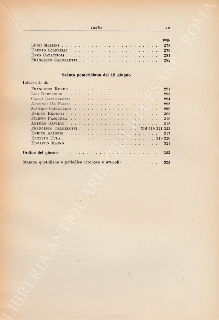 In testa al frontespizio Centro Italiano di Studi Giuridici - Milano. Elenco partecipanti: Acampora, Allorio, Andrioli, Angeloni, Azzariti, Barberio Corsetti, Barbero, Barile, Battaglini, Berri, Bianchi d'Espinosa, Biondi, Biscottini, Bovio, Calamandrei, Calvosa, Capaccioli, Cappelletti, Carnacini, Carnelutti, D'Amia, De Marini, Denti, D'Onofrio, Eula, Fazzalari, Franceschelli, Garbagnati, Giannattasio, Giannozzi, Gionfrida, Giudiceandrea, Giuliano, Grassetti, Ichino, Jaeger, Jannuzzi, Jarach, Jovane, Liebman, Lugo, Mandrioli, Minoli, Montel, Montesano, Ondei, Pellizzi, Predieri, Provinciali, Pugliese, Redenti, Romanelli, Rotondi, Sargenti, Satta, Stella Richter, Stolfi, Torrente, Vellani, Vocino.