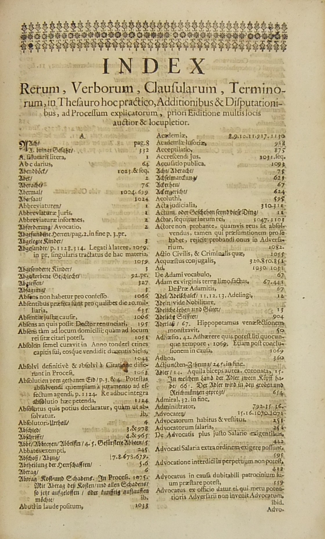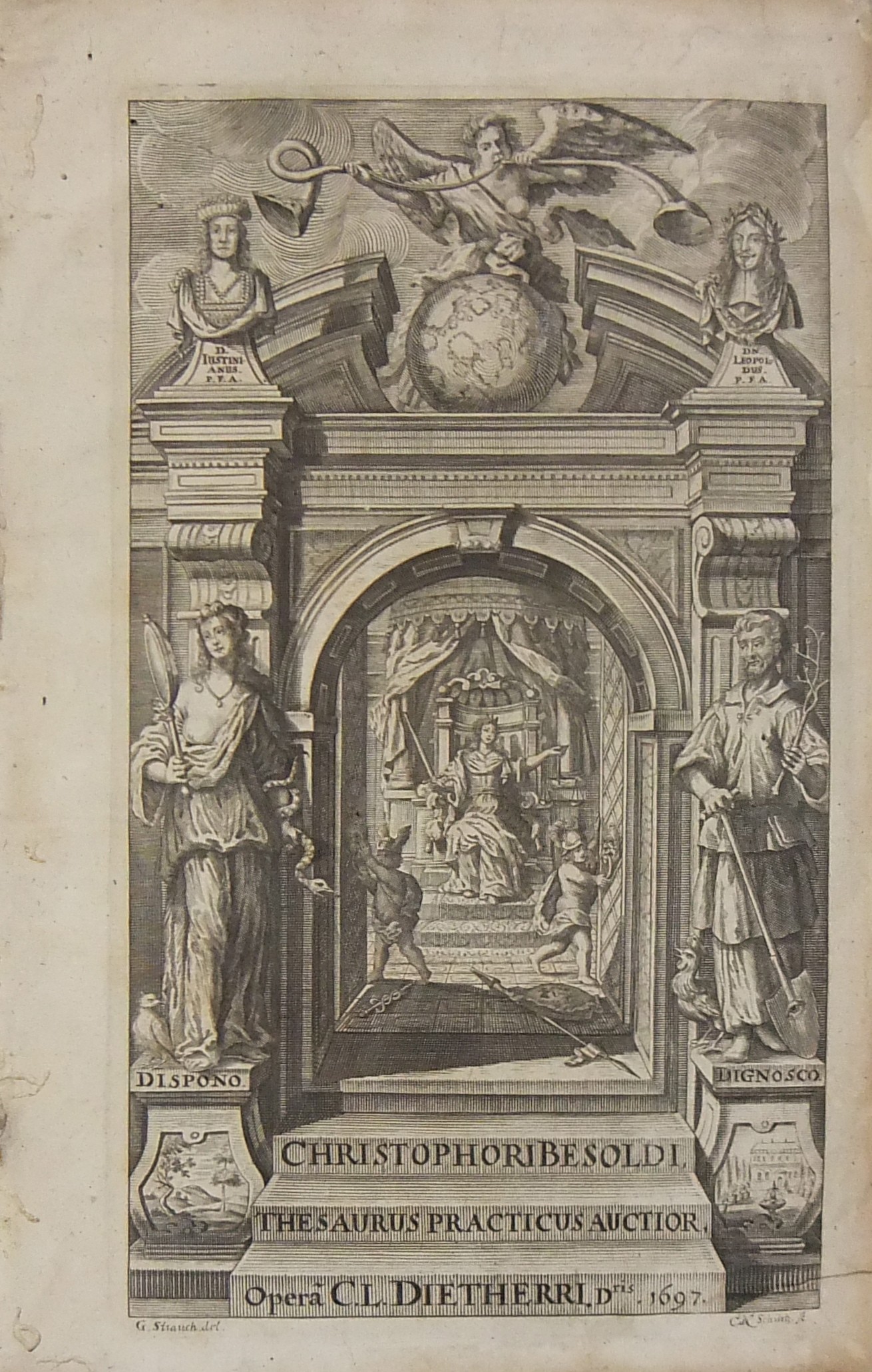 Christophori Besoldi... Thesaurus practicus. Non solum explicationem terminorum atque clausularum in aulis et dicasteris usitatarum continens sed et inprimis quam plurima ad Sacri Romani Imperii tam ecclesiasticum quam politicum statum mores item historiam linguam et Antiquitatem Germanicam pertinentia edocens simulque nonnulla tam vetera quam nova Documenta referens Editio nova auctior et emendatior infinitis locis ex recentioribus autoribus practicis historicis politicis philologicis manuscriptis Synoptica item materiam regalium continente tractatione Dissertationibus Theorico-practicis modum tam in Civilibus quam Criminalibus Referendi seu votandi Processumque Judiciarum compendiose et nervose exhibentibus nec non illustribus aliquot Responsis aucta et locupletata studio et opera Christophori Ludovici Dietherr