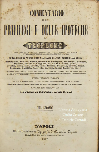 Comentario dei privilegi e delle ipoteche. Nuova edizione accresciuta nel Belgio del confronto delle opere di Duranton, Toullier, Merlin, Rolland de Villargues, Zachariae, Demante, Deleurie, Favard de Langlade, Dalloz, O. Leclercq, Persil, Grenier, Delvincourt, Cotelle, Colas, Hervieu, Blondeau, Valette, Ernst, Renouard, Tarrible, Malleville, Carrier, Duport-Lavillette, ec. ec.