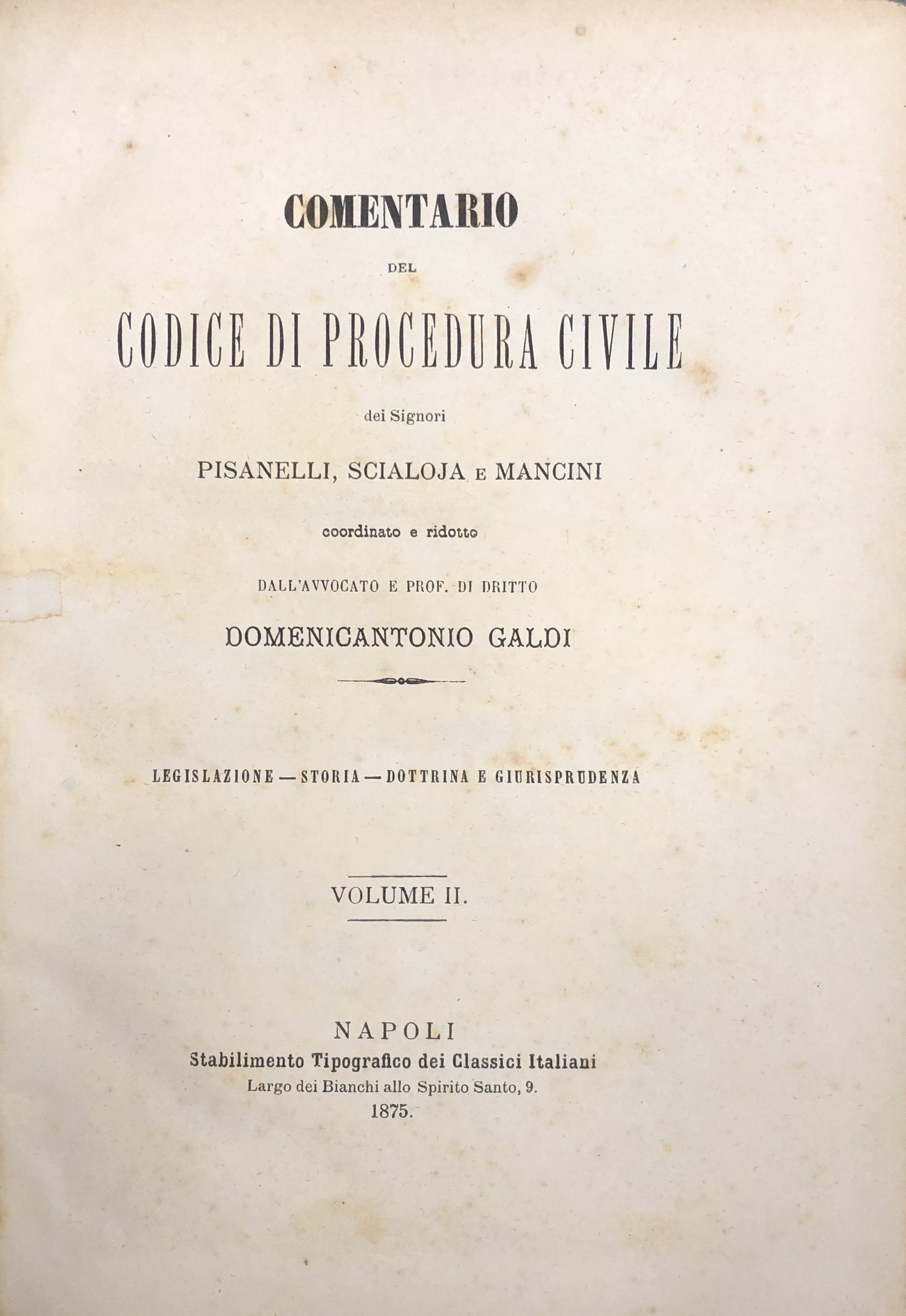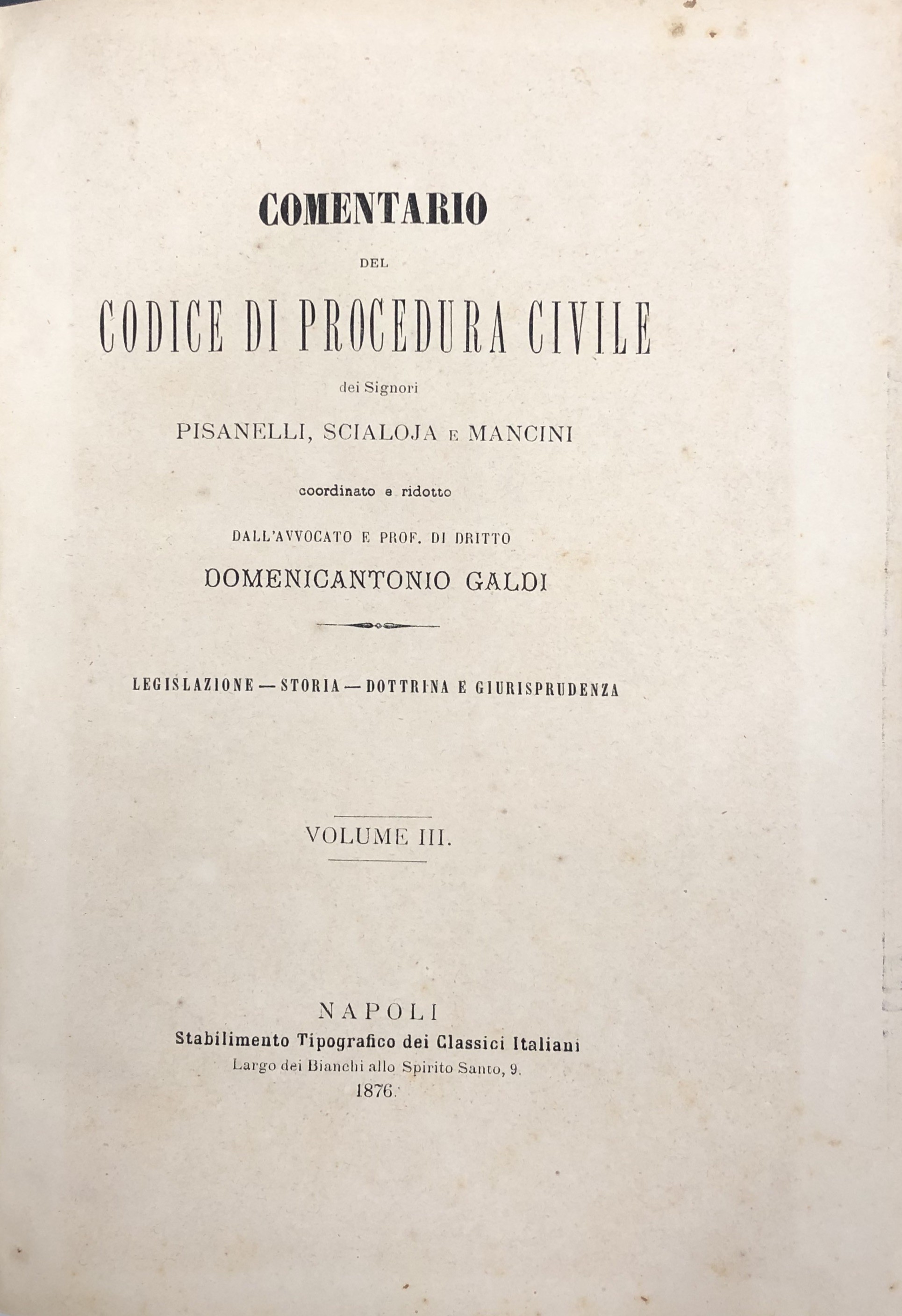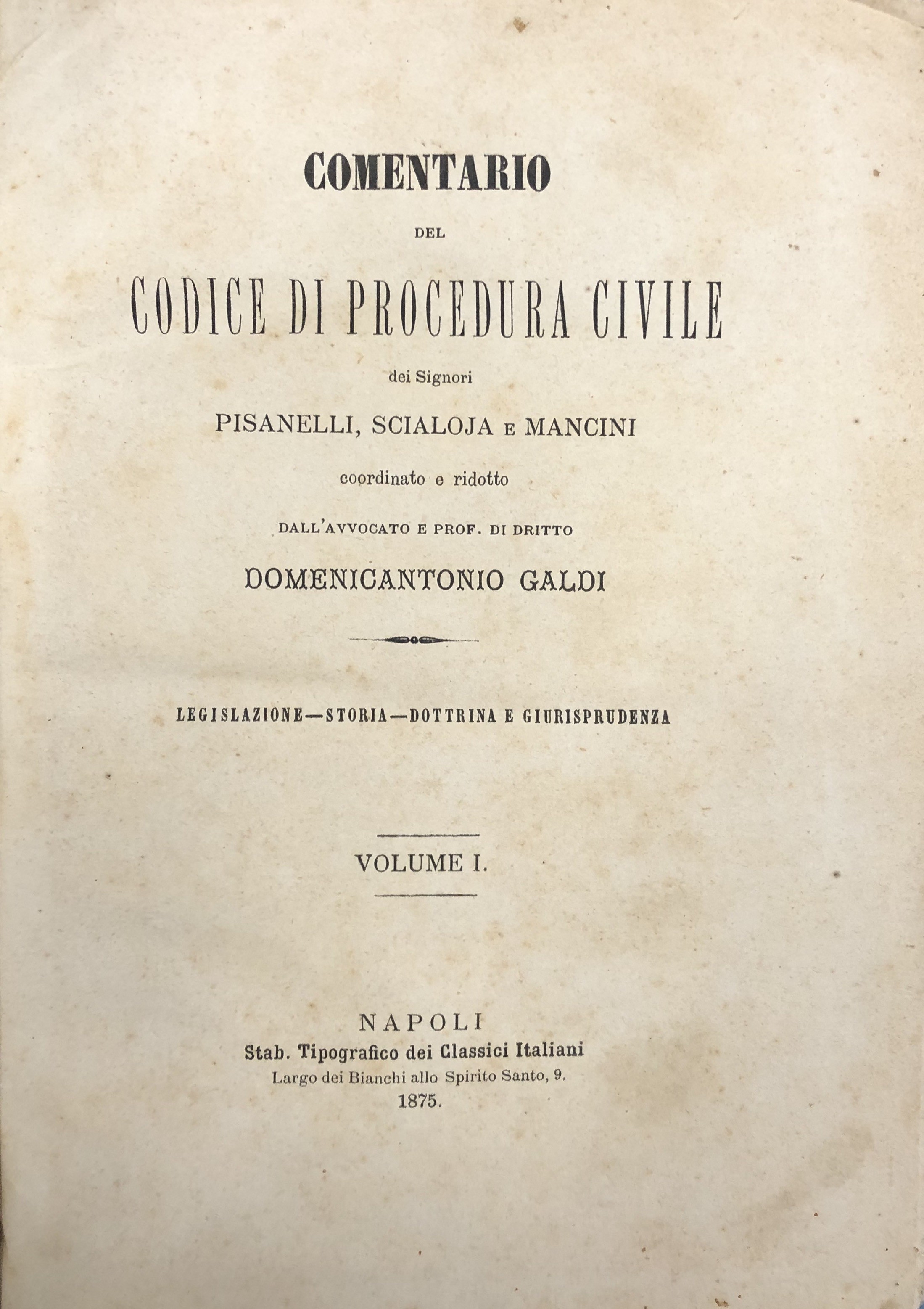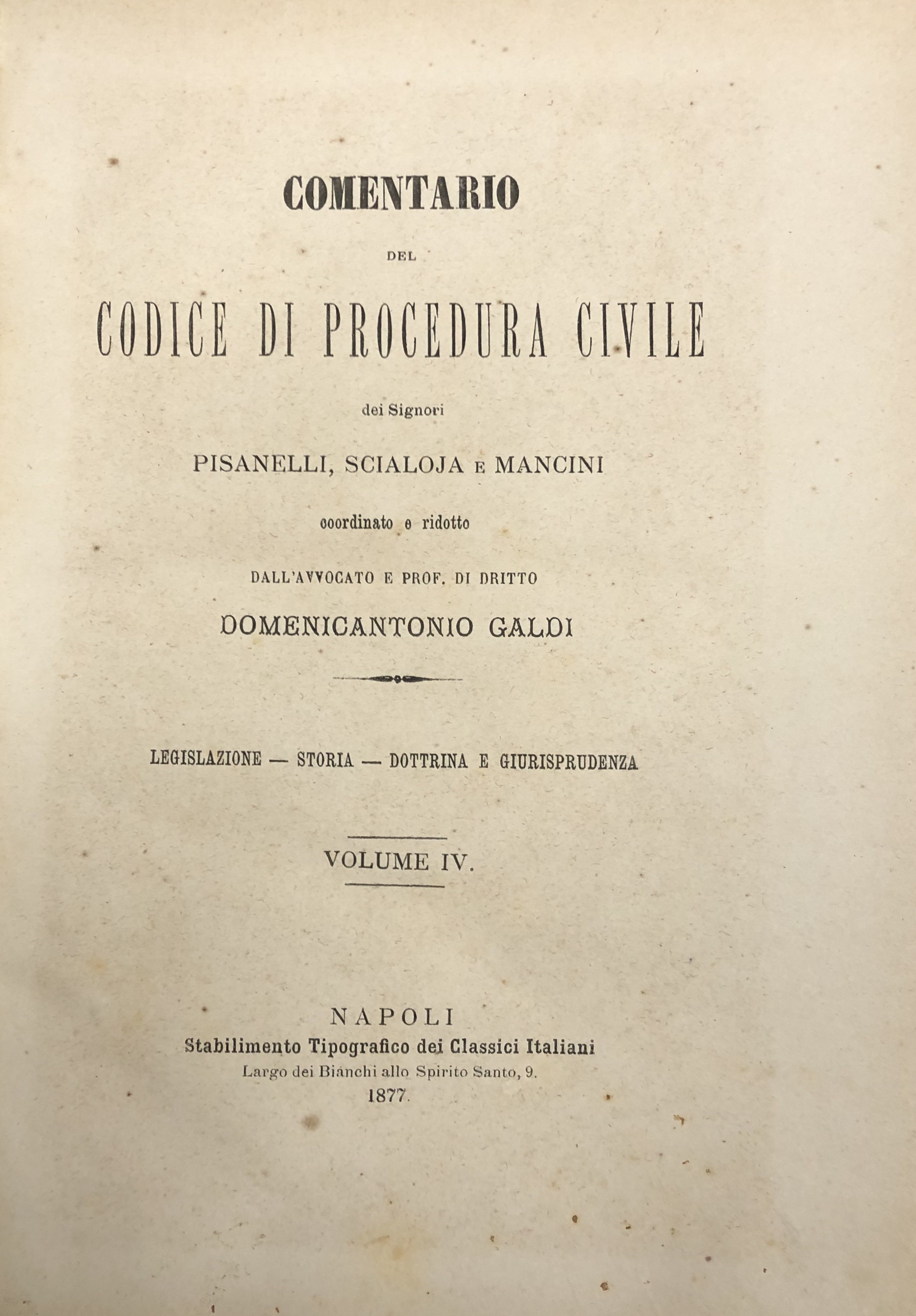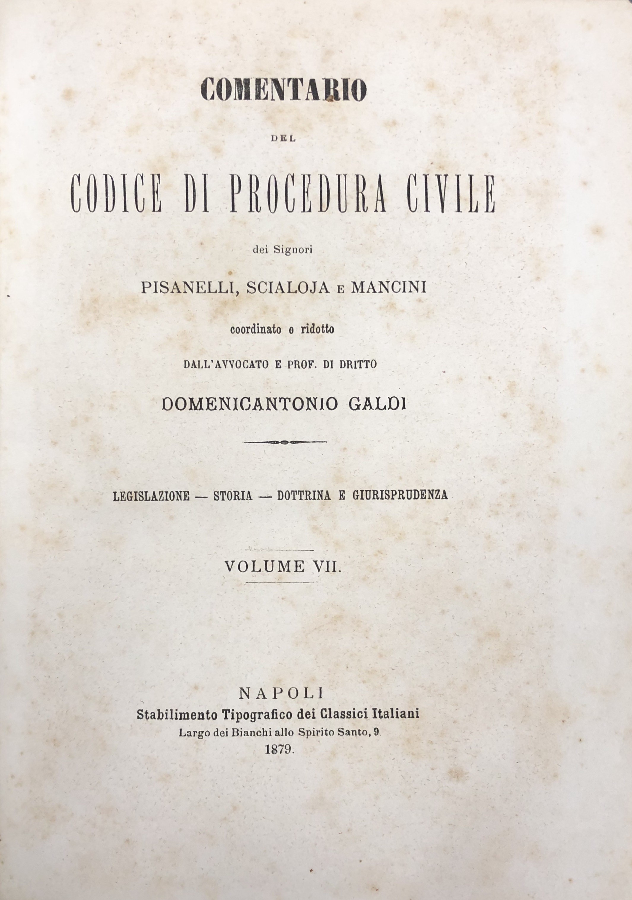 Comentario del codice di procedura civile del Regno d'Italia dei Signori Pisanelli Scialoja e Mancini coordinato e ridotto da Domenicantonio Galdi. Legislazione, Storia, Dottrina e Giurisprudenza