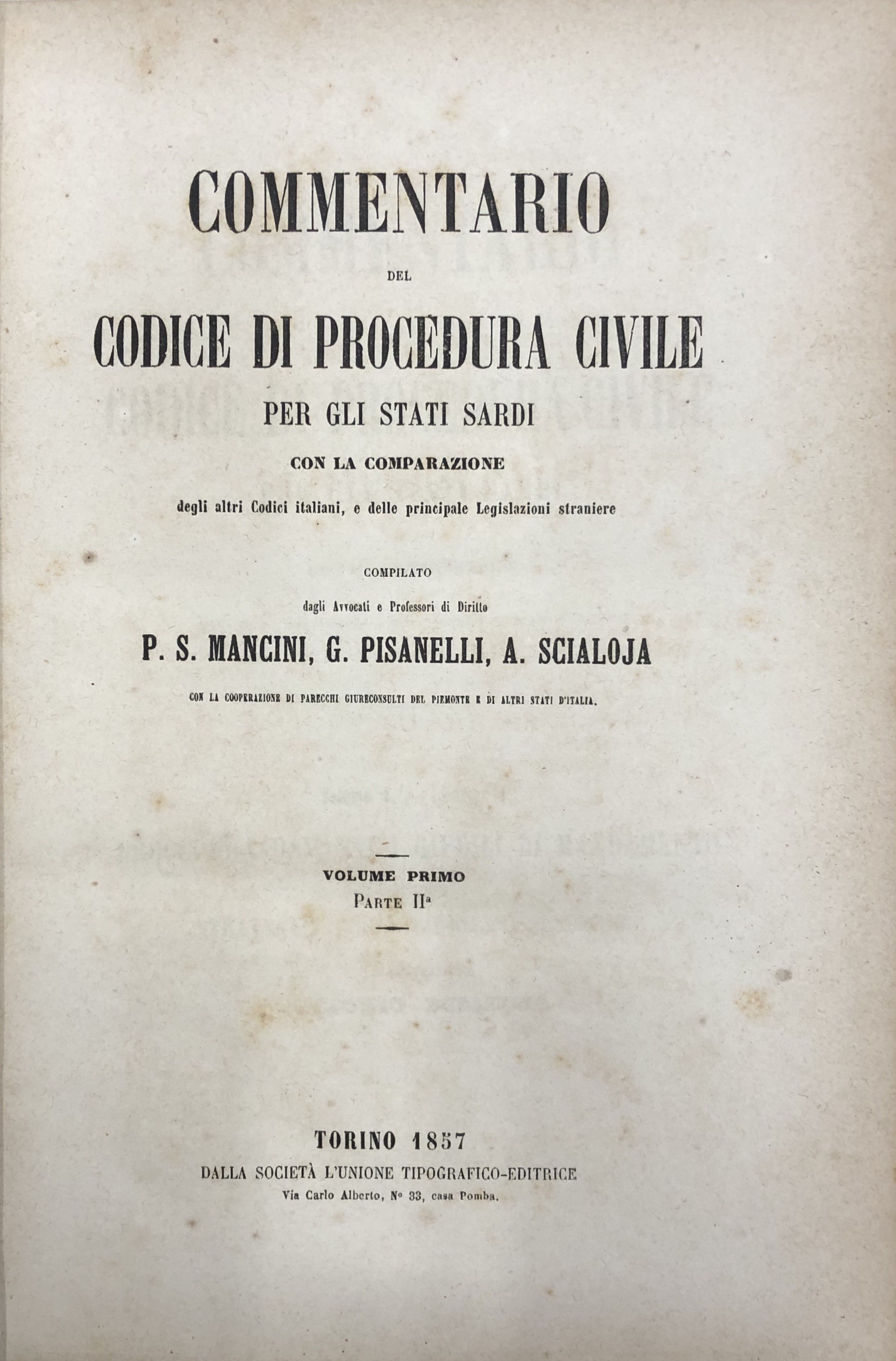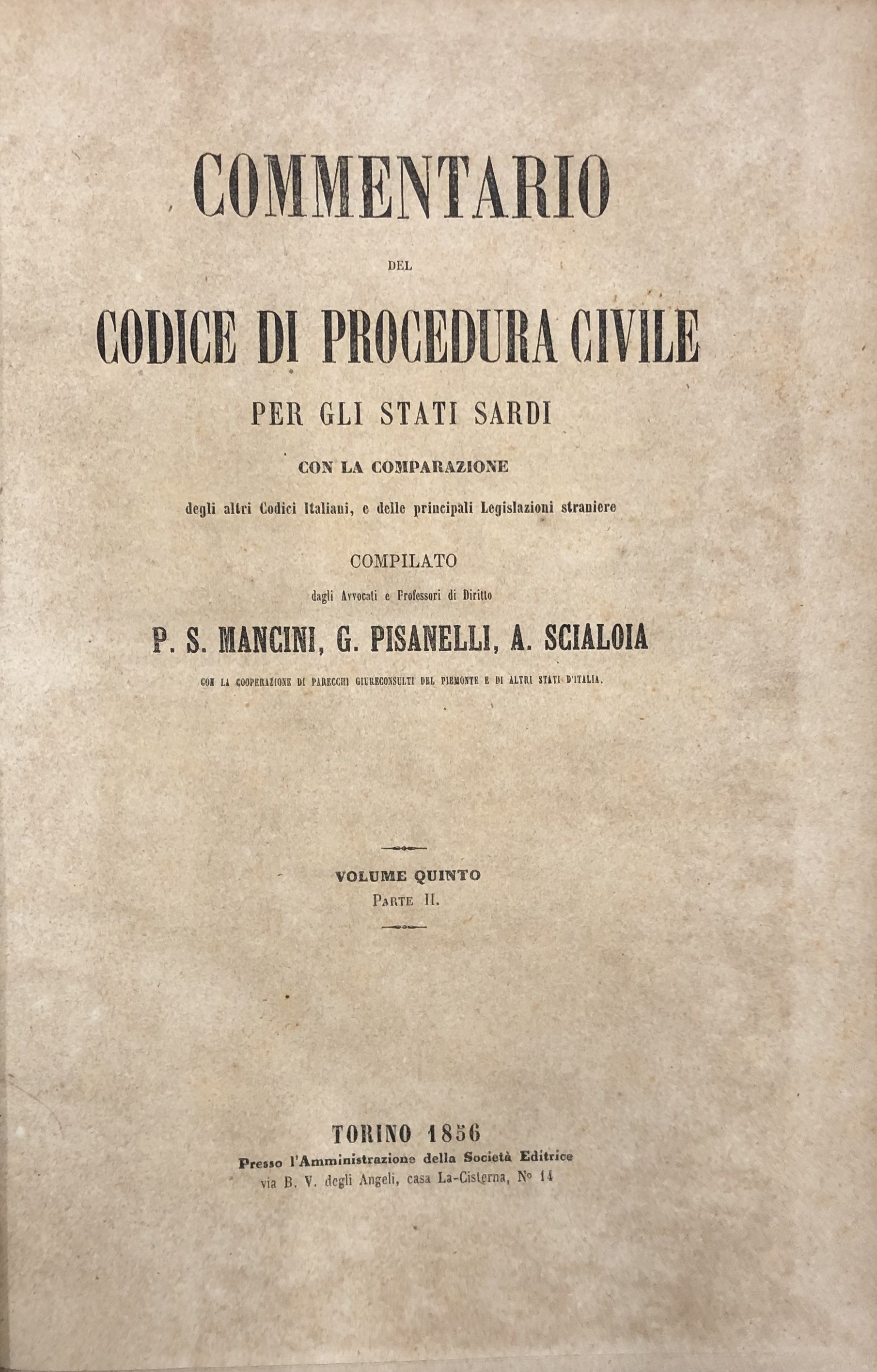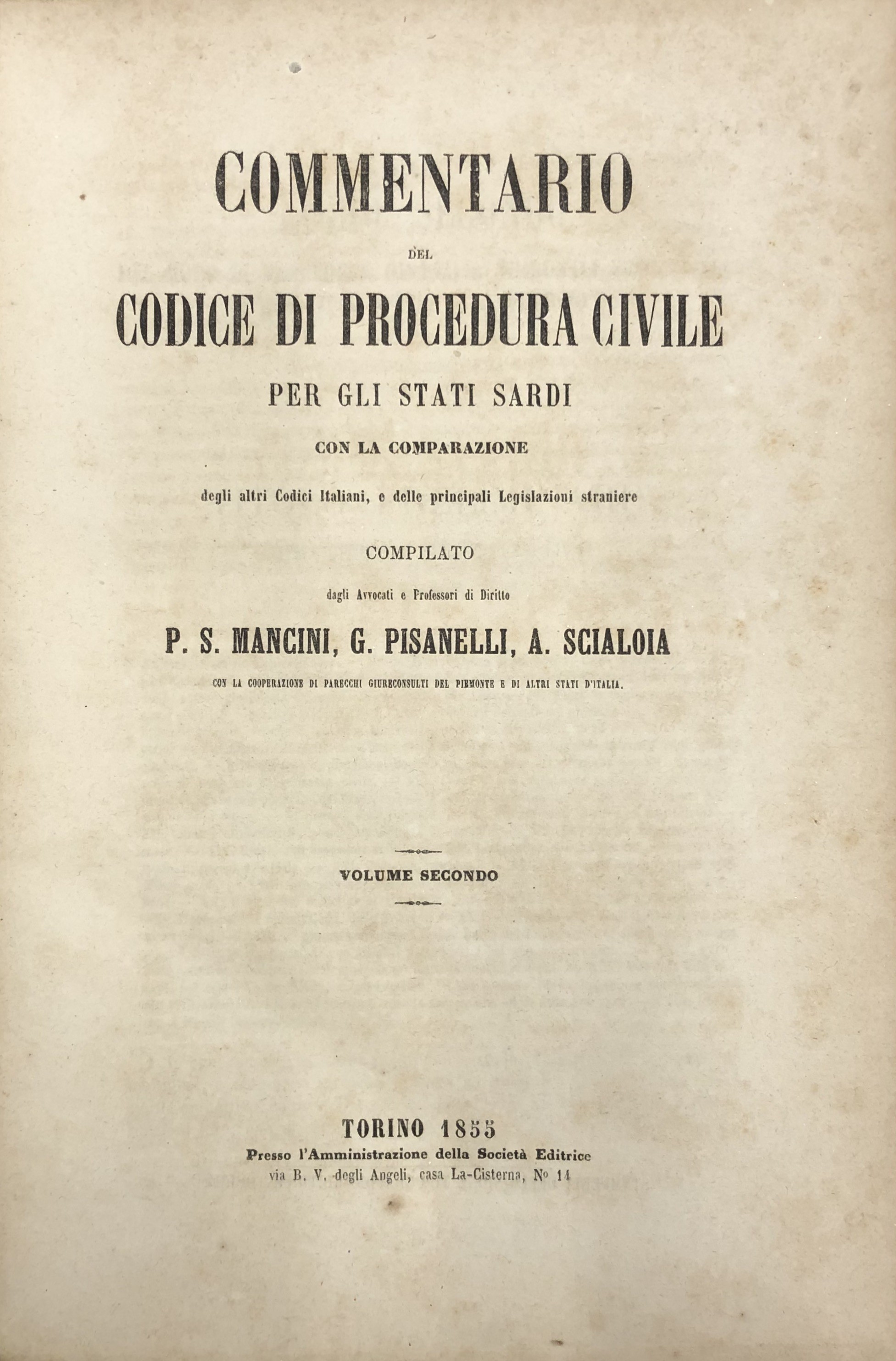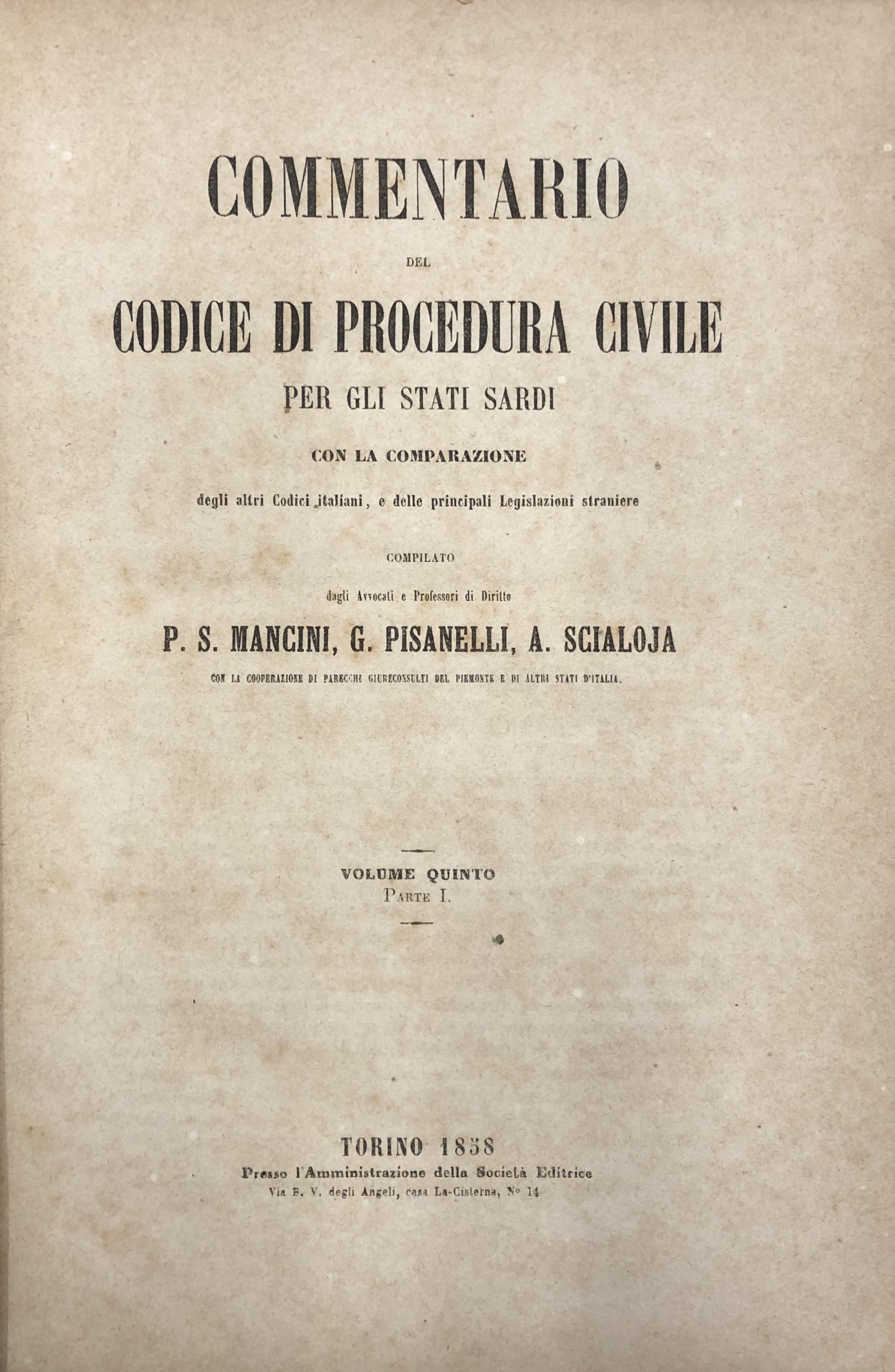 Commentario al Codice di Procedura civile per gli Stati Sardi con la comparazione degli altri Codici Italiani e delle principali Legislazioni straniere. Compilato dagli Avvocati e Professori di Diritto P.S. Mancini, G. Pisanelli, A. Scialoja con la cooperazione di parecchi giureconsulti del Piemonte e di altri Stati d'Italia. Vol. I, parte I - Giuseppe Pisanelli: Trattato sulla competenza; Vol. I, parte II - Antonio Scialoja: Procedura davanti i giudici di mandamento con un trattato sulle azionipossessorie; Vol. II - Pasquale Stanislao Mancini: Del modo di procedere dinanzi a' Tribunali provinciali e dinanzi a quelli di commercio; Vol. III - Luigi Borsari: Trattato delle prove; Vol. IV - Giuseppe Pisanelli: De' mezzi per impugnare le sentenze; Vol. V, parte I - Antonio Scialoja: Dell'esecuzione de' giudicati; Vol. V, parte II - Giuseppe Pisanelli: De' varii procedimenti speciali + Codice di procedura civile per gli Stati sardi con le sorgenti di ciascun articolo e le Relazioni ufficiali estratto dal commentario al medesimo Codice