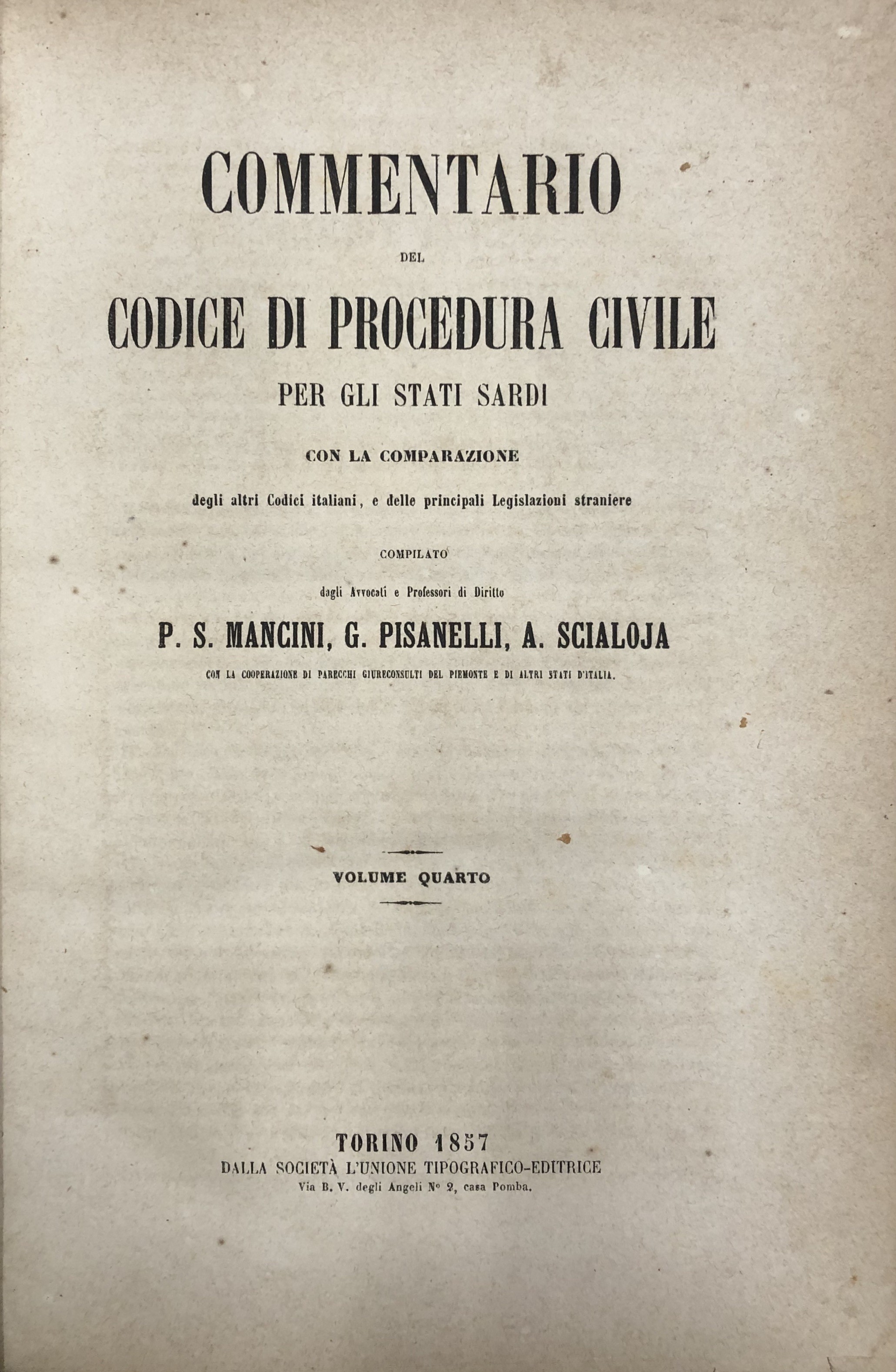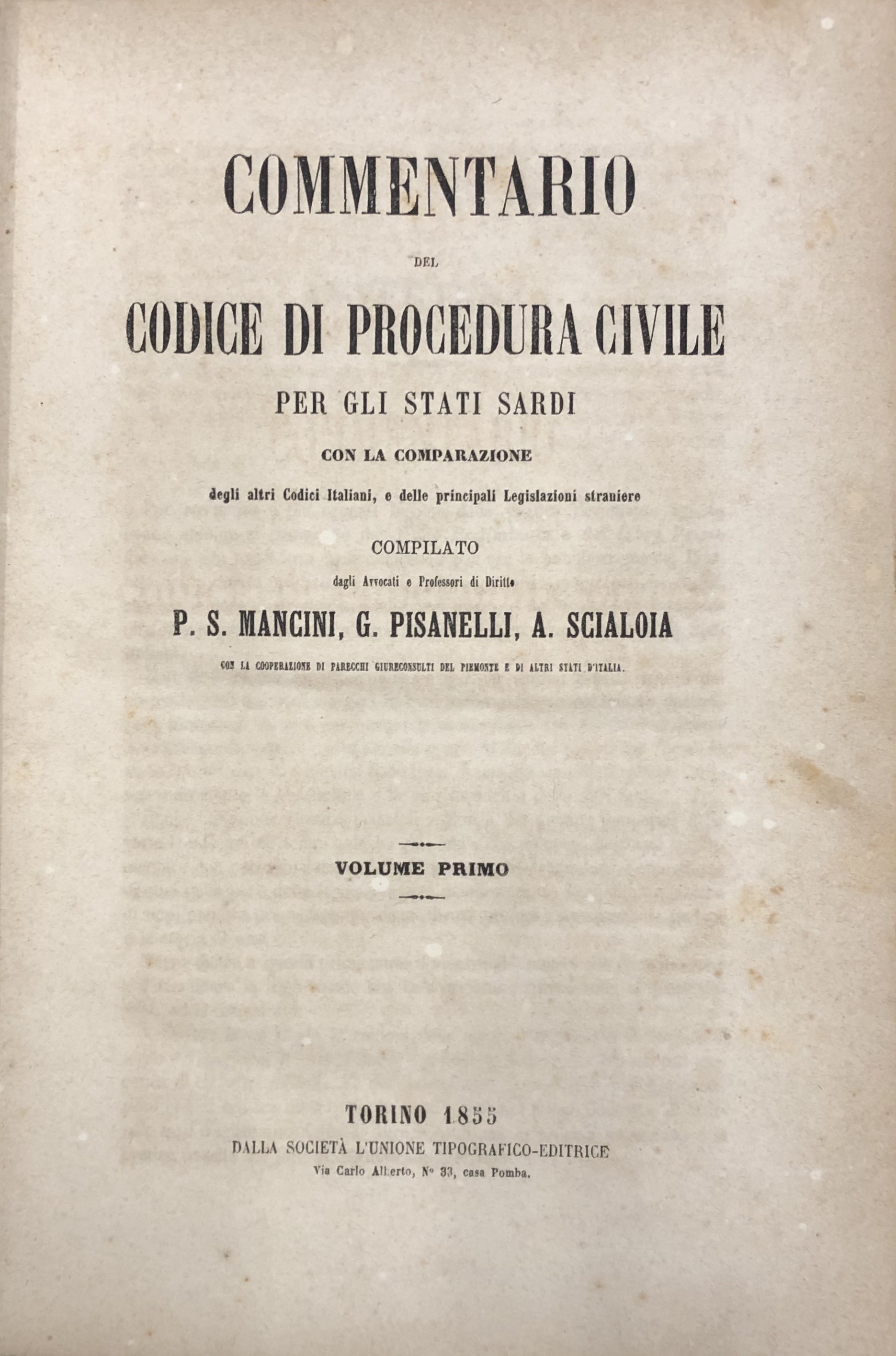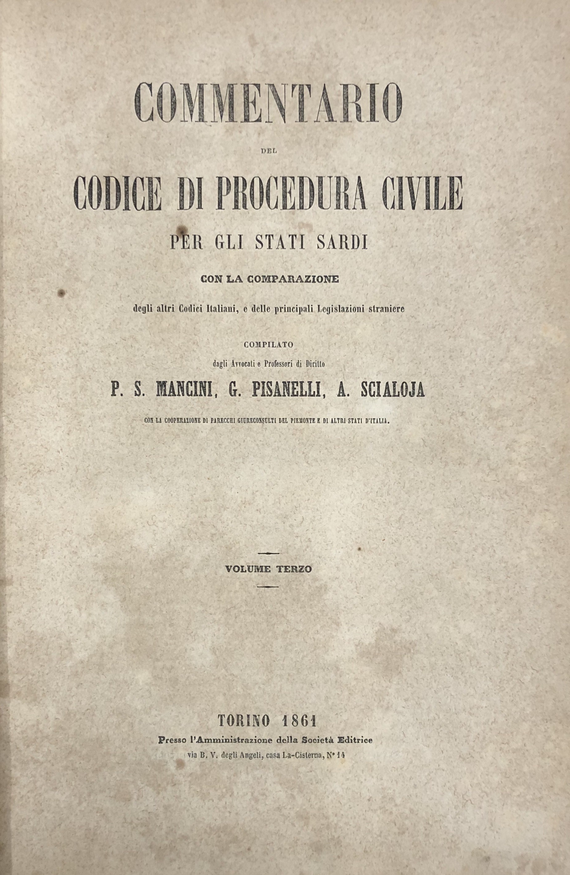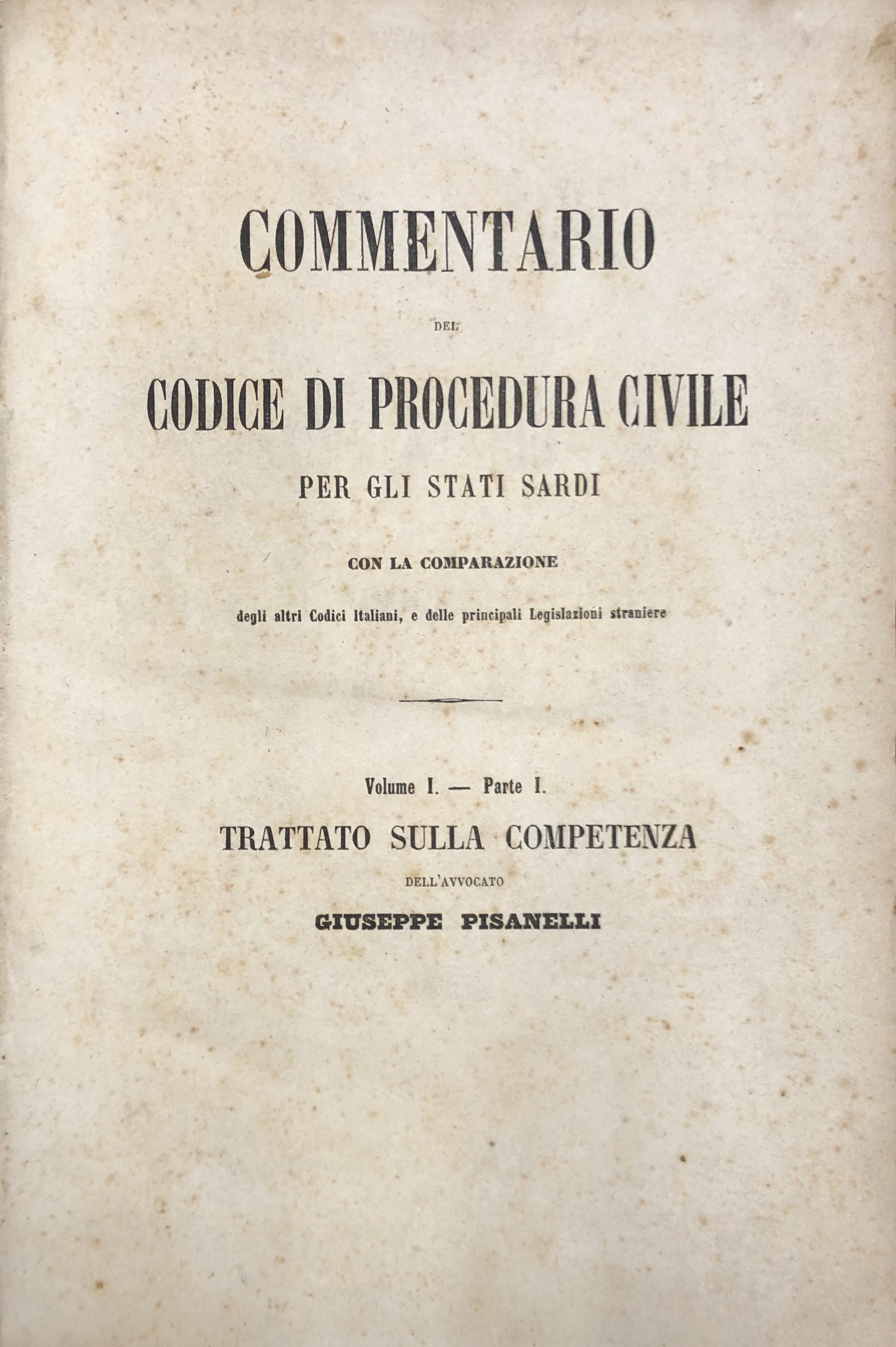 Commentario al Codice di Procedura civile per gli Stati Sardi con la comparazione degli altri Codici Italiani e delle principali Legislazioni straniere. Compilato dagli Avvocati e Professori di Diritto P.S. Mancini, G. Pisanelli, A. Scialoja con la cooperazione di parecchi giureconsulti del Piemonte e di altri Stati d'Italia. Vol. I, parte I - Giuseppe Pisanelli: Trattato sulla competenza; Vol. I, parte II - Antonio Scialoja: Procedura davanti i giudici di mandamento con un trattato sulle azionipossessorie; Vol. II - Pasquale Stanislao Mancini: Del modo di procedere dinanzi a' Tribunali provinciali e dinanzi a quelli di commercio; Vol. III - Luigi Borsari: Trattato delle prove; Vol. IV - Giuseppe Pisanelli: De' mezzi per impugnare le sentenze; Vol. V, parte I - Antonio Scialoja: Dell'esecuzione de' giudicati; Vol. V, parte II - Giuseppe Pisanelli: De' varii procedimenti speciali + Codice di procedura civile per gli Stati sardi con le sorgenti di ciascun articolo e le Relazioni ufficiali estratto dal commentario al medesimo Codice