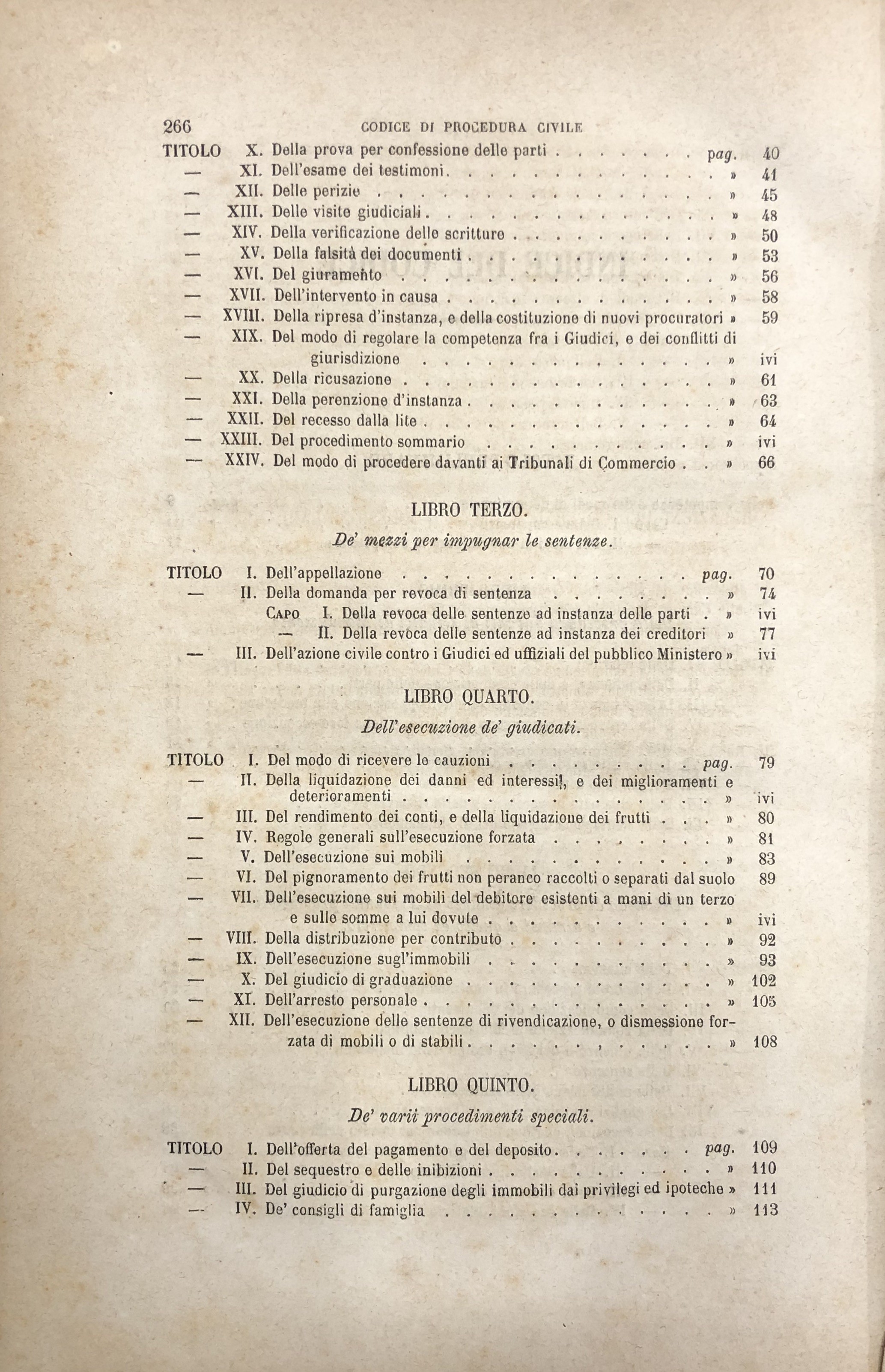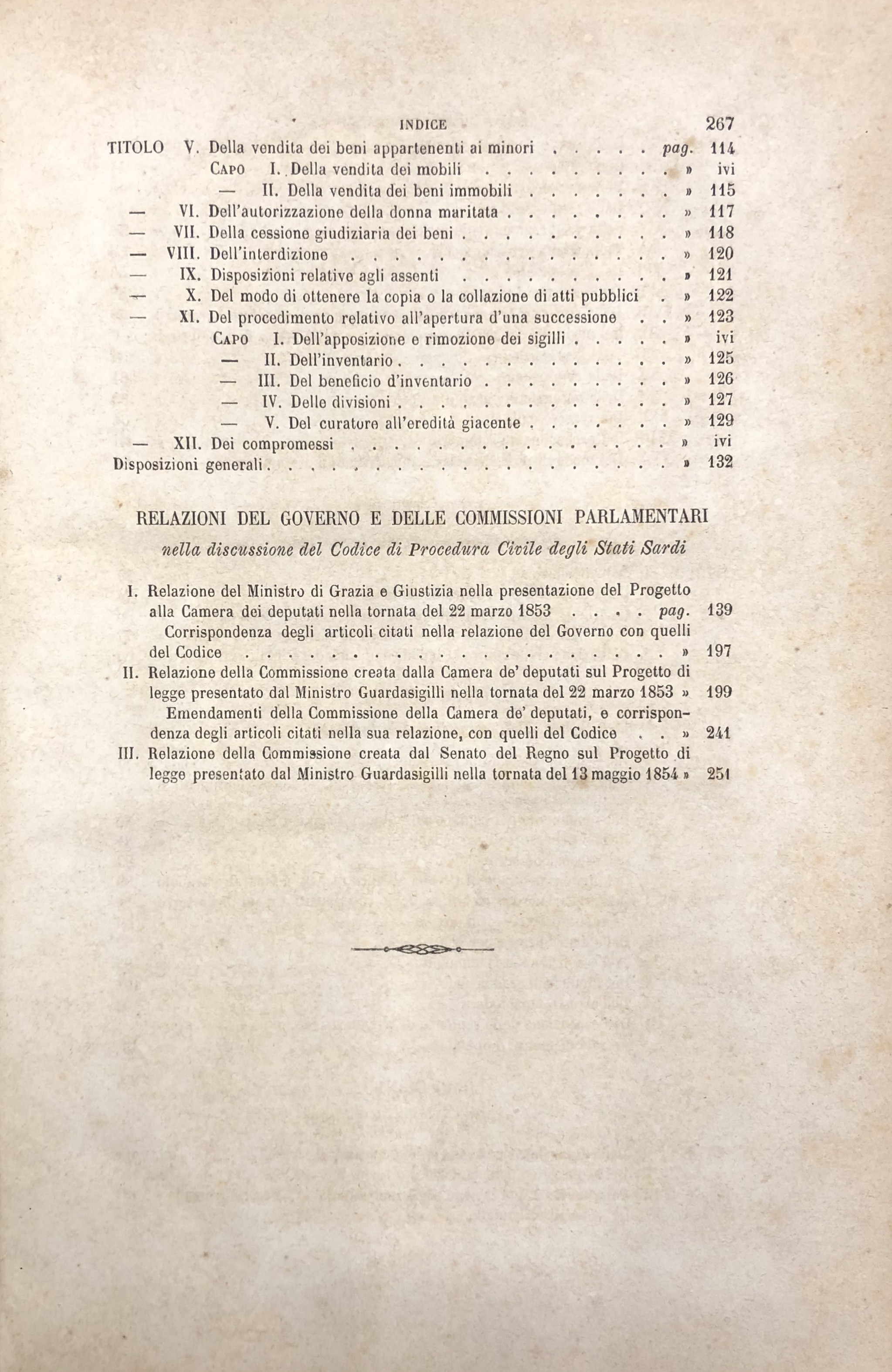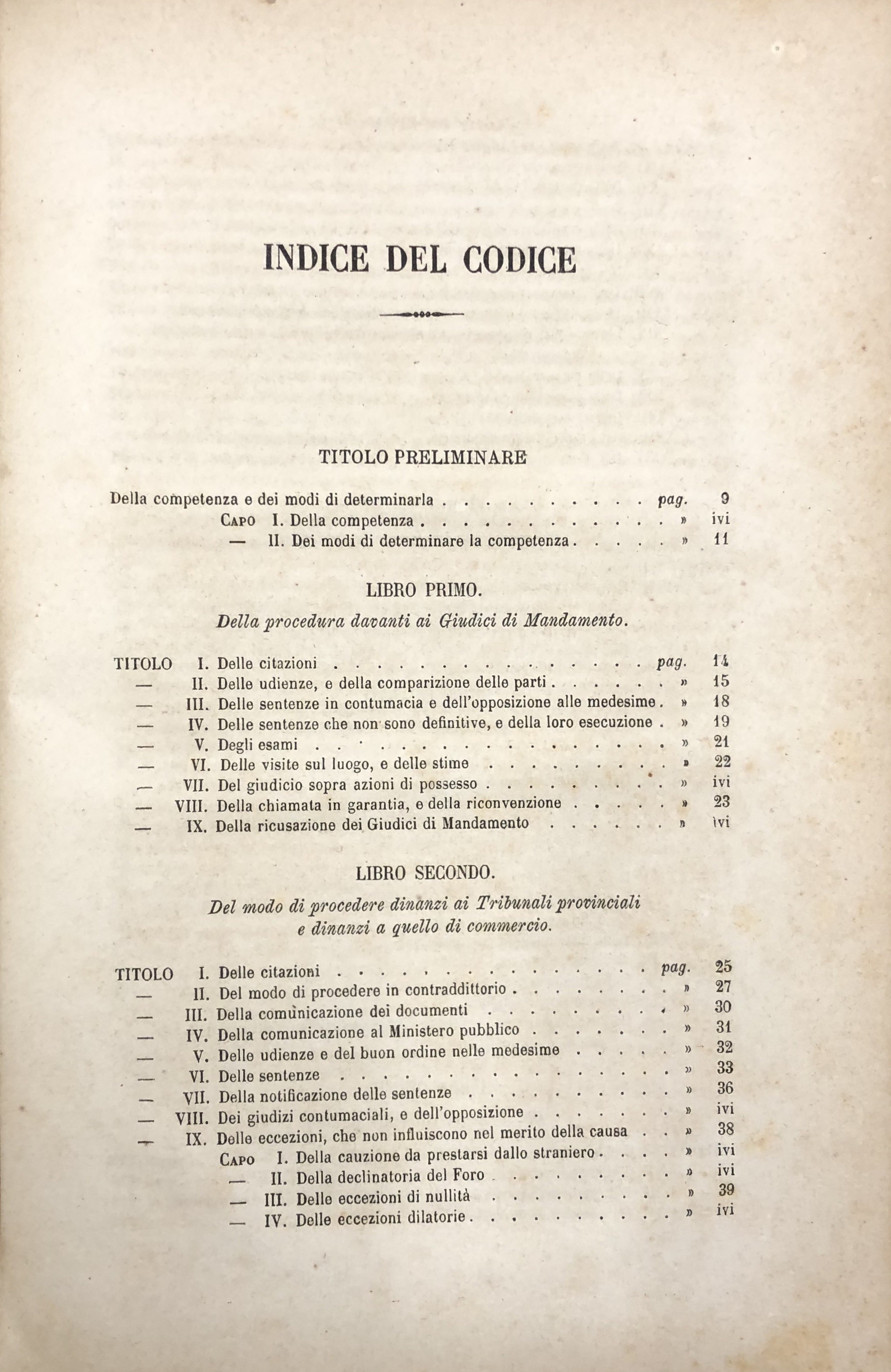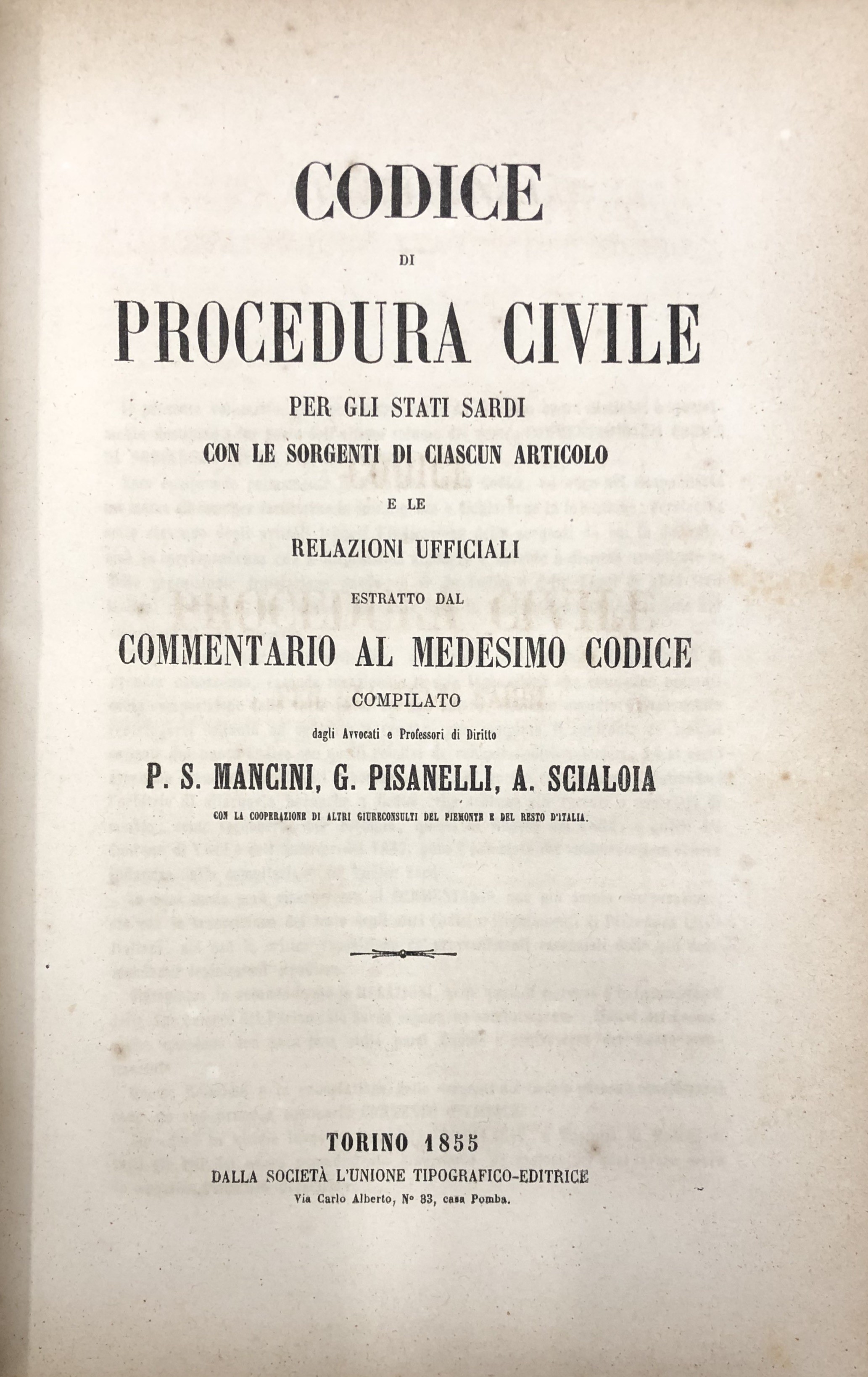 Commentario al Codice di Procedura civile per gli Stati Sardi con la comparazione degli altri Codici Italiani e delle principali Legislazioni straniere. Compilato dagli Avvocati e Professori di Diritto P.S. Mancini, G. Pisanelli, A. Scialoja con la cooperazione di parecchi giureconsulti del Piemonte e di altri Stati d'Italia. Vol. I, parte I - Giuseppe Pisanelli: Trattato sulla competenza; Vol. I, parte II - Antonio Scialoja: Procedura davanti i giudici di mandamento con un trattato sulle azionipossessorie; Vol. II - Pasquale Stanislao Mancini: Del modo di procedere dinanzi a' Tribunali provinciali e dinanzi a quelli di commercio; Vol. III - Luigi Borsari: Trattato delle prove; Vol. IV - Giuseppe Pisanelli: De' mezzi per impugnare le sentenze; Vol. V, parte I - Antonio Scialoja: Dell'esecuzione de' giudicati; Vol. V, parte II - Giuseppe Pisanelli: De' varii procedimenti speciali + Codice di procedura civile per gli Stati sardi con le sorgenti di ciascun articolo e le Relazioni ufficiali estratto dal commentario al medesimo Codice