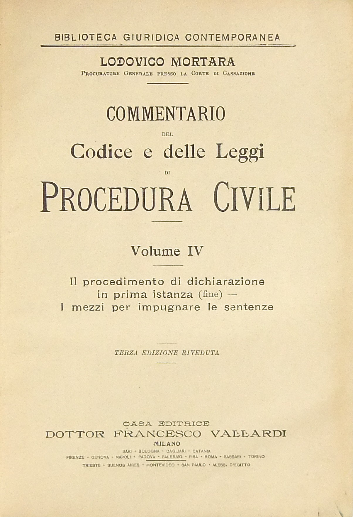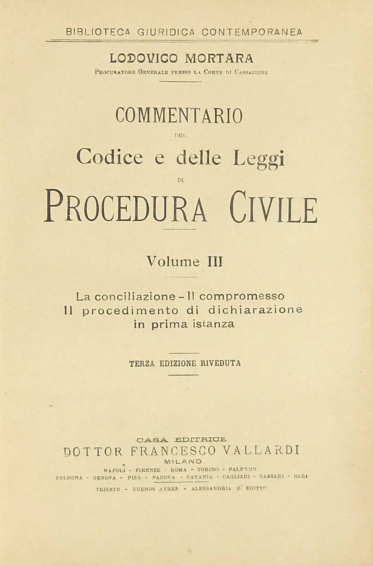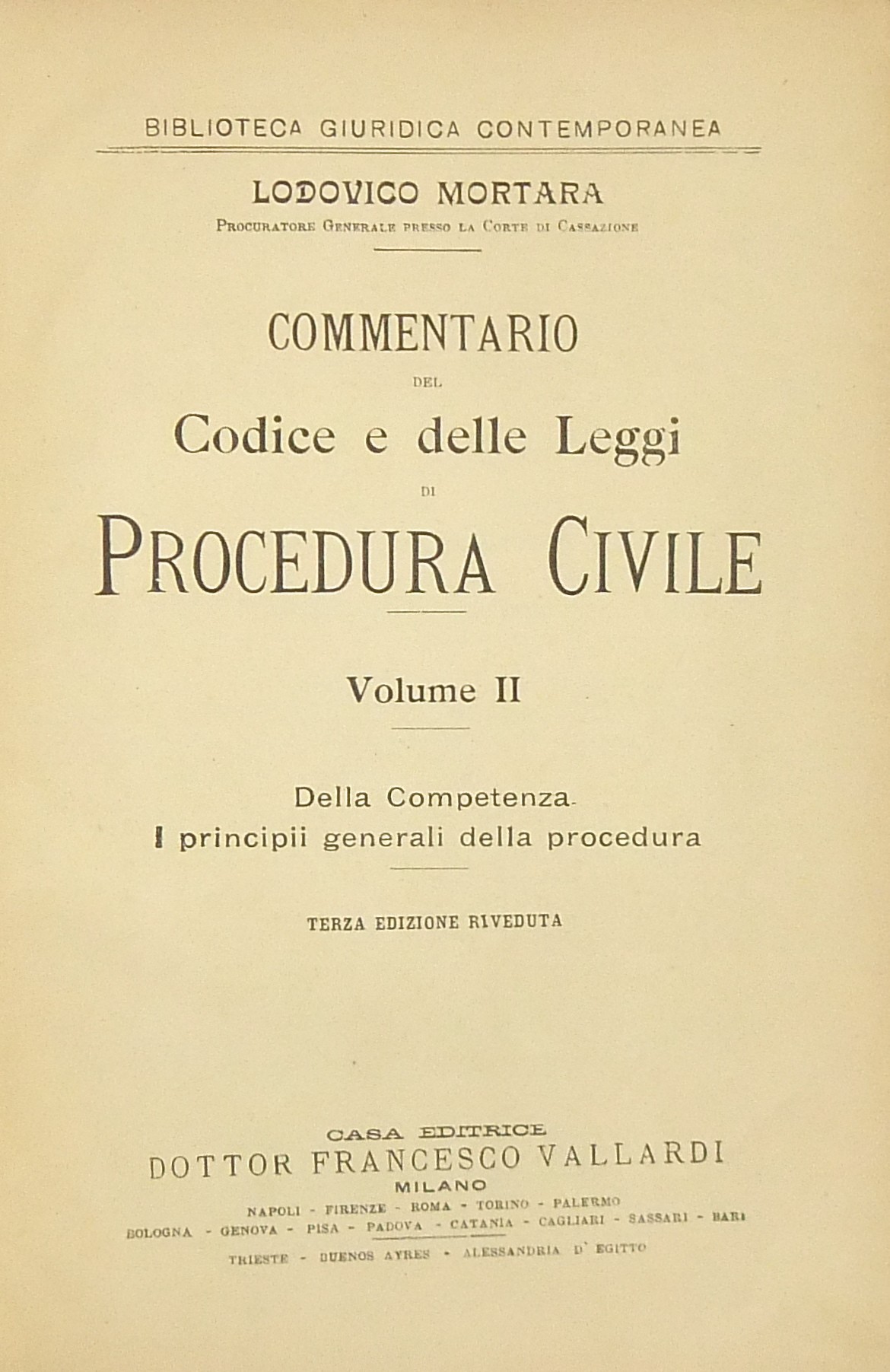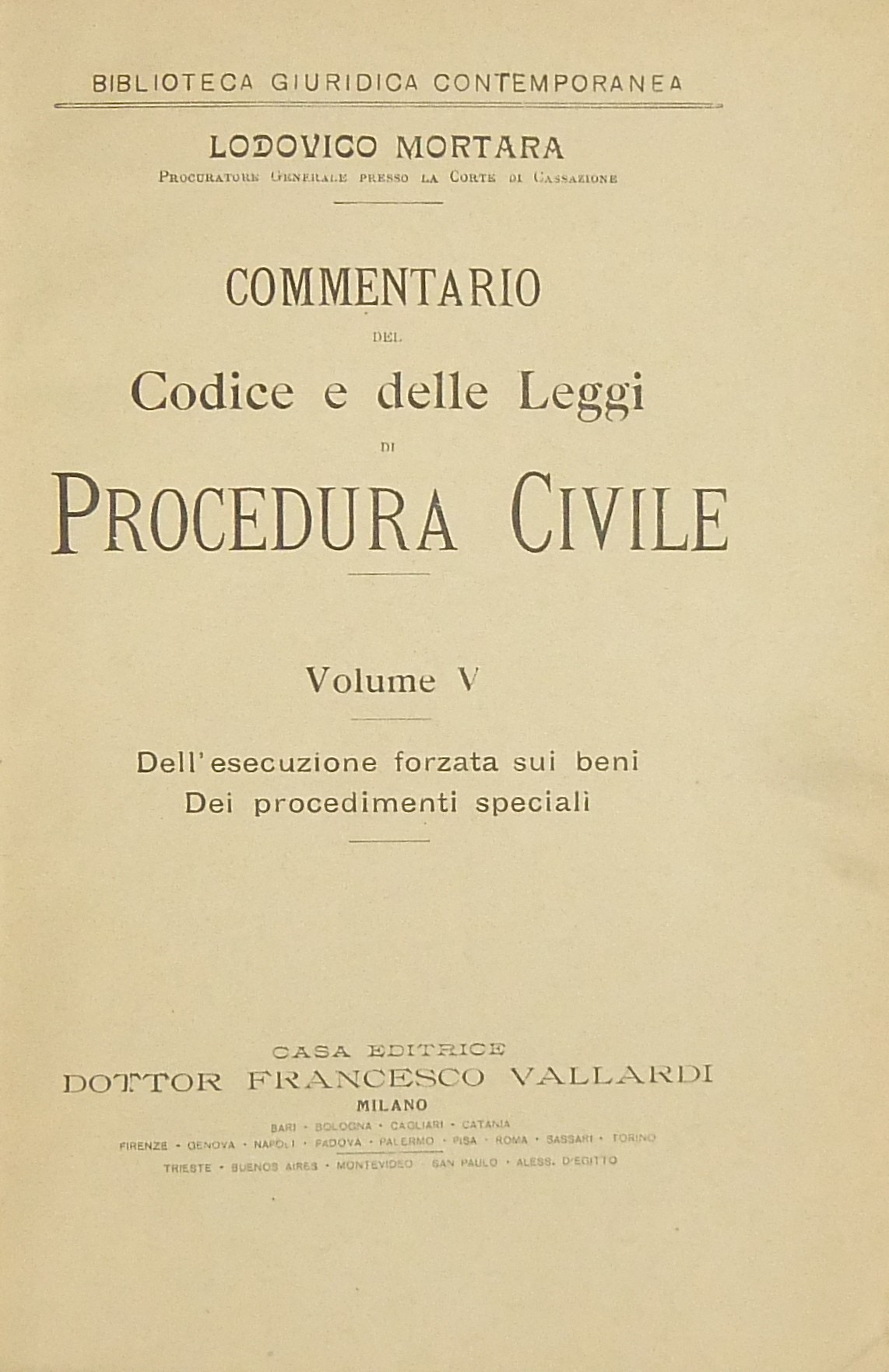 Commentario del Codice e delle Leggi di Procedura Civile. Vol. I - Teoria e sistema della giurisdizione civile. Vol. II - Della competenza. I principii generali della procedura. Vol. III - La conciliazione. Il compromesso. Il procedimento di dichiarazione in prima istanza. Vol. IV - Il procedimento di dichiarazione in prima istanza (fine). I mezzi per impugnare le sentenze. Vol. V - Dell'esecuzione forzata sui beni. Dei procedimenti speciali