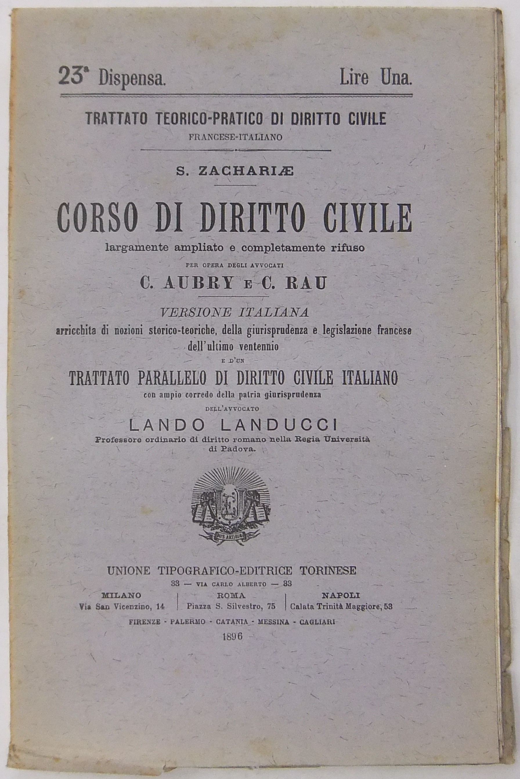 Corso di diritto civile largamente ampliato e completamente rifuso per opera degli avvocati C.Aubry e C.Rau. Versione italiana arricchita di nozioni storico-teoretiche della giurisprudenza e legislazione francese dell'ultimo ventennio ne d'un trattato parallelo di diritto civile italiano con ampio corredo della patria giurisprudenza dell'avvocato Lando Landucci