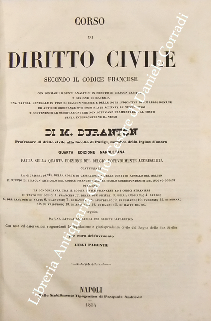 Corso di diritto civile secondo il codice francese. Con sommarii o sunti analitici in fronte di ciascun capitolo e sezione di materia. Una tavola generale in fine di ciascun volume e delle note indicative delle leggi romane ed antiche ordinanze ove sono state attinte le nuove leggi e contenente le osservazioni che non potevano frammettersi al testo senza interromperne il nesso. Contenente la giurisprudenza della Corte di Cassazione e delle Corti di Appello del Belgio il rinvio di ciascun articolo del codice francese all'articolo corrispondente del nuovo codice di Olanda la concordanza tra il codice civile francese ed i codici stranieri il testo dei codici 1) francese 2) delle Due Sicilie 3) della Luigiana 4) sardo 5) del Cantone di Vaud 6) olandese 7) di Baviera 8) austriaco 9) prussiano 10) svedese 11) di Berna 12) di Friburgo 13) di Argovia 14) di Bade 15) di Haiti ecc. ecc. seguita da una tavola analitica per ordine alfabetico con note e osservazioni riguardanti la legislazione e giurisprudenza civile del Regno delle Due Sicilie per cura dell'Avv. Luigi Parente