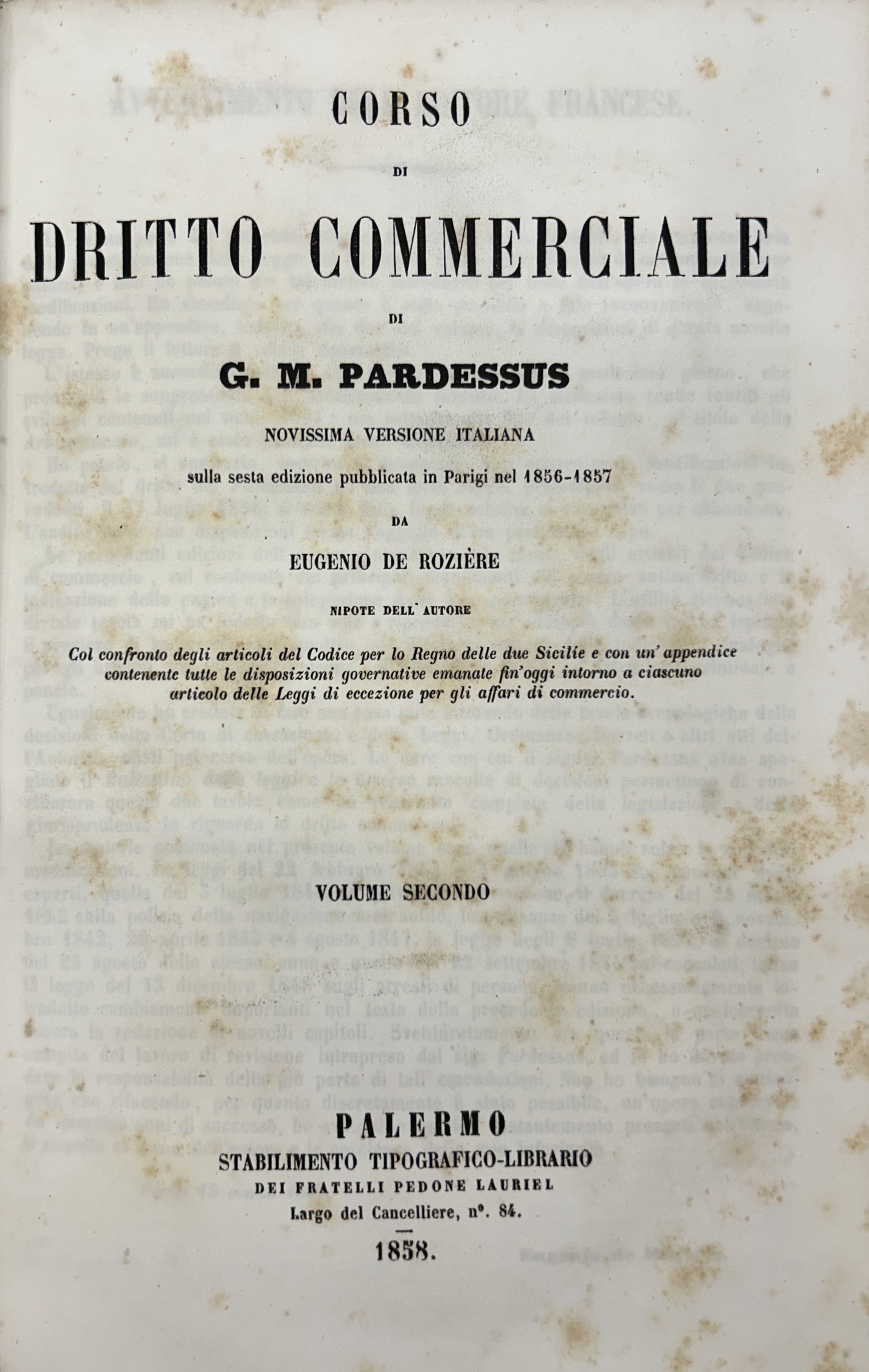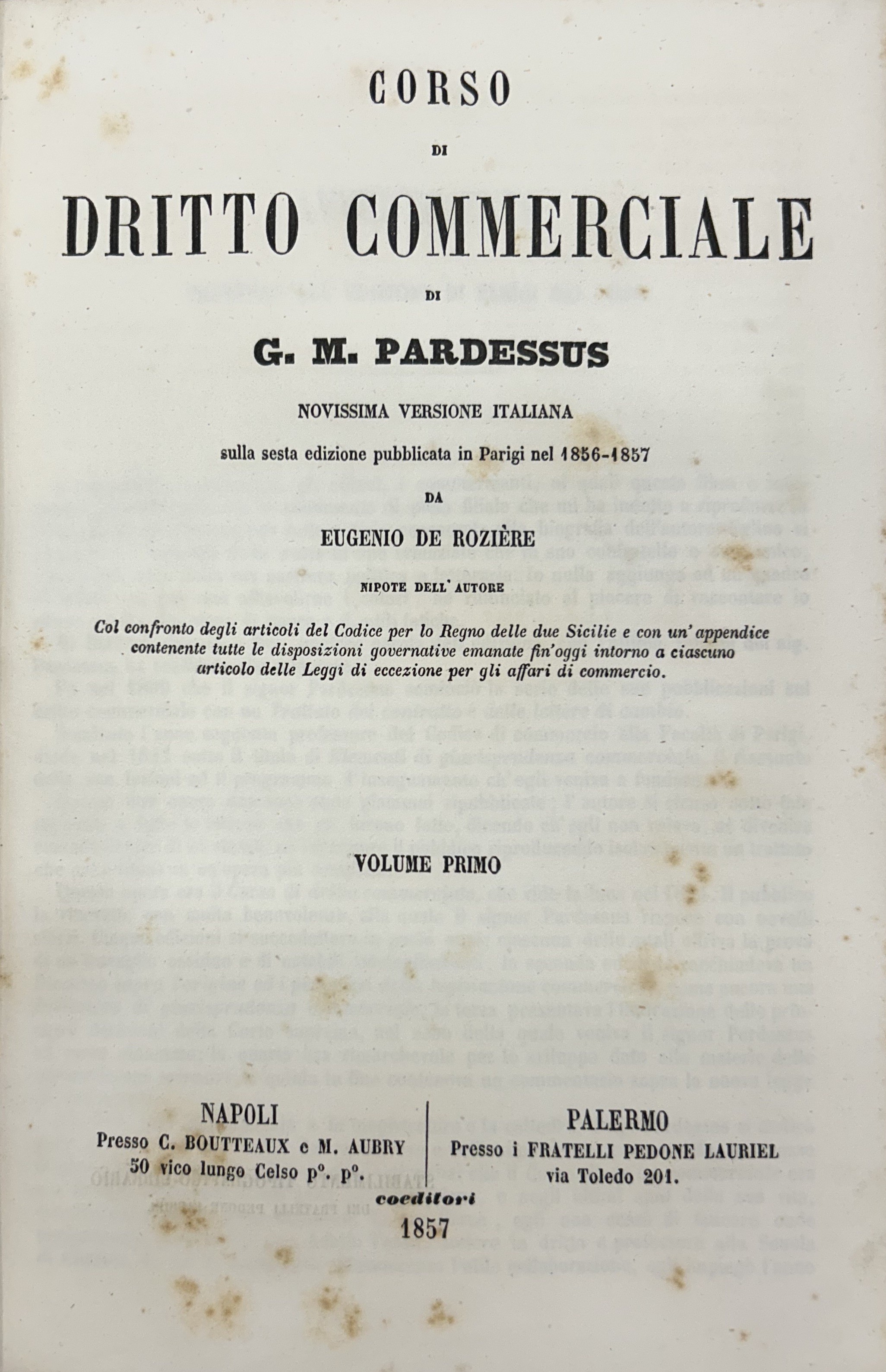 Corso di diritto commerciale. Col confronto degli articoli del Codice per lo Regno delle Due Sicilie e con un'appendice contenente tutte le disposizioni governative emanate fin'oggi intorno a ciascuno articolo delle Leggi di eccezione per gli affari di commercio