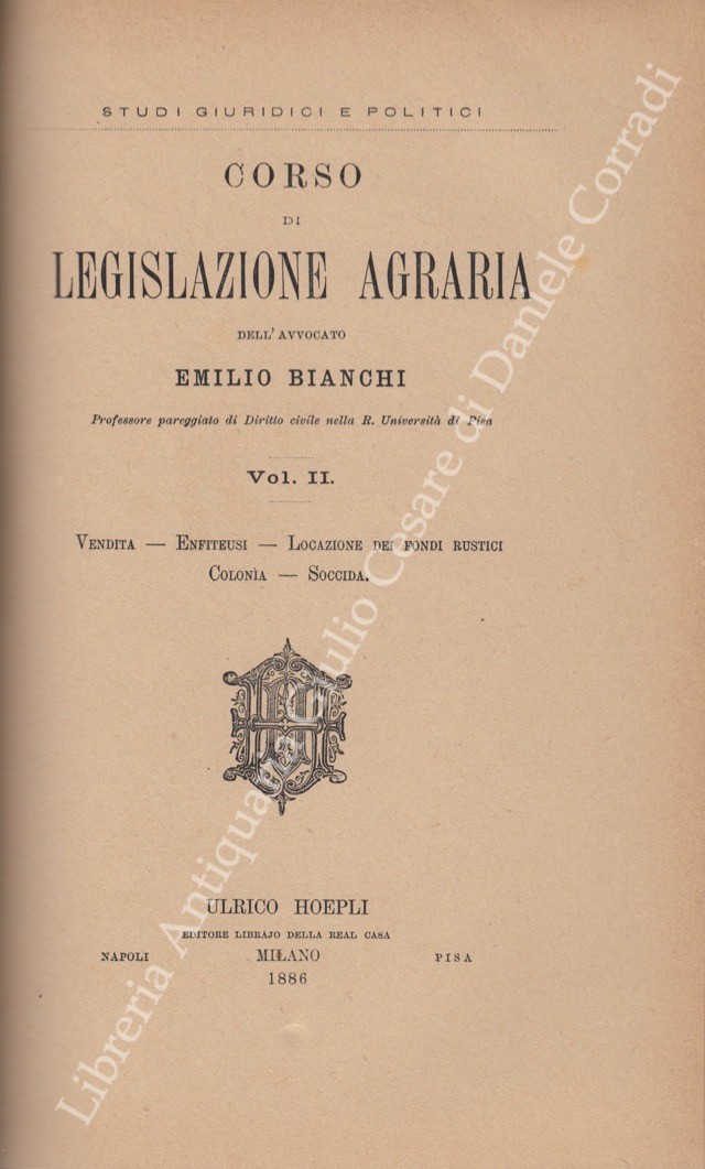 Corso di legislazione agraria. Vol. I - Distinzione di beni. Proprietà. Sue limitazioni. Servitù. Consorzi; Vol. II - Vendita. Enfiteusi. Locazione dei fondi rustici. Colonìa. Soccida