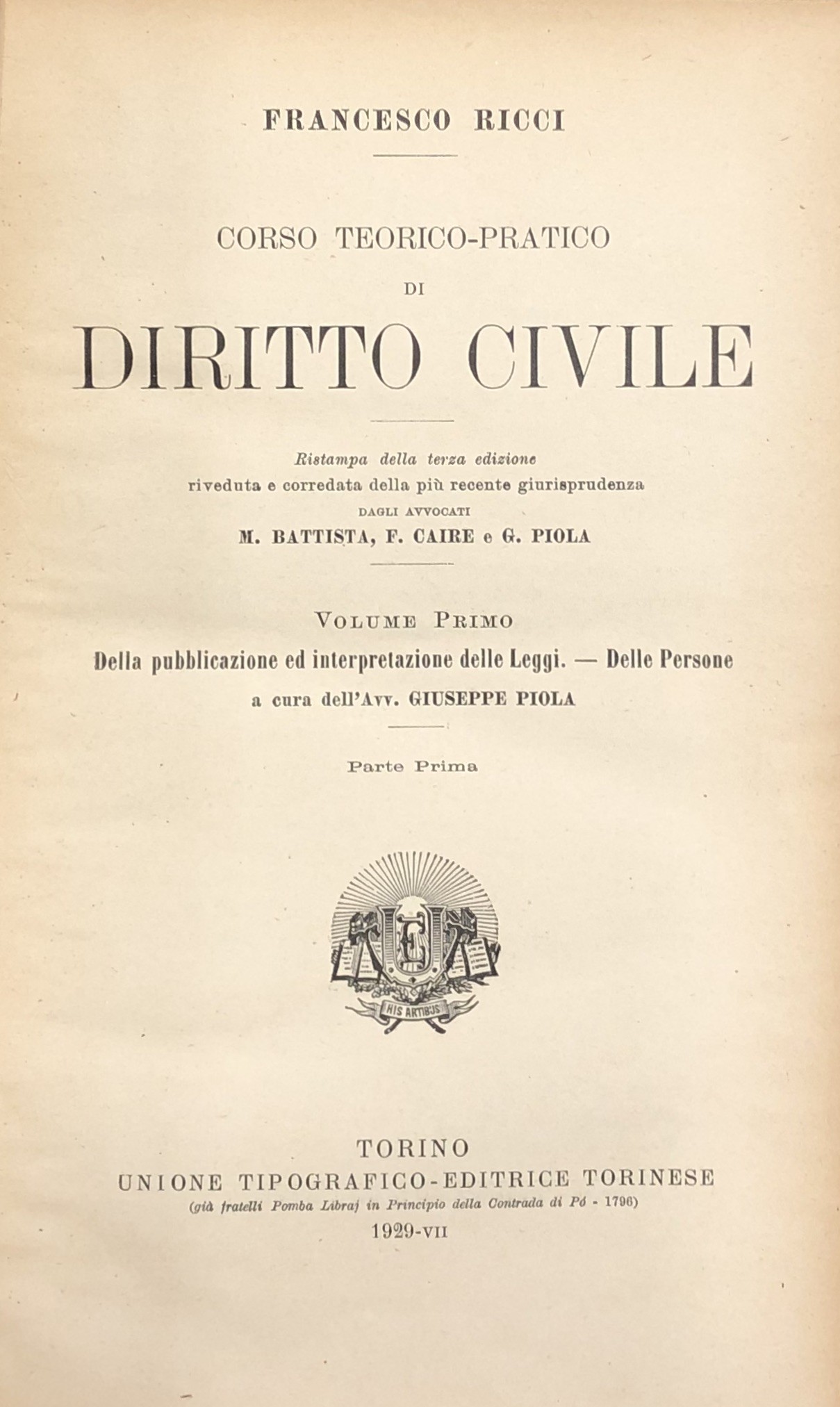 Ristampa della terza edizione riveduta e corredata della più recente Giurisprudenza dagli Avvocati M. Battista, F. Caire e G. Piola