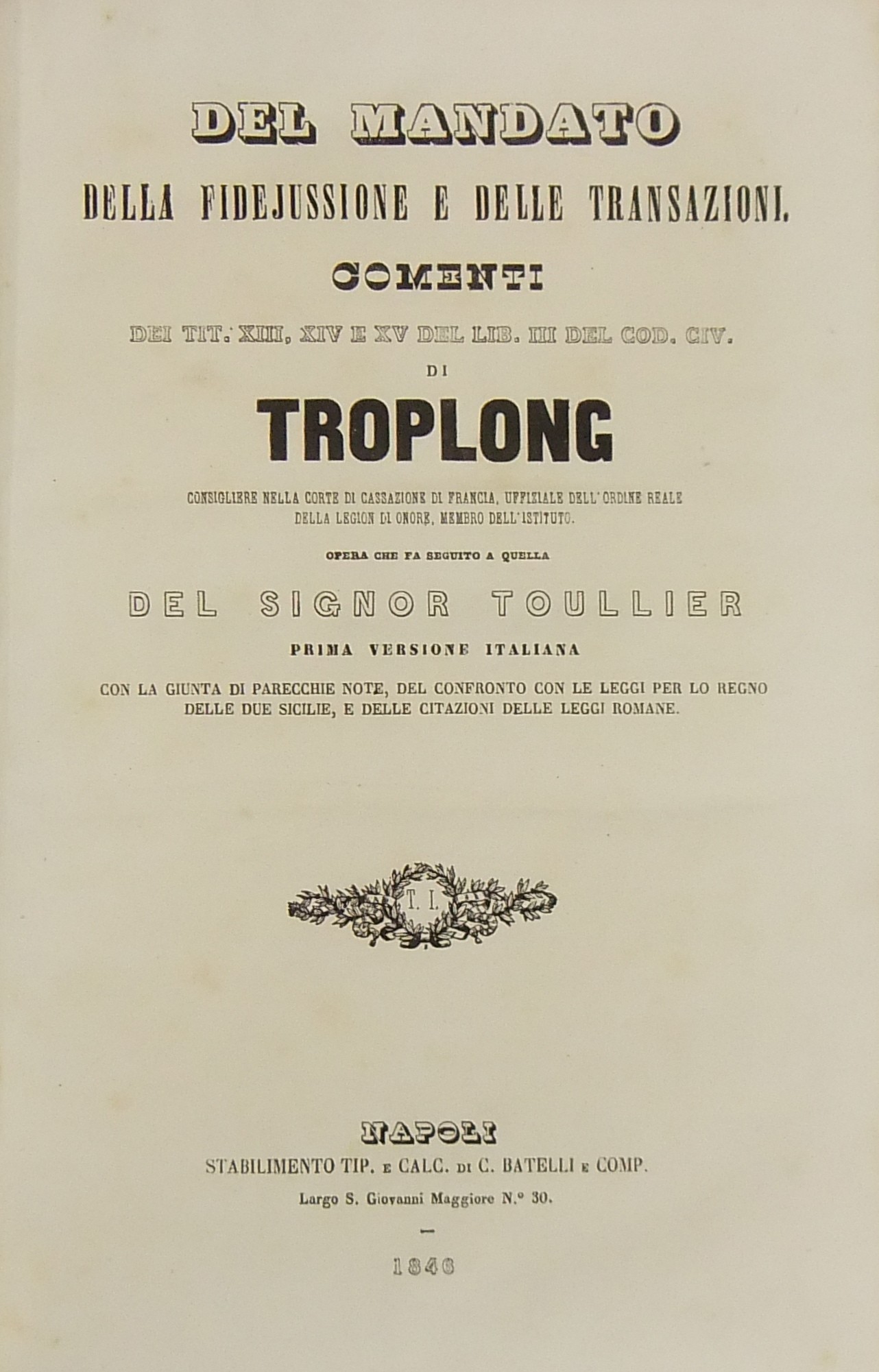 Del mandato della fidejussione e delle transazioni. Comenti dei Tit. XIII, XIV e XV del Lib. III del Cod. Civ. Opera che fa seguito a quella del signor Toullier. Prima versione italiana con la giunta di parecchie note del confronto con le leggi per lo Regno delle Due Sicilie e delle citazioni delle leggi romane