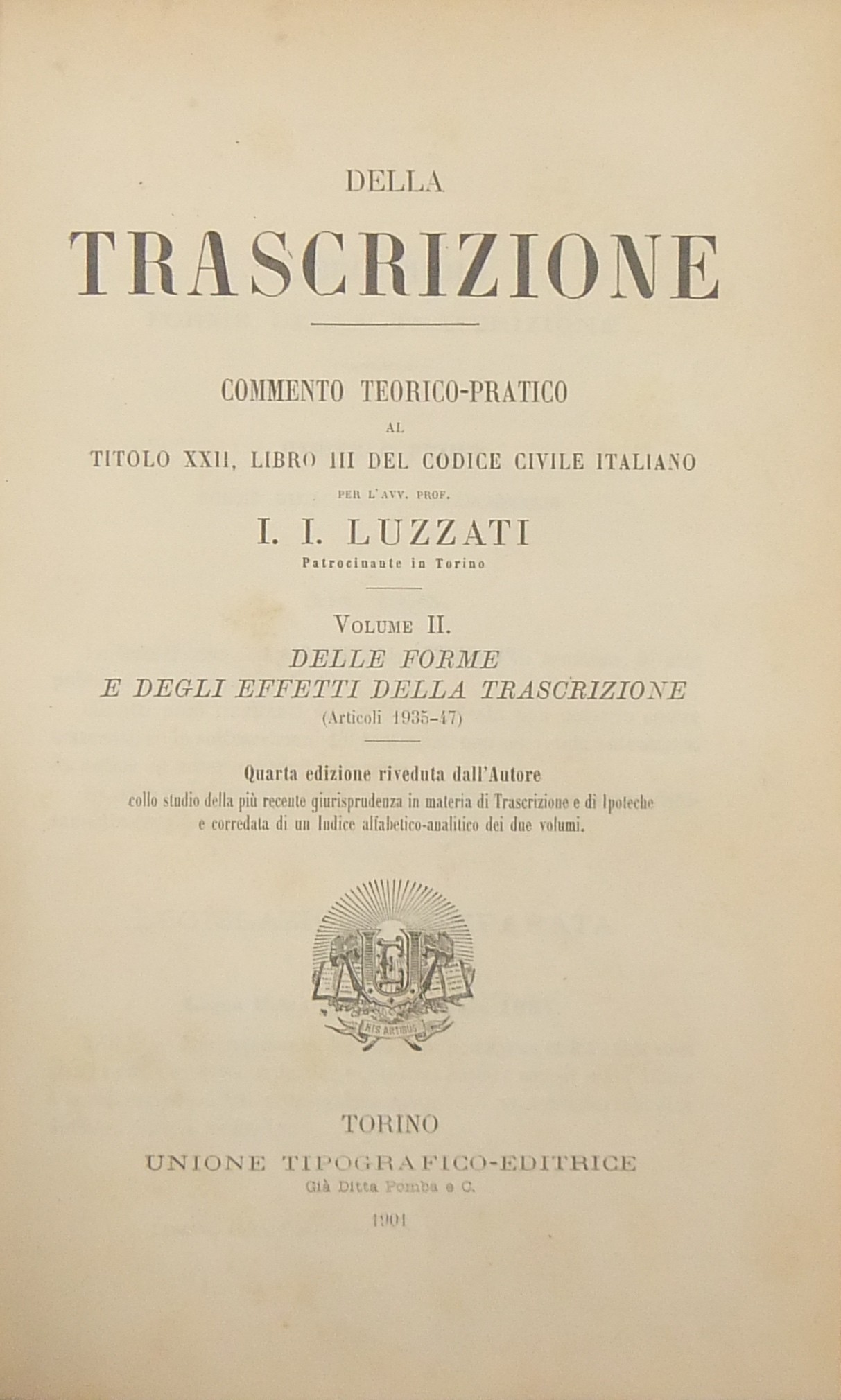 Quarta edizione riveduta dall'autore collo studio della più recente giurisprudenza in materia di Trascrizione e di Ipoteche e corredata di un Indice alfabetico-analitico dei due volumiLuogo: Torino
