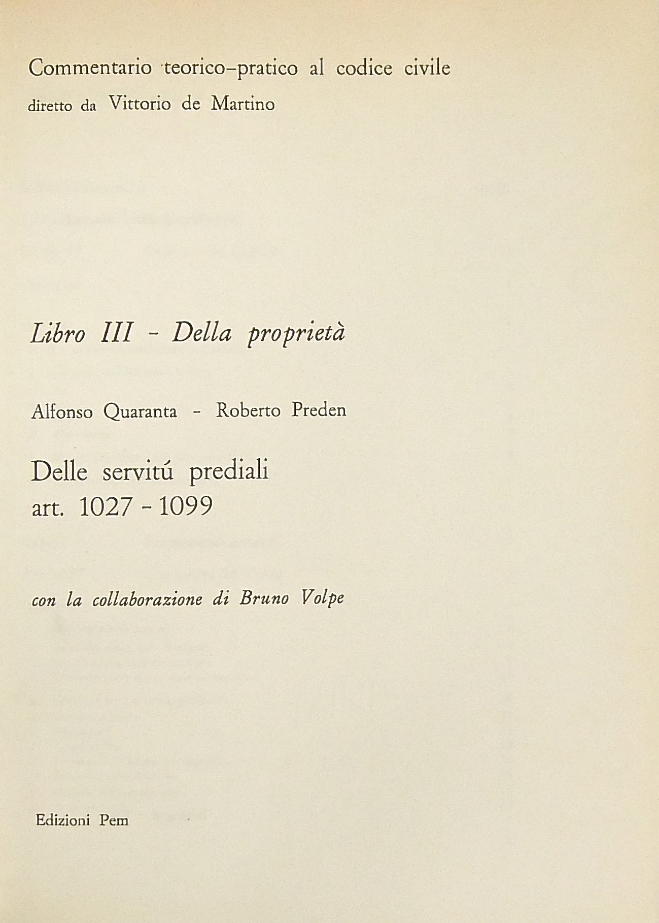 Delle servitù prediali. Art. 1027-1099. Con la collaborazione di Bruno Volpe