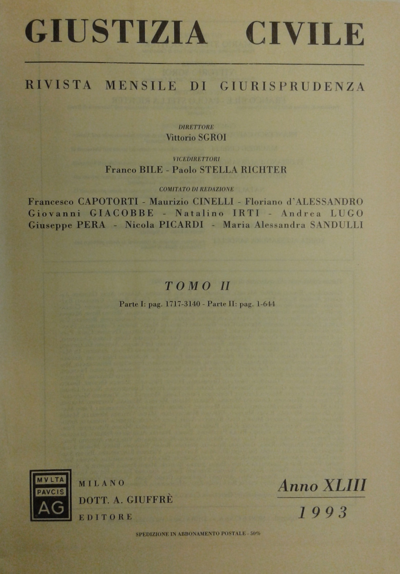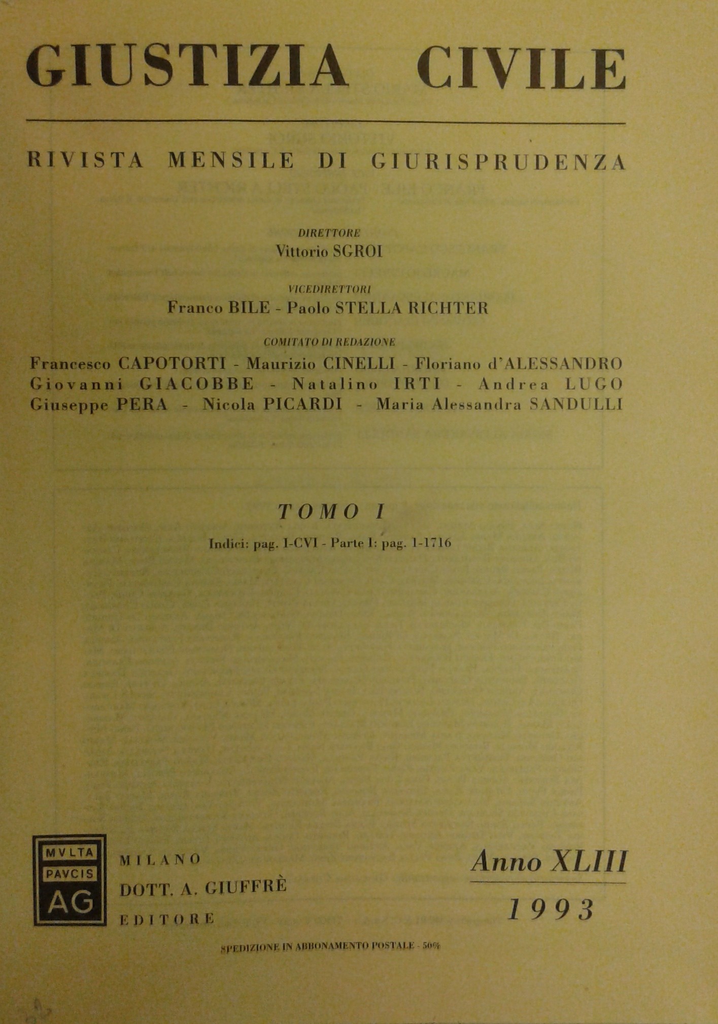 Giustizia Civile. Rivista mensile di giurisprudenza. Anno XLIII - 1993. Comitato di redazione: F. Bile, F. Capotorti, M. Cinelli, F. d'Alessandro, G. Giacobbe, N. Irti, A. Lugo, G. Pera, N. Picardi, M.A. Sandulli, V. Sgroi