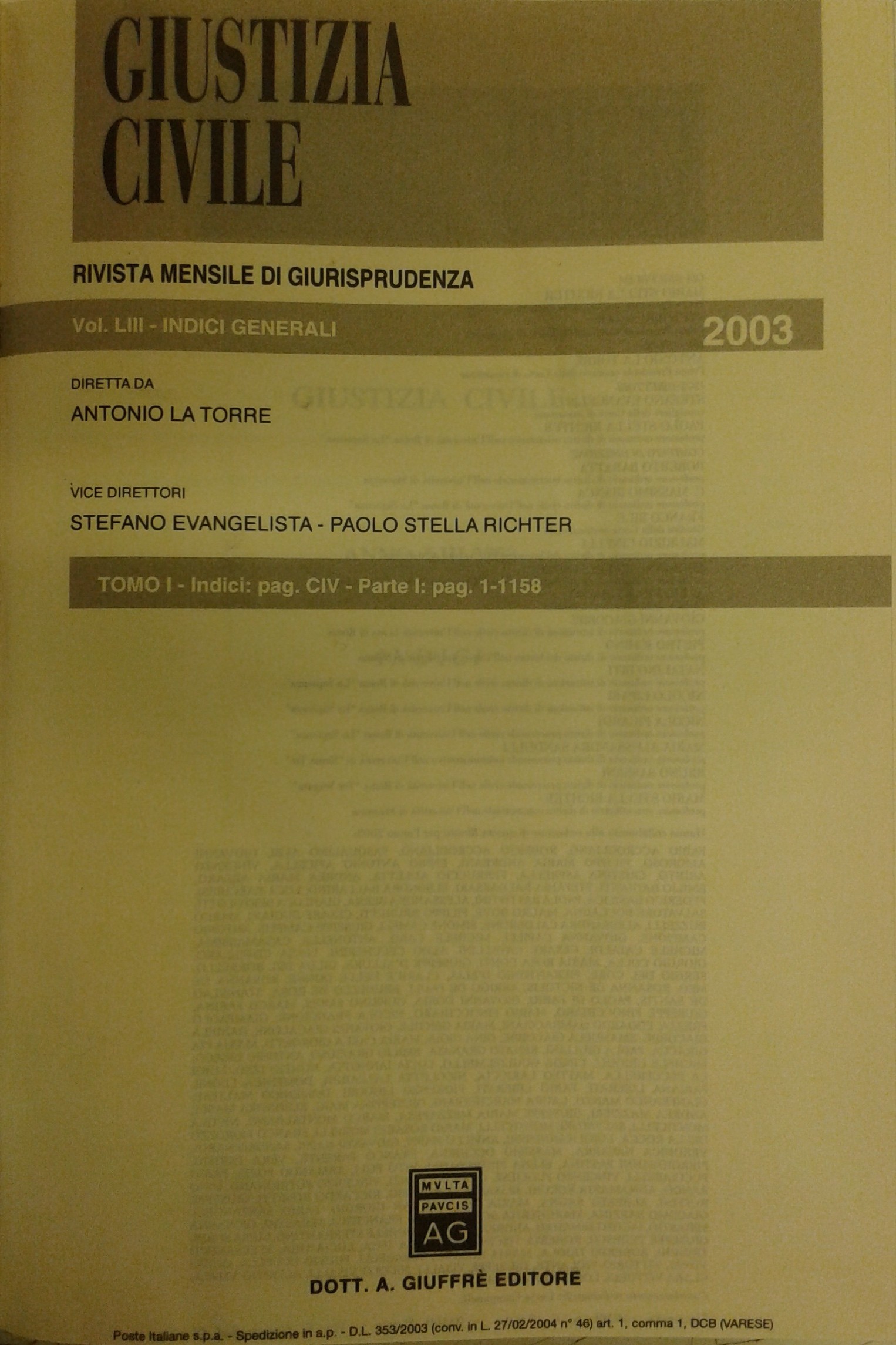 Giustizia Civile. Rivista mensile di giurisprudenza. Anno LIII - 2003. Comitato di redazione: S. Evangelista, A. La Torre, P. Stella Richter