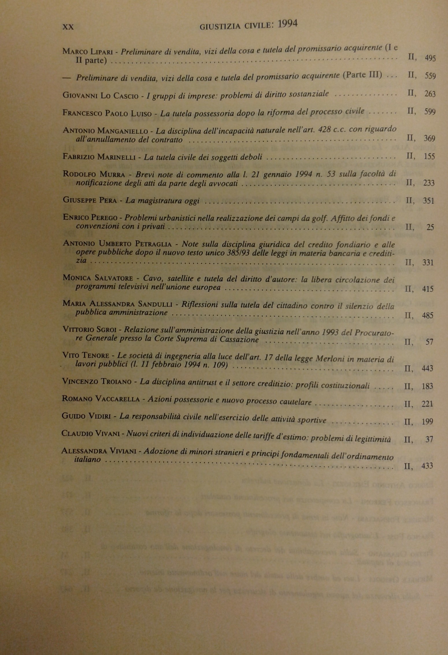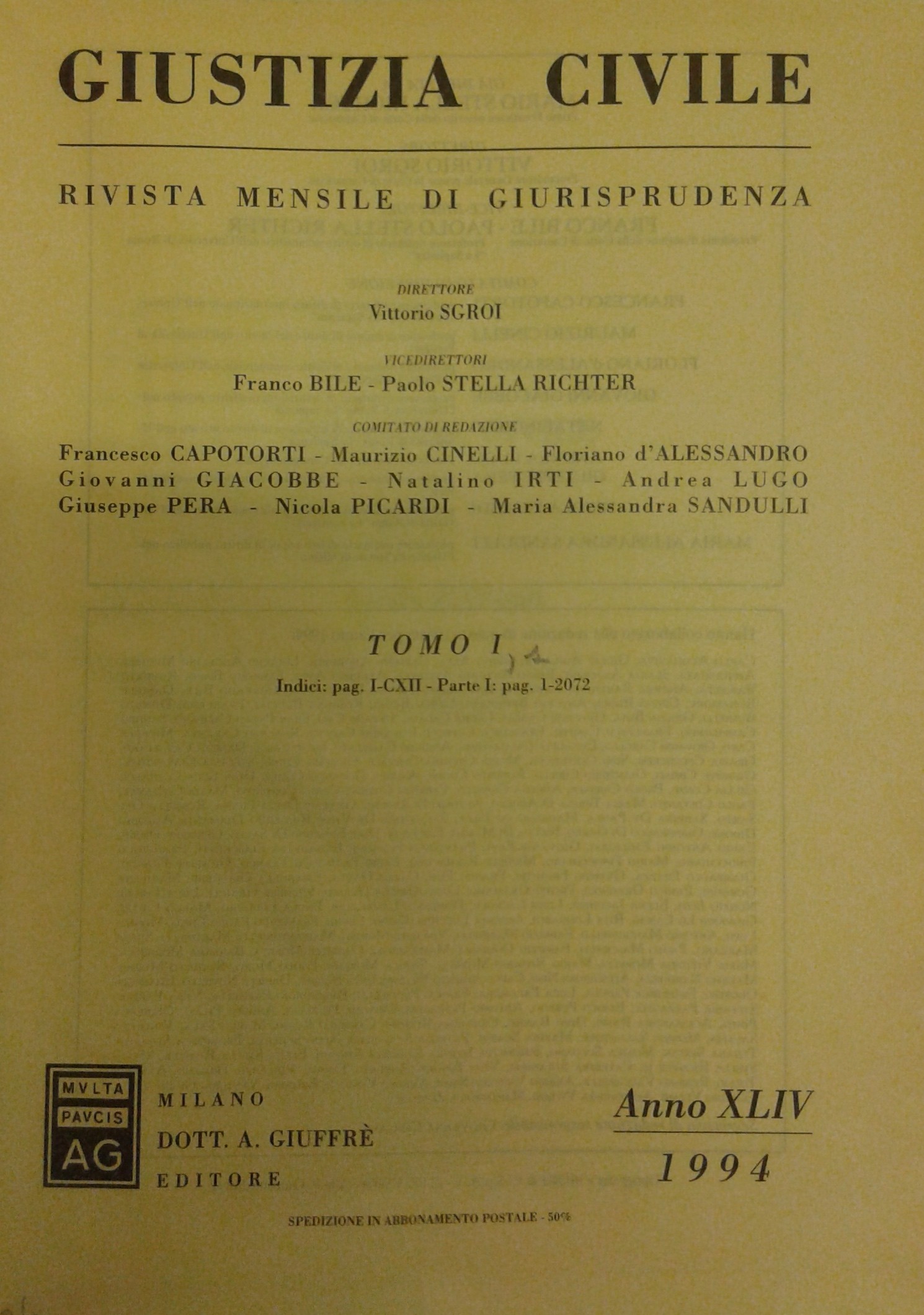 Giustizia Civile. Rivista mensile di giurisprudenza. Anno XLIV - 1994. Comitato di redazione: F. Bile, F. Capotorti, M. Cinelli, F. d'Alessandro, G. Giacobbe, N. Irti, A. Lugo, G. Pera, N. Picardi, M.A. Sandulli, P. Stella Richter, V. Sgroi