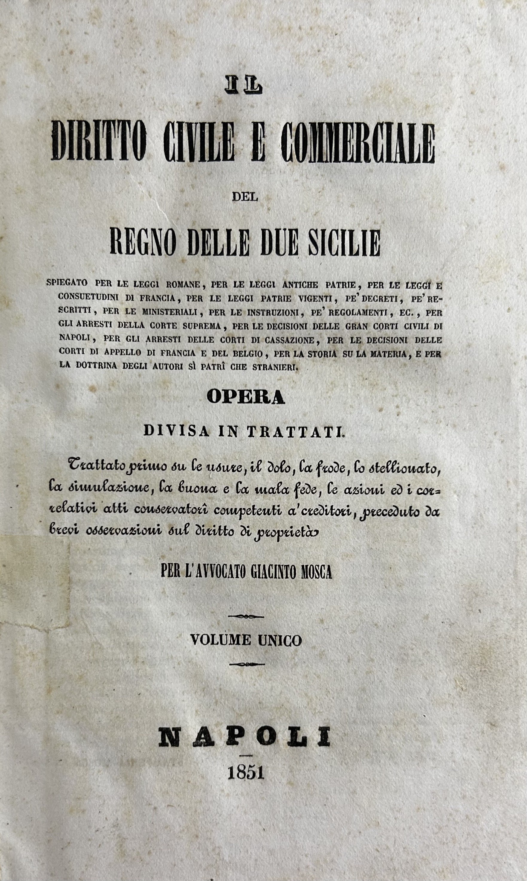 Il diritto civile e commerciale del Regno delle Due Sicilie... Opera divisa in trattati. Trattato primo su le usure, il dolo, la frode, lo stellionato, la simulazione, la buona e la mala fede, le azioni ed i correlativi atti conservatori competenti a creditori, preceduto da brevi osservazioni sul diritto di proprietÃ