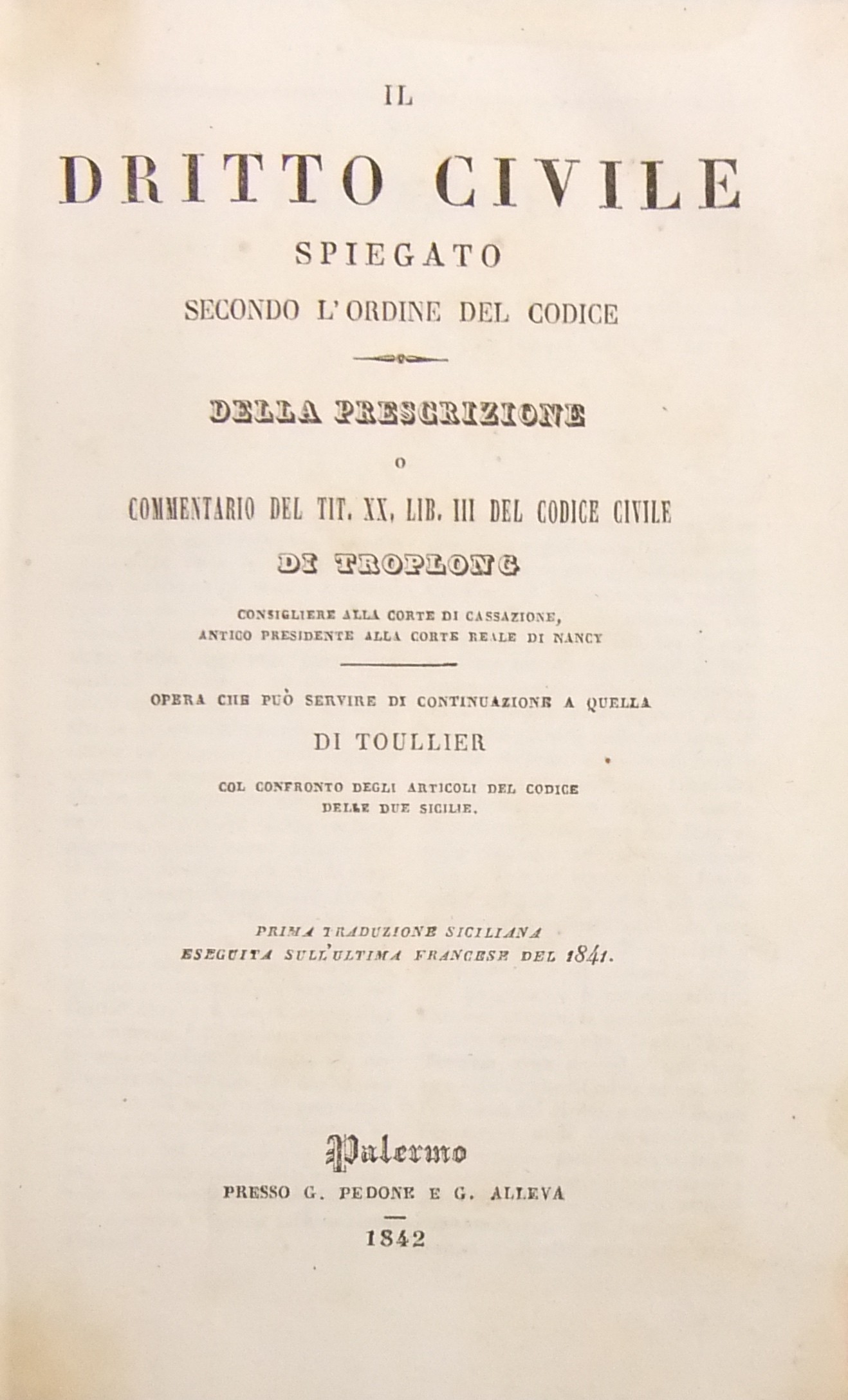 Il dritto civile spiegato secondo l'ordine del Codice. Della prescrizione o commentario del Tit. XX Lib. III del Codice Civile. Opera che può servire di continuazione a quella di Toullier col confronto degli articoli del Codice delle Due Sicilie. Prima traduzione siciliana eseguita sull'ultima francese del 1841