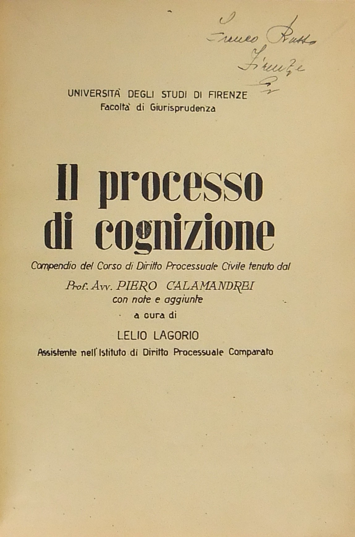 Il processo di cognizione. Compendio del corso di diritto processuale civile tenuto dal Prof.Avv. Piero Calamandrei con note e aggiunte a cura di Lelio Lagorio