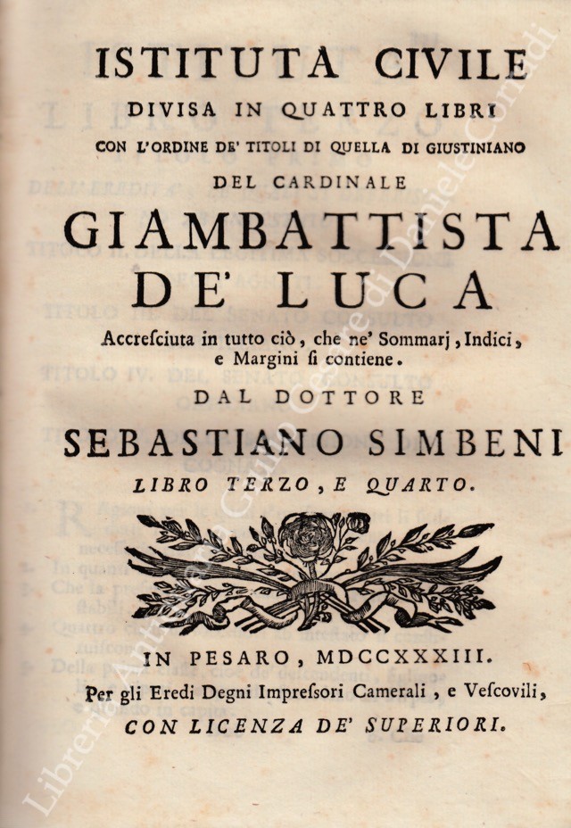 Istituta civile divisa in quattro libri con l'ordine de' titoli di quella di Giustiniano accresciuta in tutto ciò, che ne' sommarj, indici e margini si contiene. Dal dottore Sebastiano Simbeni De Rimini sotto la protezione della Serenissima Repubblica di Lucca alla quale reverentemente s'omilia