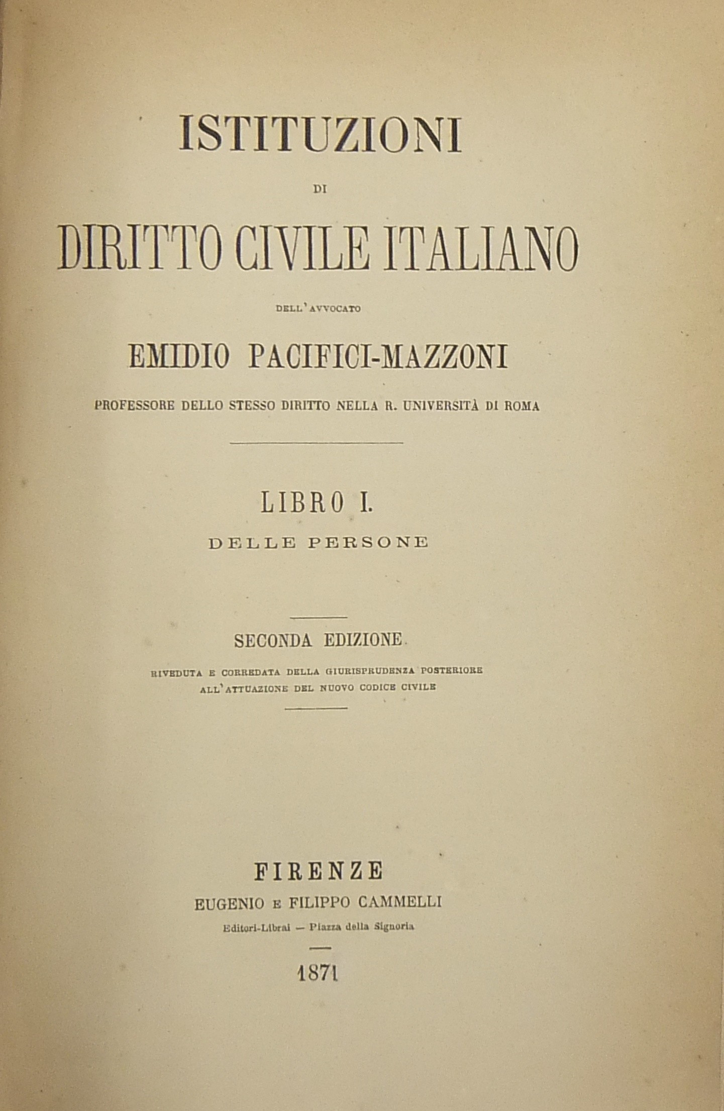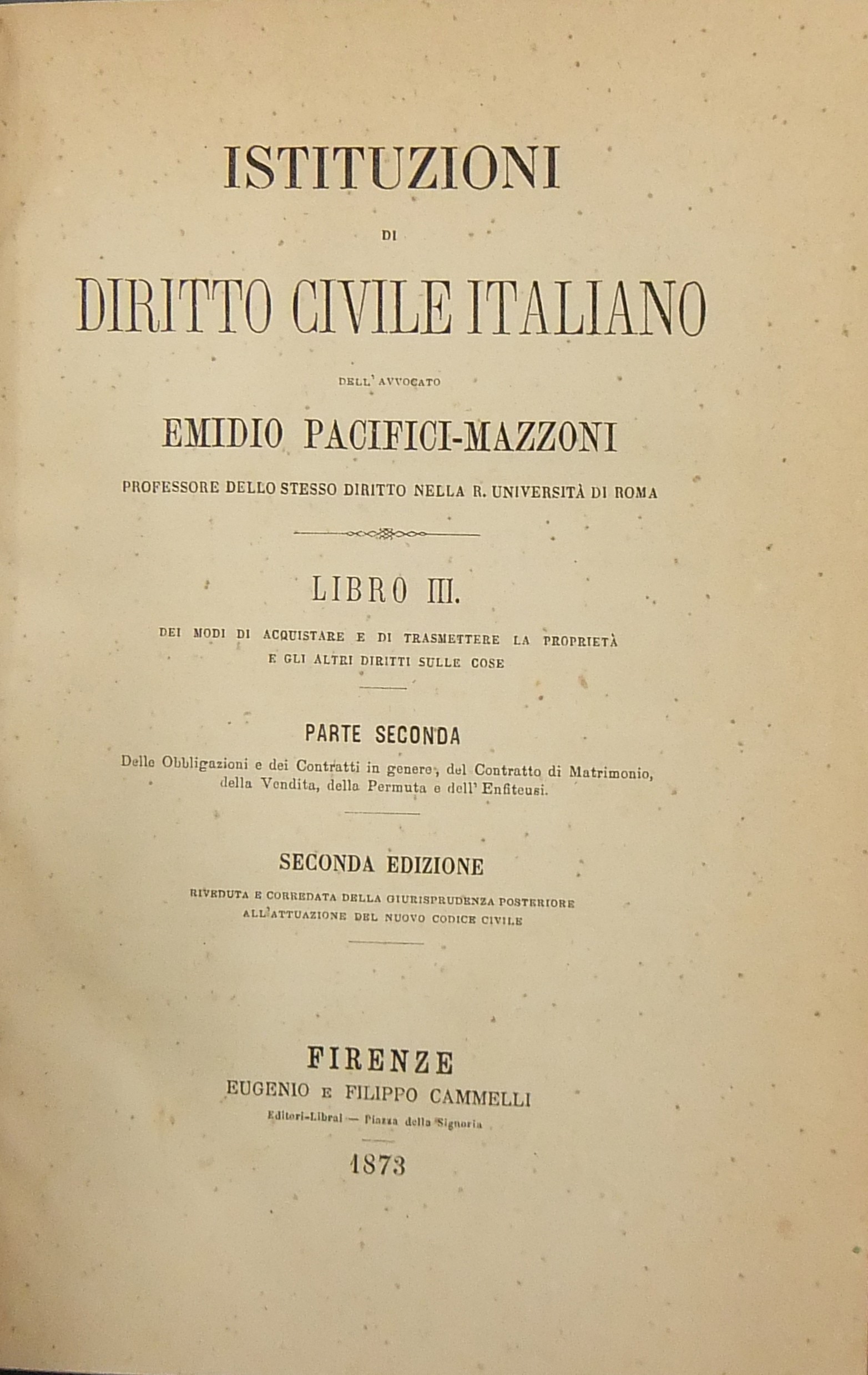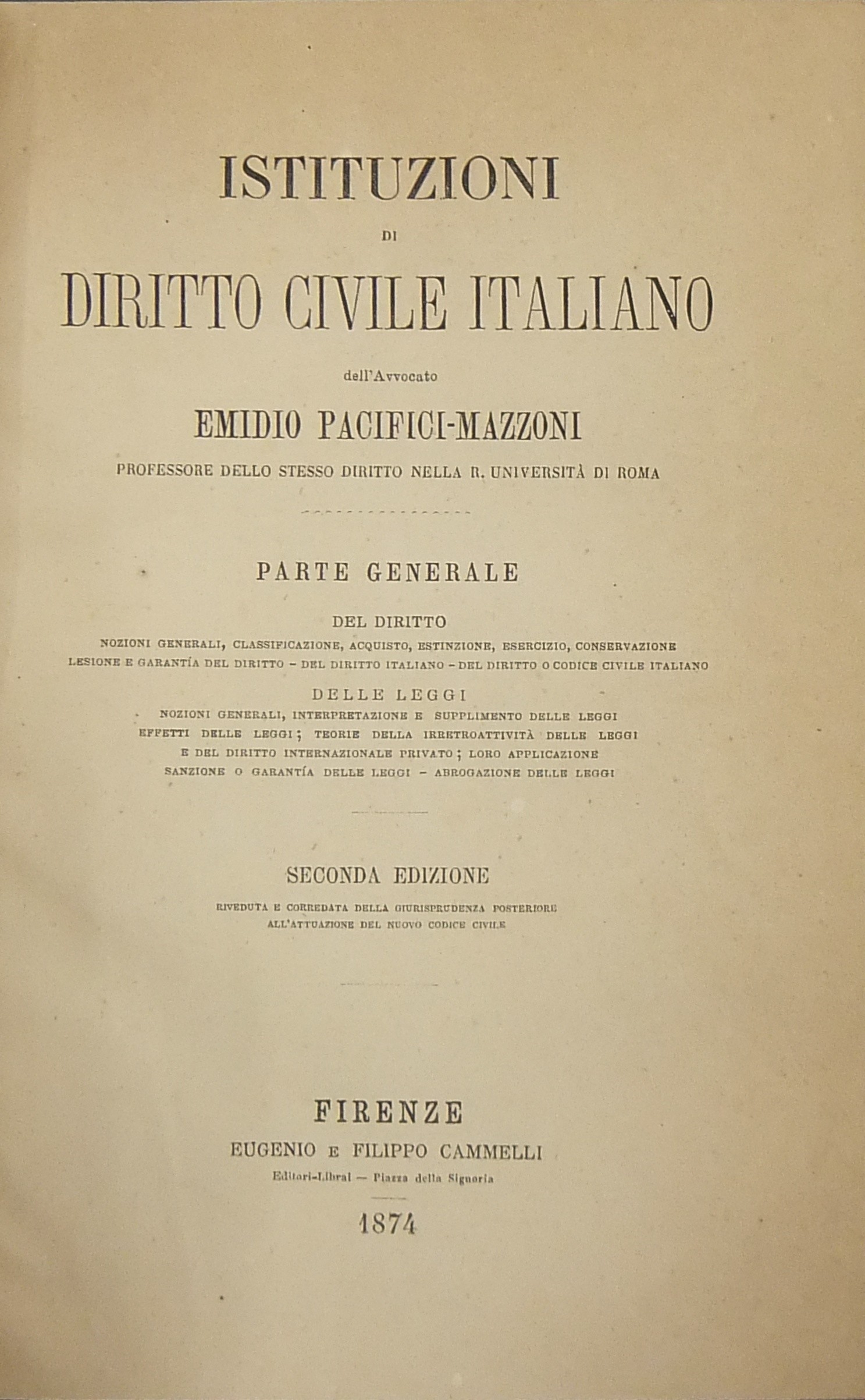 Istituzioni di diritto civile italiano. Parte generale del diritto, nozioni generali, classificazione, acquisto, estinzione, esercizio, conservazione, lesione e garanzia del diritto. Del diritto italiano. Del diritto o codice civile italiano. Delle leggi, nozioni generali, interpretazione e supplimento delle leggi, teorie della irretroattività delle leggi e del diritto internazionale privato, loro applicazione, sanzione o garantia delle leggi, abrogazione delle leggi