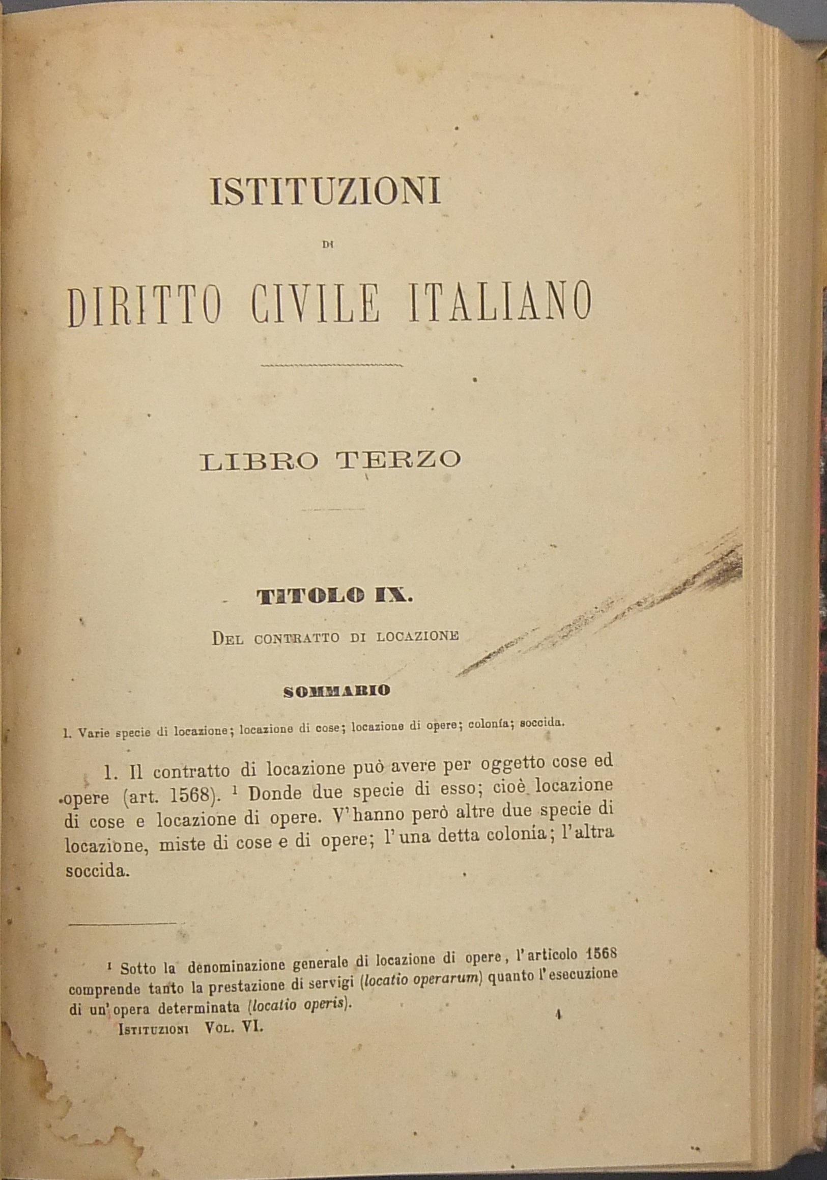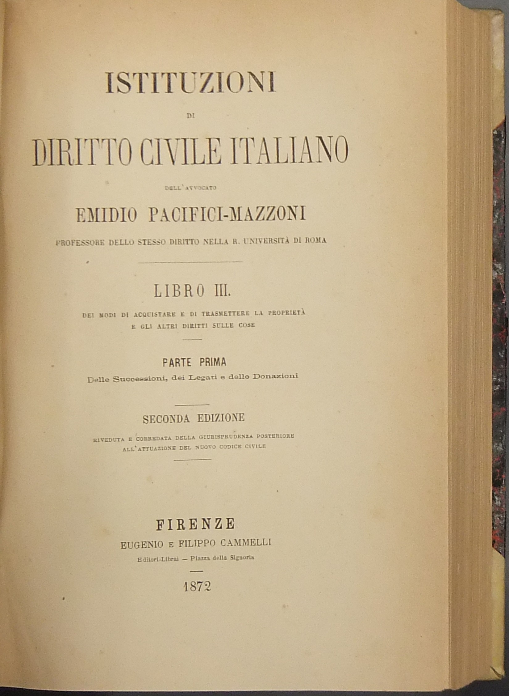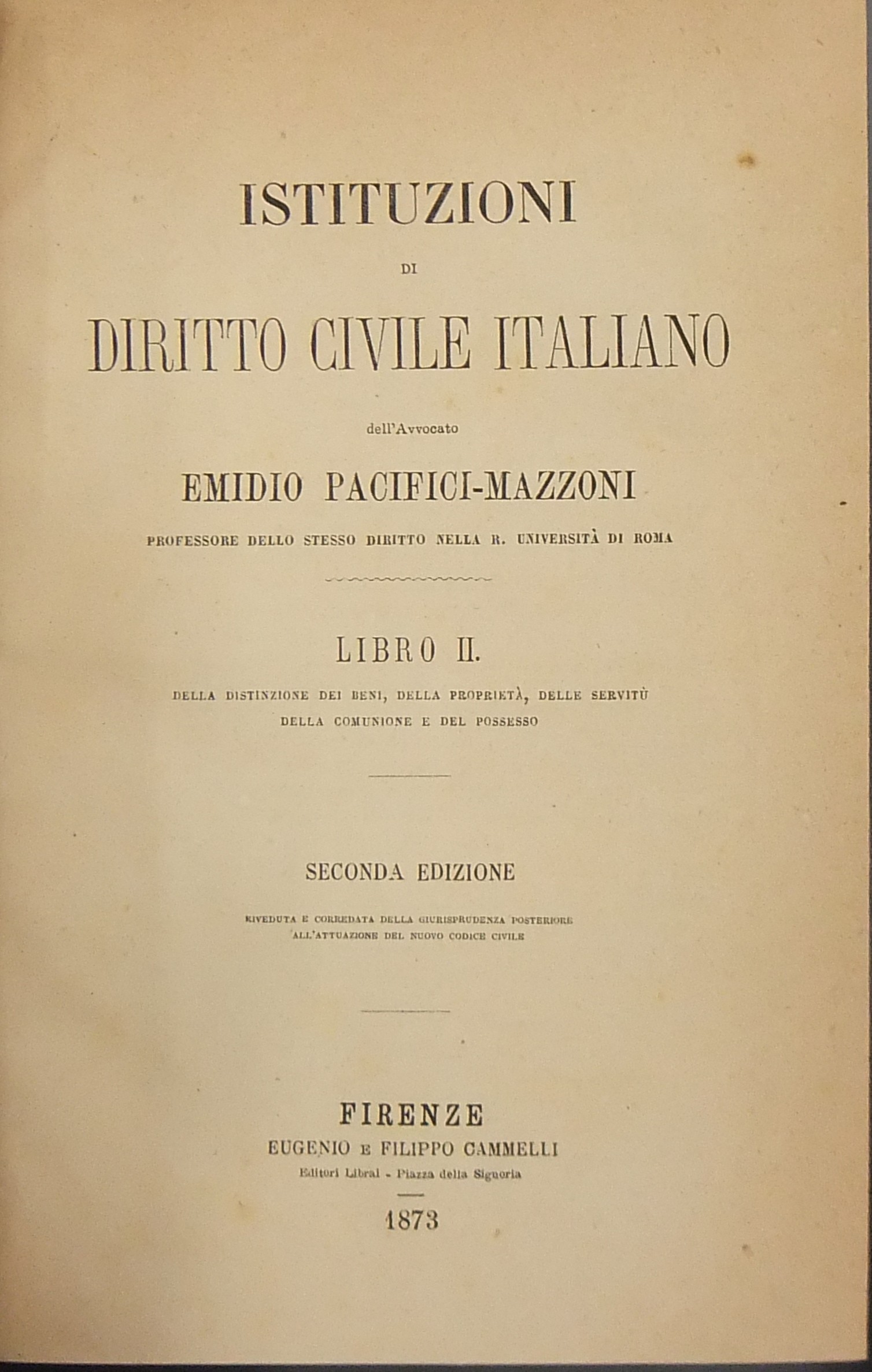 Istituzioni di diritto civile italiano. Parte generale del diritto, nozioni generali, classificazione, acquisto, estinzione, esercizio, conservazione, lesione e garanzia del diritto. Del diritto italiano. Del diritto o codice civile italiano. Delle leggi, nozioni generali, interpretazione e supplimento delle leggi, teorie della irretroattività delle leggi e del diritto internazionale privato, loro applicazione, sanzione o garantia delle leggi, abrogazione delle leggi