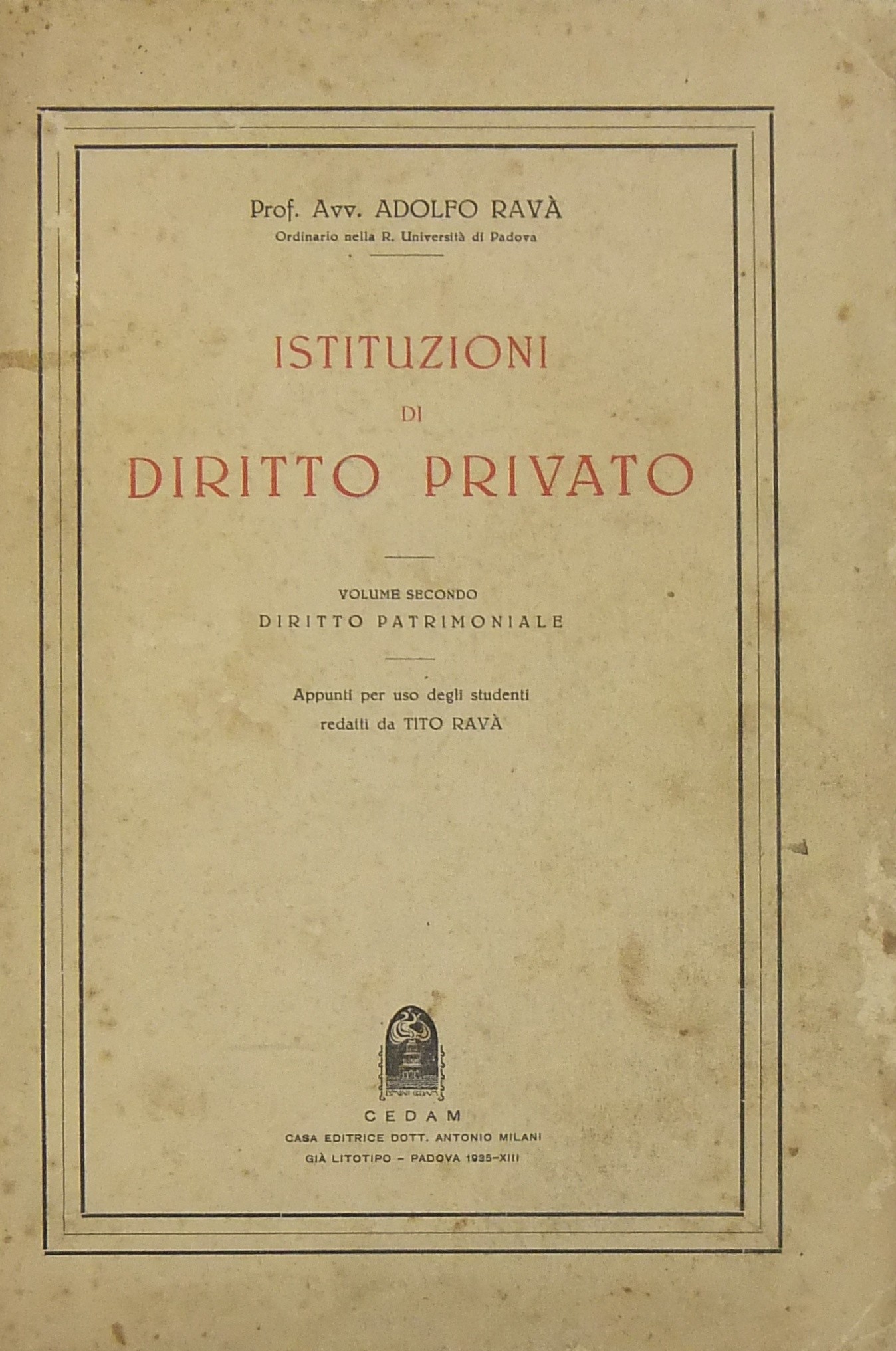 Istituzioni di diritto privato. Vol. I - Introduzione. Diritto delle persone. Vol. II - Diritto patrimoniale. Appunti per uso degli studenti redatti da Tito RavÃ