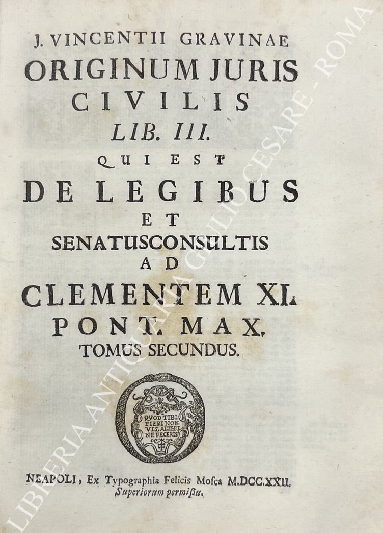 Frontespizio a caratteri neri e rossi marca tipografica testatine finalini capilettera ornati. L’Autore fu il primo dei giureconsulti italiani a porre in dubbio la validità delle tesi assolutistiche. Ancora prima del Montesquieu nel suo trattato mostra il proprio pensiero sul problema del diritto pubblico con una sottilissima analisi dell’evoluzione storica dell’ordinamento giuridico romano e con una profonda disquisizione sulle questioni relative alla sovranità. Con Gravina si comincia a vagheggiare l’ideale di un diritto di ragione e si vedono affermati quelli che saranno i postulati del nuovo diritto pubblico, la divisione dei poteri, il limite all’autorità statale e la tesi della inalienabilità della sovranità popolare che appartiene ai cittadini e che non può essere mai concessa al detentore del potere politico se non per un esercizio temporaneo e vincolato ad usarla per il bene di tutti. E’ questo l’inizio dell’Illuminismo giuridico