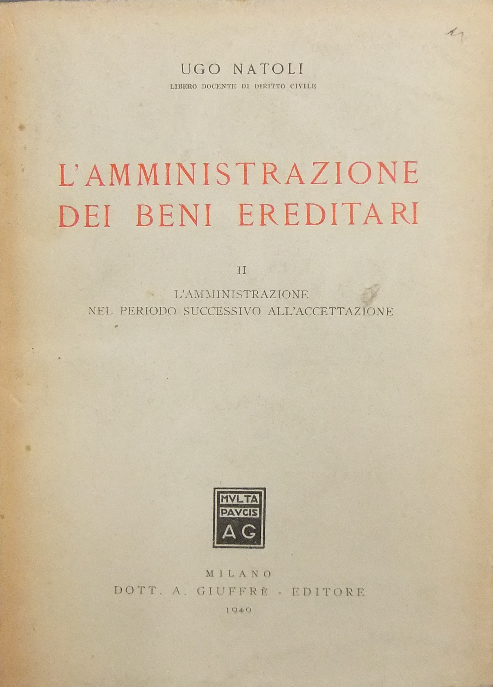 L'amministrazione dei beni ereditari. Vol. I - L'amministrazione durante il periodo antecedente all'accettazione. Vol. II - L'amministrazione nel periodo successivo all'accettazione