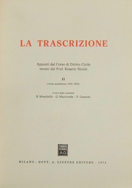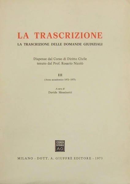 La trascrizione. Appunti dal Corso di Diritto Civile tenuto dal Prof. Rosario Nicolò. Vol. I - (Anno accademico 1971-1972). A cura degli assistenti R. Moschella e M. C. Andrini. Vol. II - (Anno accademico 1972-1973). A cura degli assistenti R. Moschella, G. Mariconda e F. Gazzoni. Vol. III - La trascrizione delle domande giudiziali. Dispense dal corso. (Anno accademico 1972-1973). A cura di Davide Messinetti
