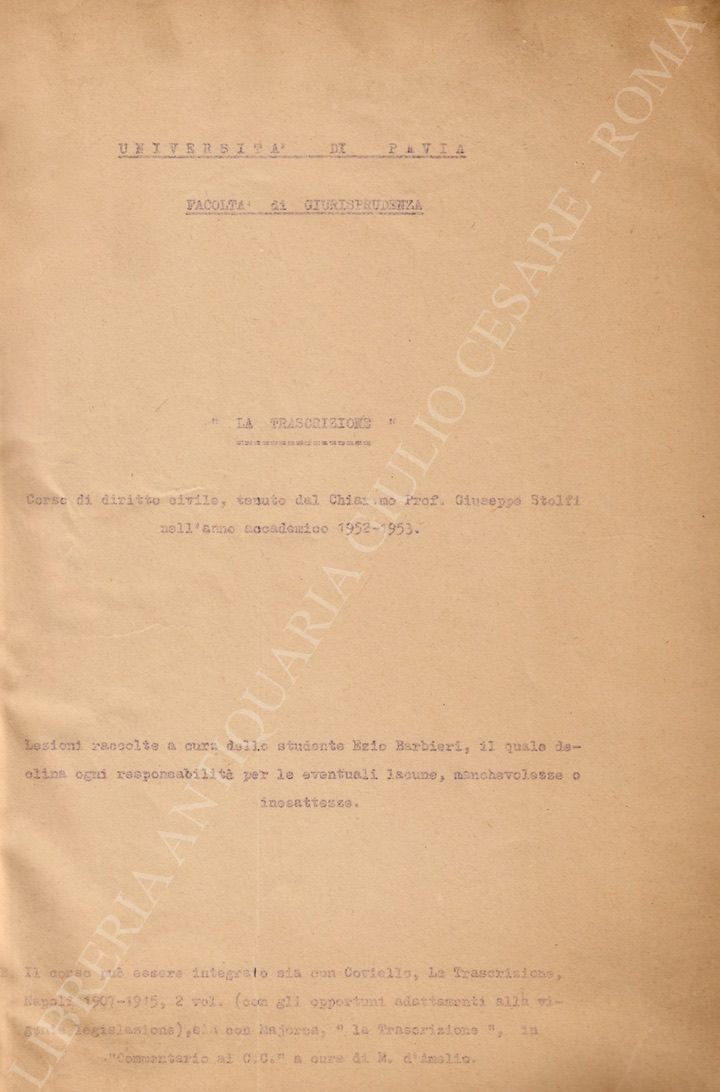 La trascrizione. Corso di diritto civile, tenuto dal Chiar.mo Prof. Giuseppe Stolfi nell'anno accademico 1952-1953. Lezioni raccolte a cura dello studente Ezio Barbieri