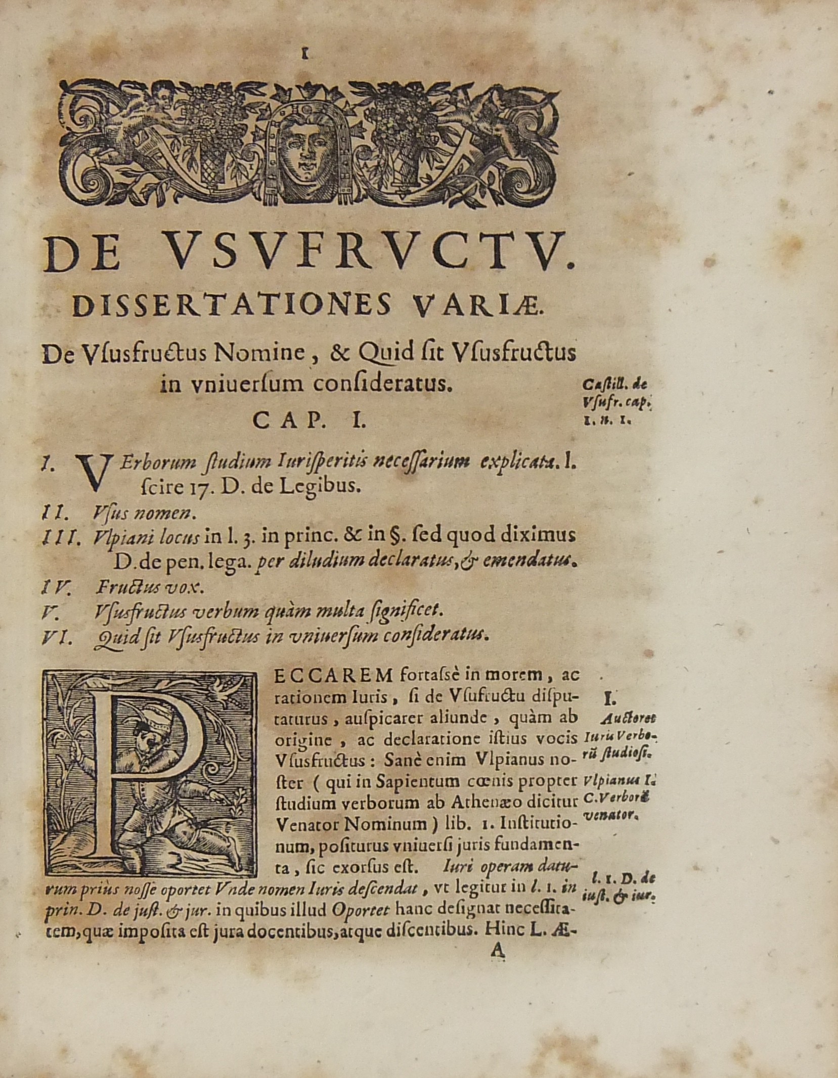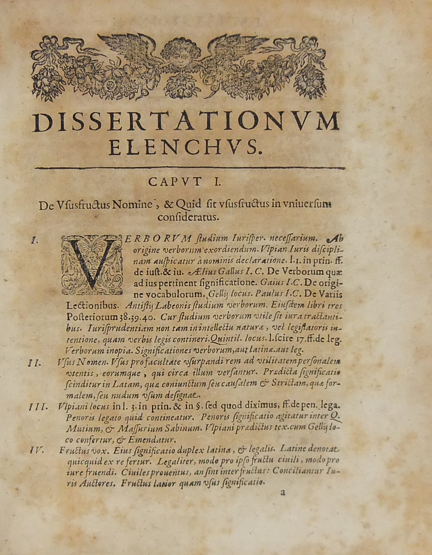 De usufructu dissertationes variae. Tractatibus nonnullis per occasionem intercisae, ac potissimum. De Iure Nat. Gen. et Civ. De Iure Familiae. De Iure Testamentorum. De Usucapionibus et Longi Temporis Praescriptionibus. Exaequatione Legatorum et Fideicommissorum. De Pollicitationibus. De Pactis Nudis. De Contractibus. De Dotis substantiae. De Dominio. De Possessione. Et quod Leges Codicis non corrigant leges Digestorum. Quibus Justinianicum Jus partim ad Antiqua Principia cum Romanae tum Atticae Sapientiae revocatur partim multiplici usa Veterum Historiarum illustratur