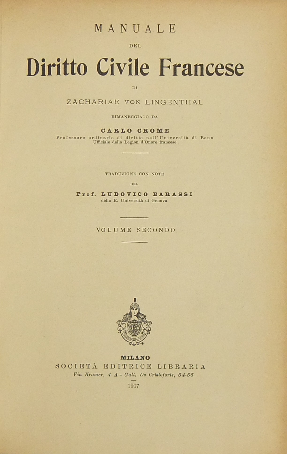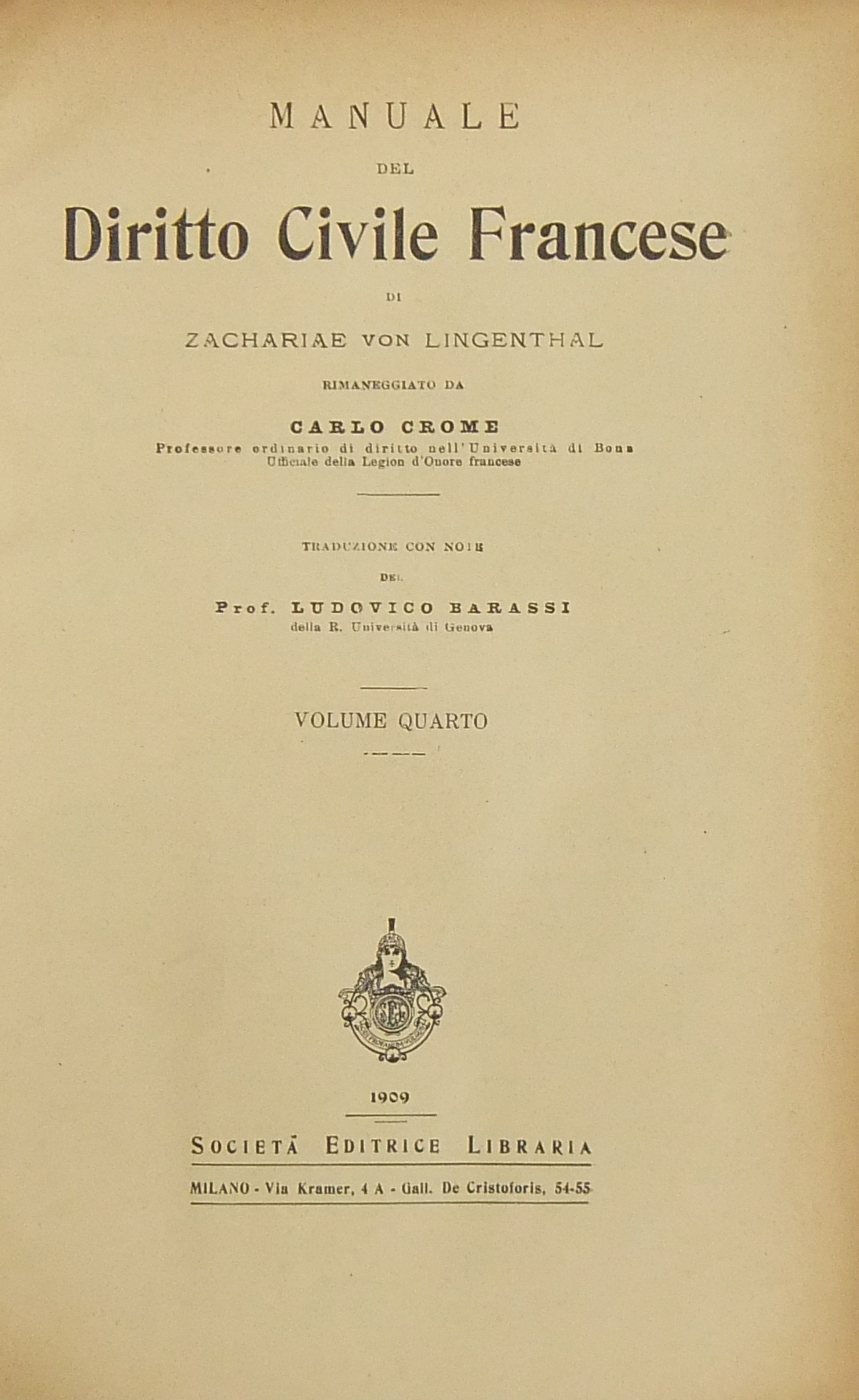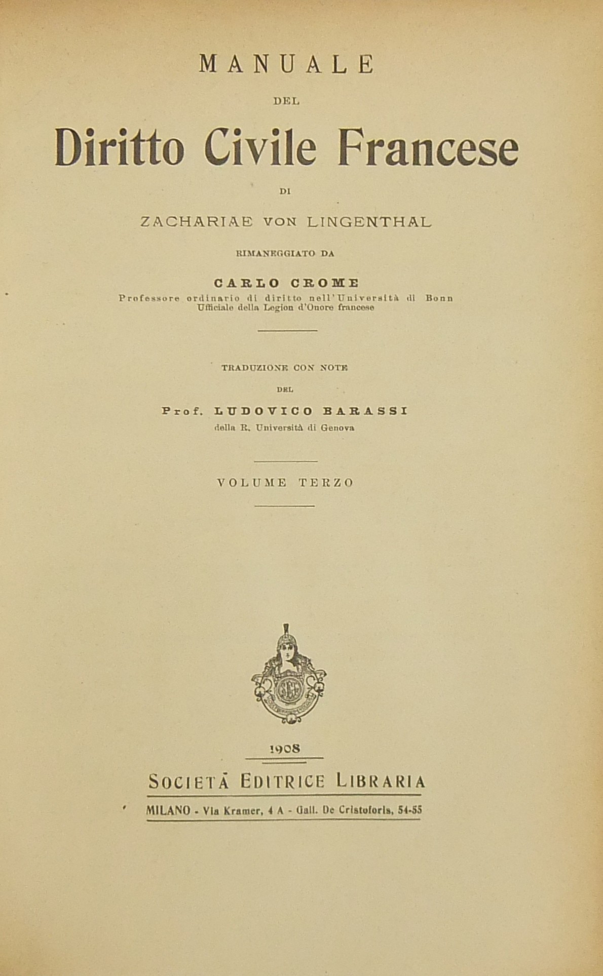 Manuale del diritto civile francese di Zachariae Von Lingenthal rimaneggiato da Carlo Crome. Traduzione con note del Prof. Ludovico Barassi