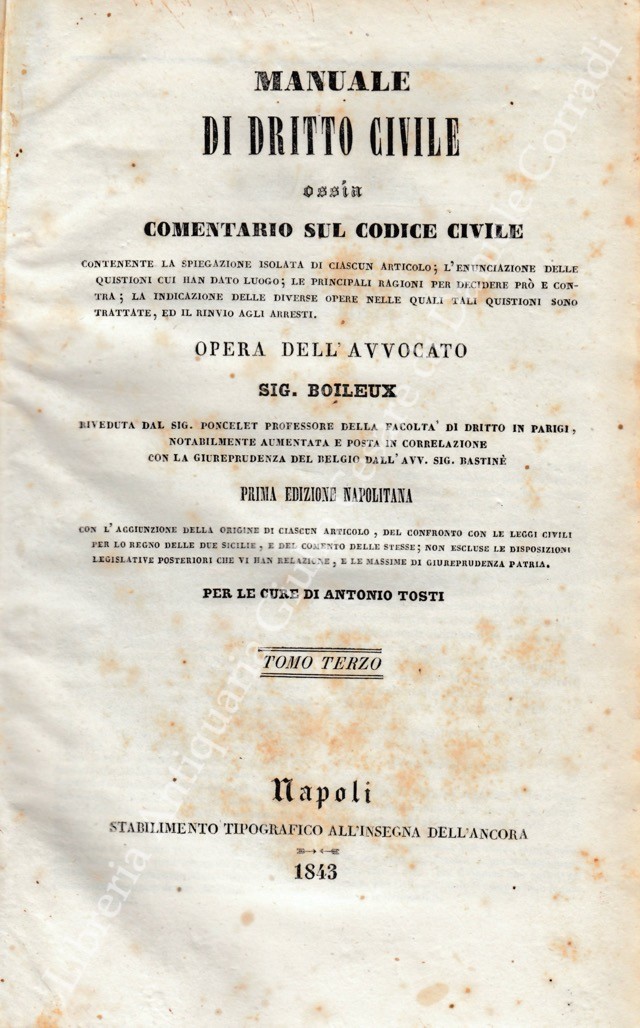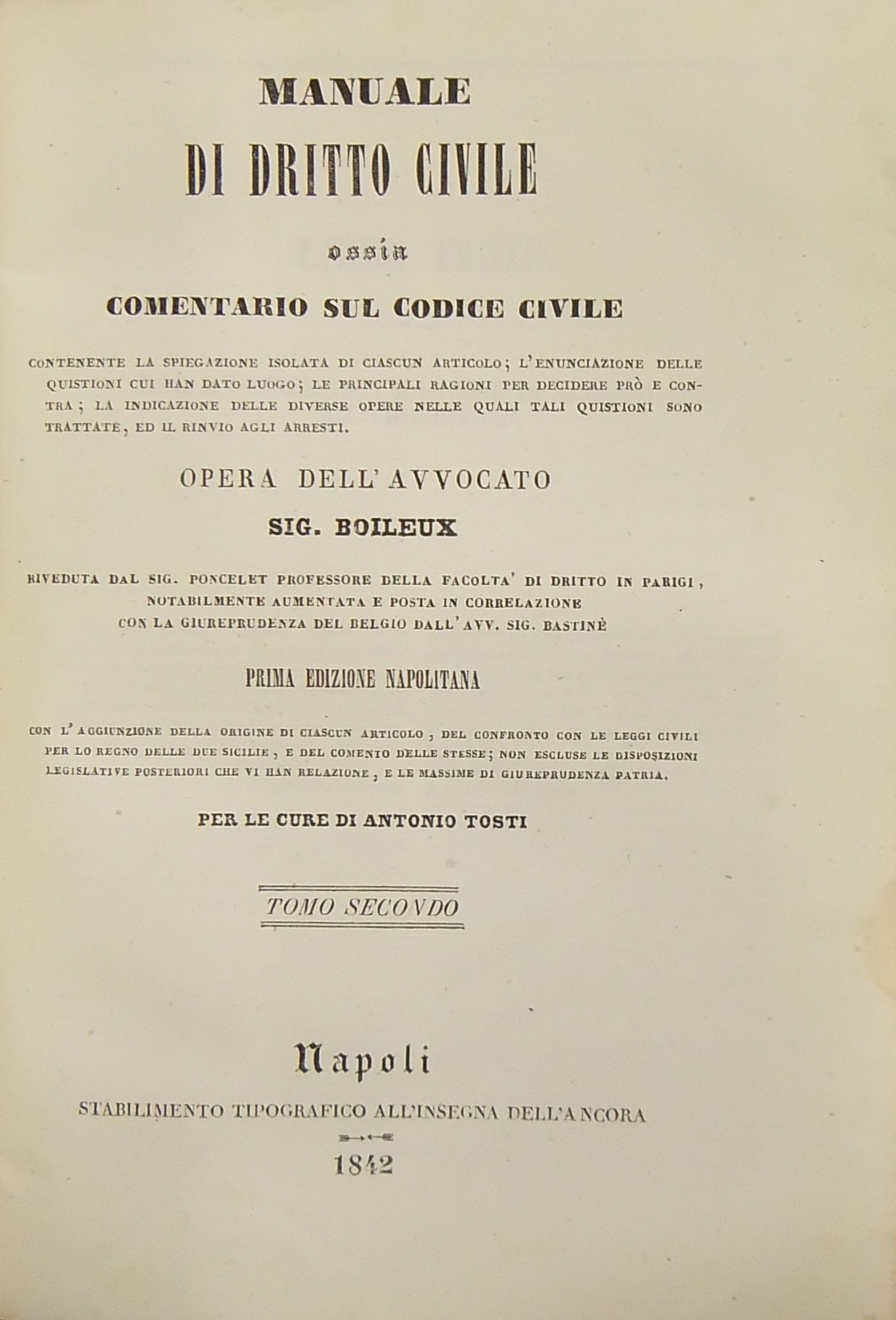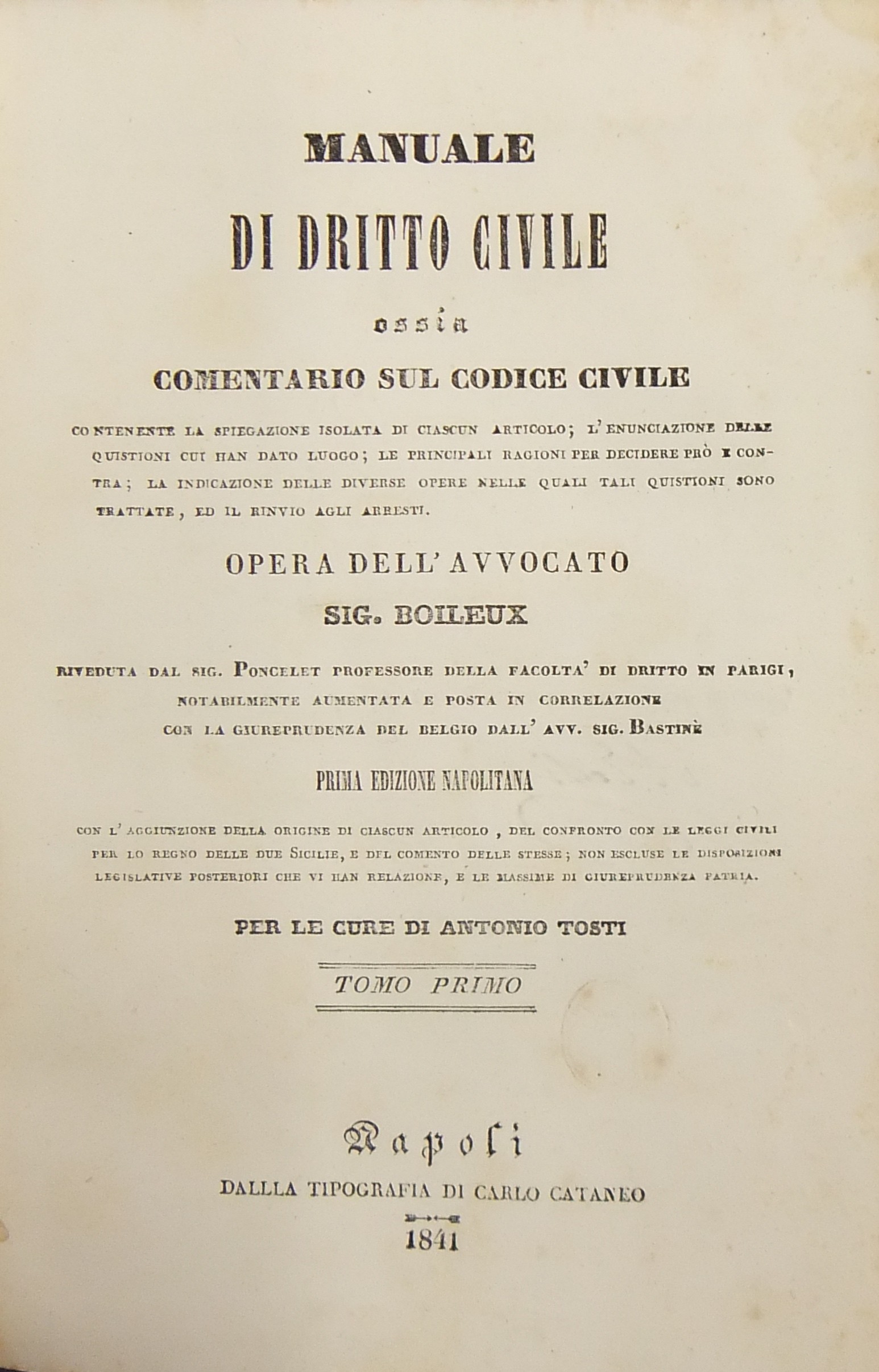 Manuale di diritto civile ossia comentario sul codice civile. Contenente la spiegazione isolata di ciascun articolo l'enunciazione delle quistioni cui han dato luogo le principali ragioni per decidere prò e contra la indicazione delle diverse opere nelle quali tali quistioni sono trattate ed il rinvio agli arresti. Opera riveduta dal Sig. Poncelet notabilmente aumentata e posta in correlazione con la giurisprudenza del Belgio dall'Avv. Bastinè. Prima edizione napolitana con l'aggiunzione della origine di ciascun articolo del confronto con le leggi civili per lo Regno delle Due Sicilie e dal comento delle stesse non escluse le disposizioni legislative posteriori che vi han relazione e le massime di giurisprudenza patria. Per le cure di Antonio Tosti