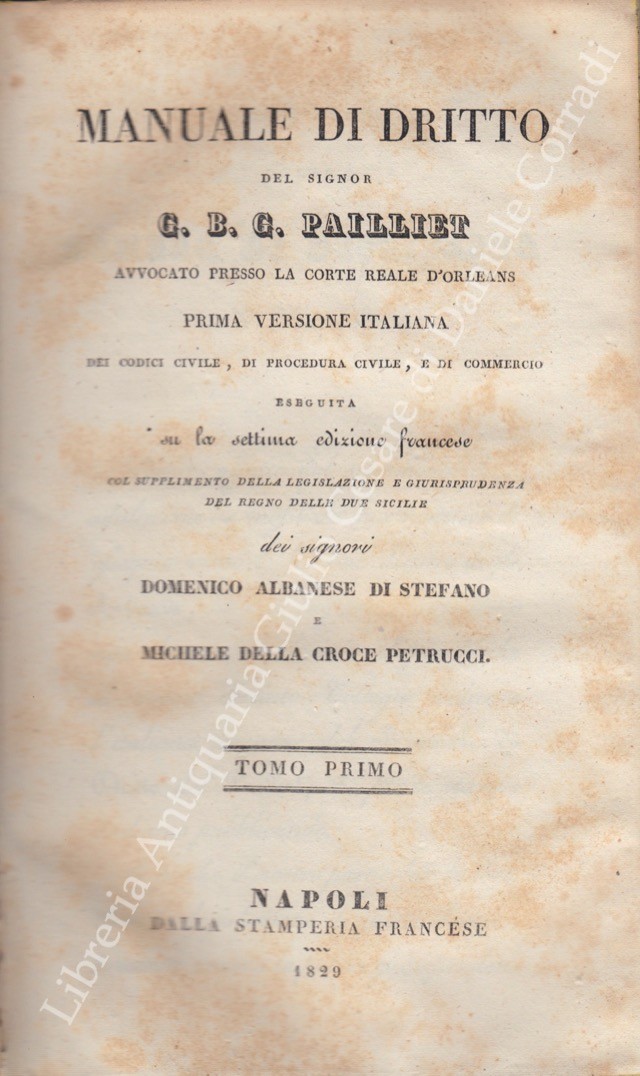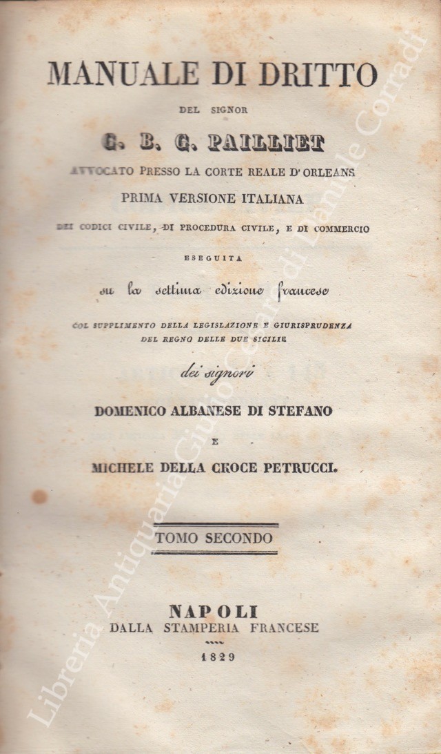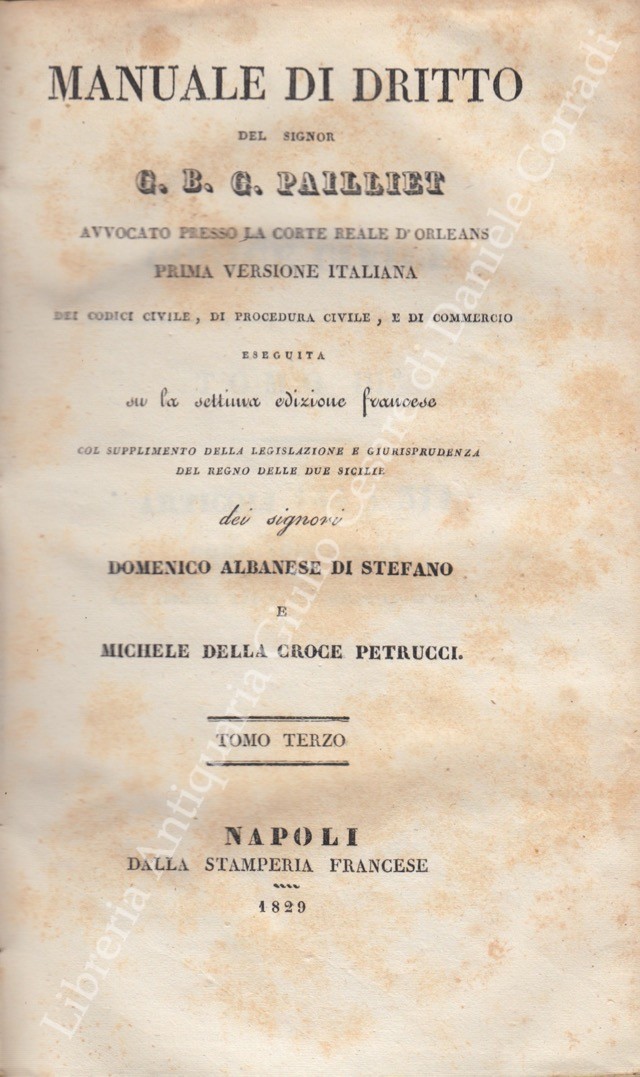 Manuale di dritto. Prima versione italiana dei Codici civile, di procedura civile e di commercio eseguita su la settima edizione francese. Col supplimento della legislazione e giurisprudenza del Regno delle Due Sicilie dei signori Domenico Albanese di Stefano e Michele della Croce Petrucci