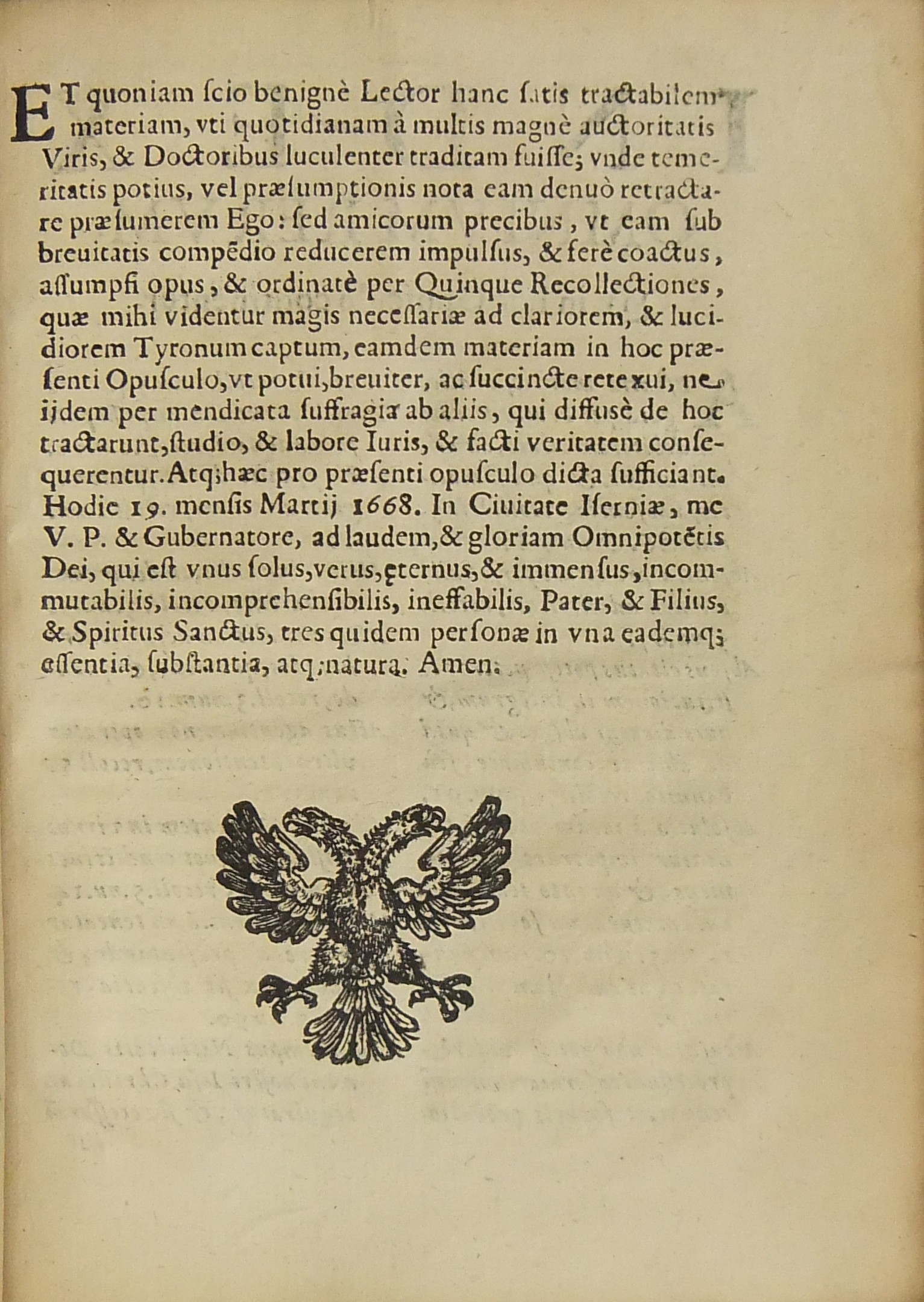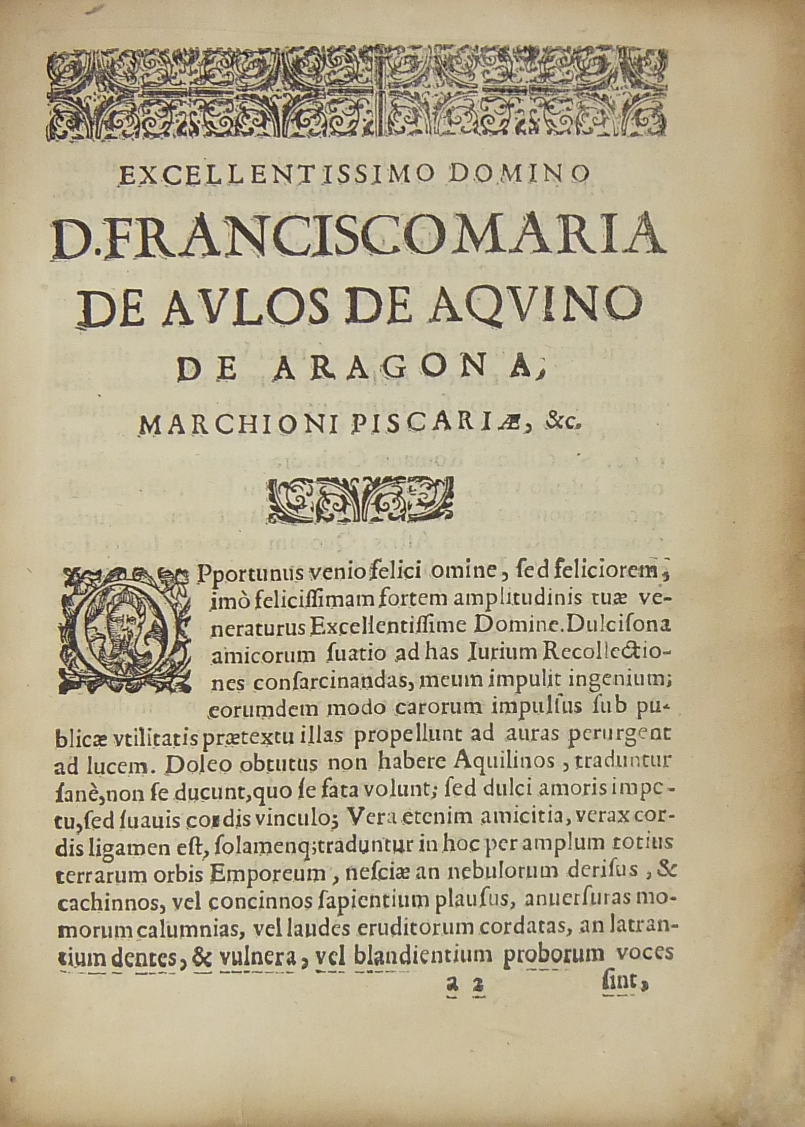 Pregevole marca tipografica al frontespizio raffigurante un leone rampante su uno scoglio che sorregge una bandiera crociata, attraversato da banda con tre stelle